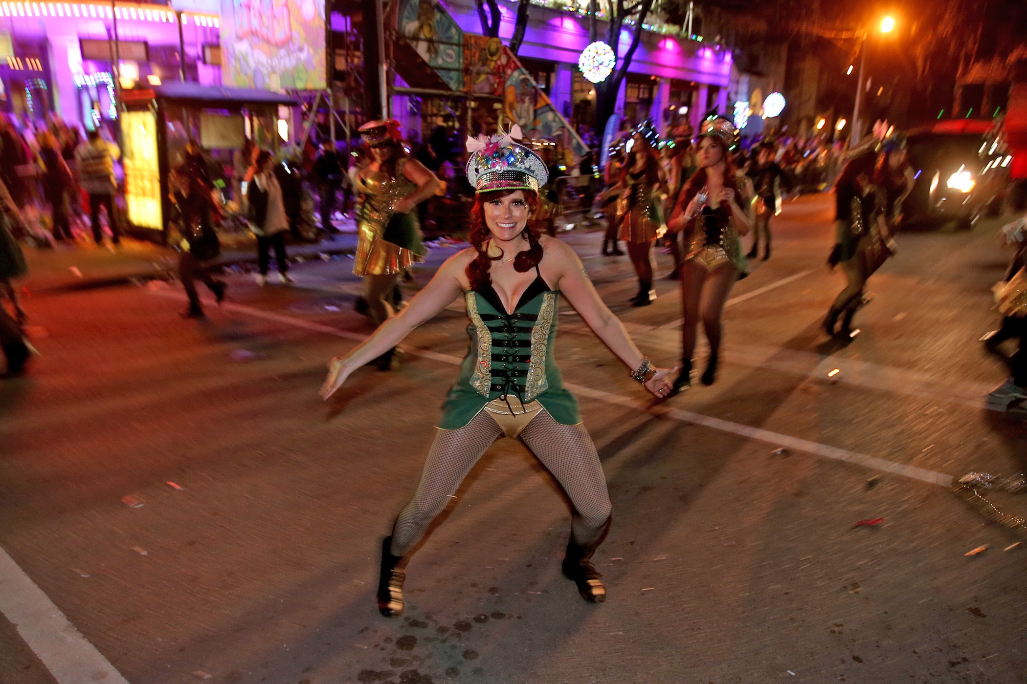 The N’Awlins Nymphs dance as the 540-plus members of Le Krewe D’Etat roll down the Uptown parade route with a satirical 24-float parade with the theme “The DIC Goes to Mardi Gras” as they celebrate their 24th year on Friday, February 21, 2020. (Photo by Michael DeMocker)
