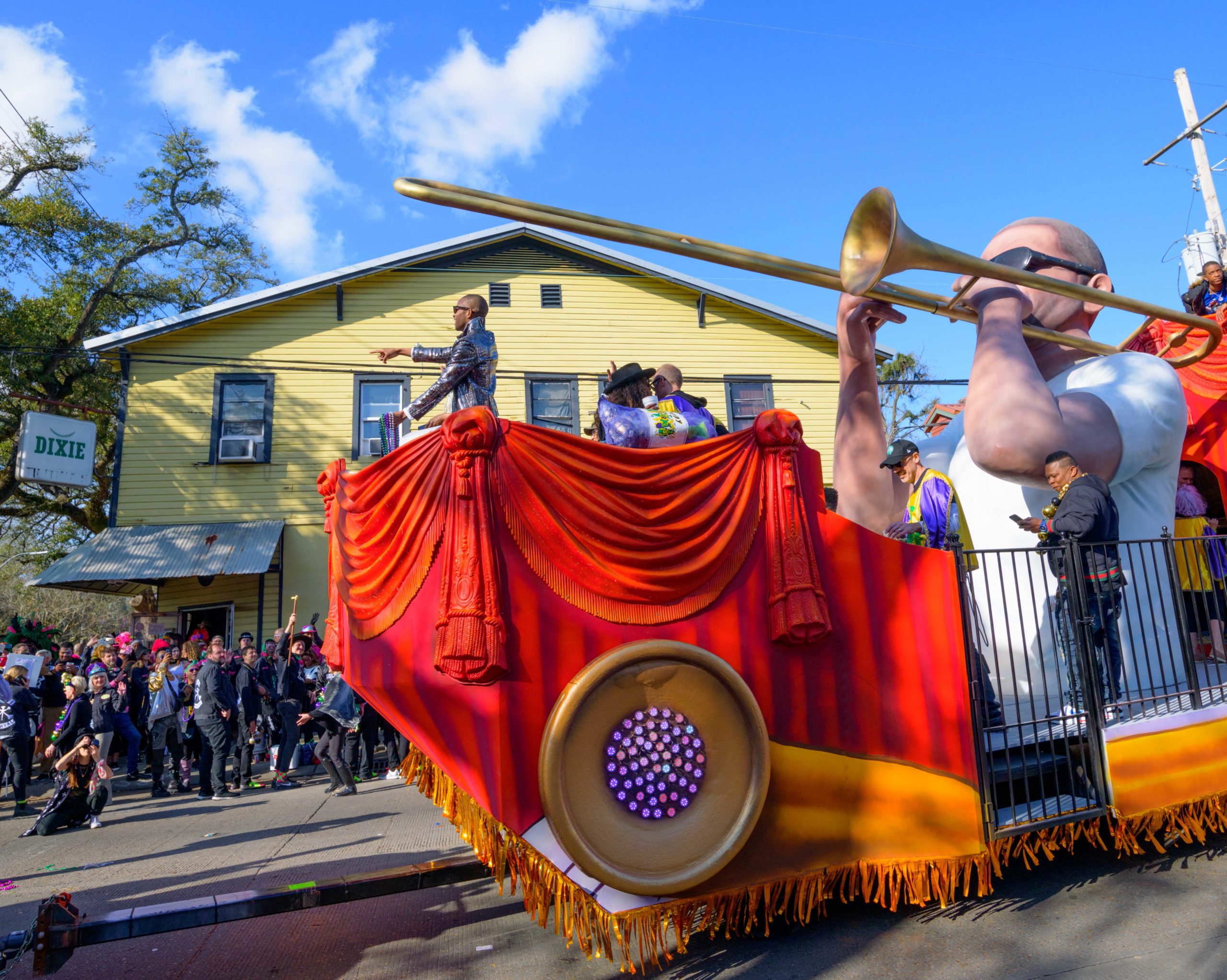Saturday’s early Uptown parades where highlighted by the Krewe of Freret with the theme “The Music of New Orleans” including a giant “Shorty Gras” float modeled after Troy “Trombone Shorty” Andrews.\