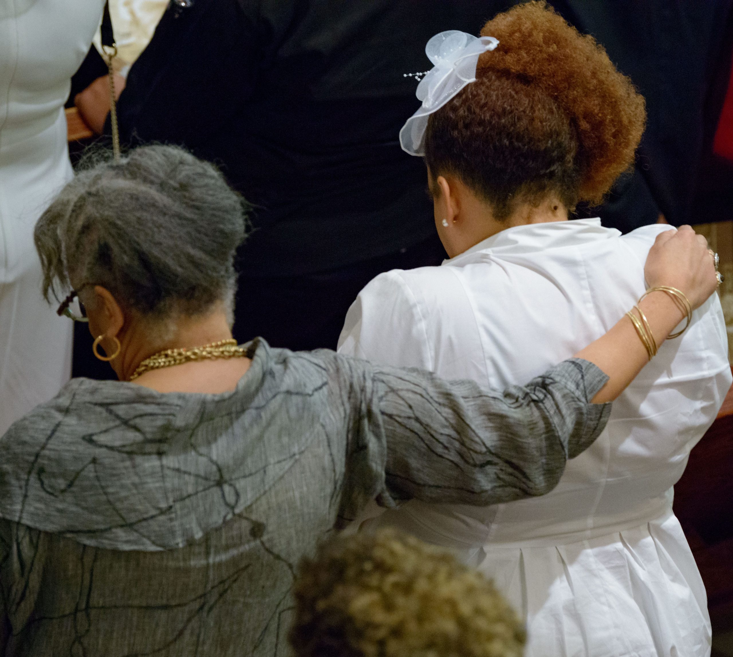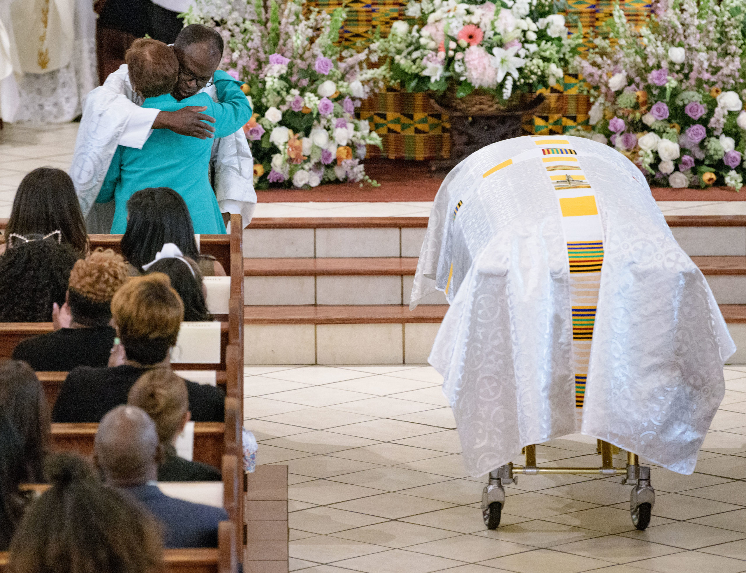 St. Peter Claver Catholic Church Rev. John Asare-Dankwah hugs Stella Chase, the daughter of Chef Leah Chase, next to the casket containing her body during a funeral mass in the Treme neighborhood in New Orleans, La. Monday, June 10, 2019. The Queen of Creole Cuisine at Dooky Chase’s Restaurant passed away last Saturday June 1st at the age of 96. Born on January 6, 1923 she later served two U.S. presidents and also Freedom Riders during the Civil Rights era. The restaurant she ran with her husband, Dooky Chase, Jr., served as a meeting place for African-American politicians for decades. Photo by Matthew Hinton