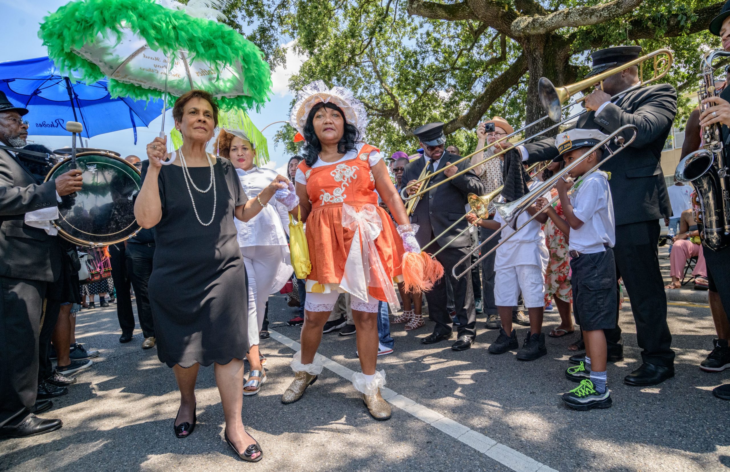 Stella Chase, the daughter of Chef Leah Chase, walks with Baby Doll Carol ‘Kit’ Harris during a jazz funeral procession to Dooky Chase’s Restaurant in the Treme neighborhood in New Orleans, La. Monday, June 10, 2019. Playing trombone next them are Alvin Coco, a 7-year-old, and band leader Big Sam Williams. The Queen of Creole Cuisine at Dooky Chase’s Restaurant passed away last Saturday June 1st at the age of 96. Born on January 6, 1923 she later served two U.S. presidents and also Freedom Riders during the Civil Rights era. The restaurant she ran with her husband, Dooky Chase, Jr., served as a meeting place for African-American politicians for decades. Photo by Matthew Hinton
