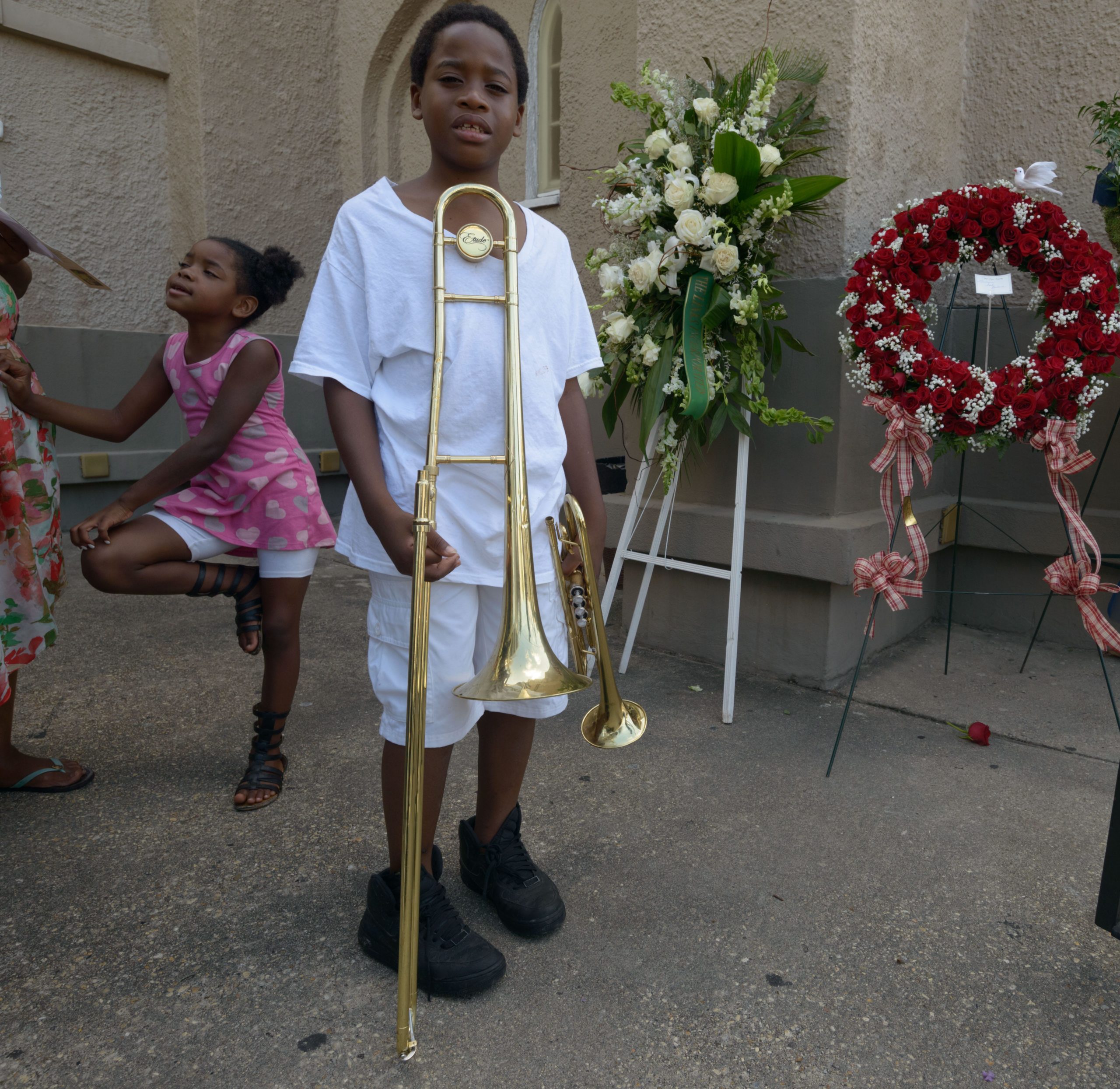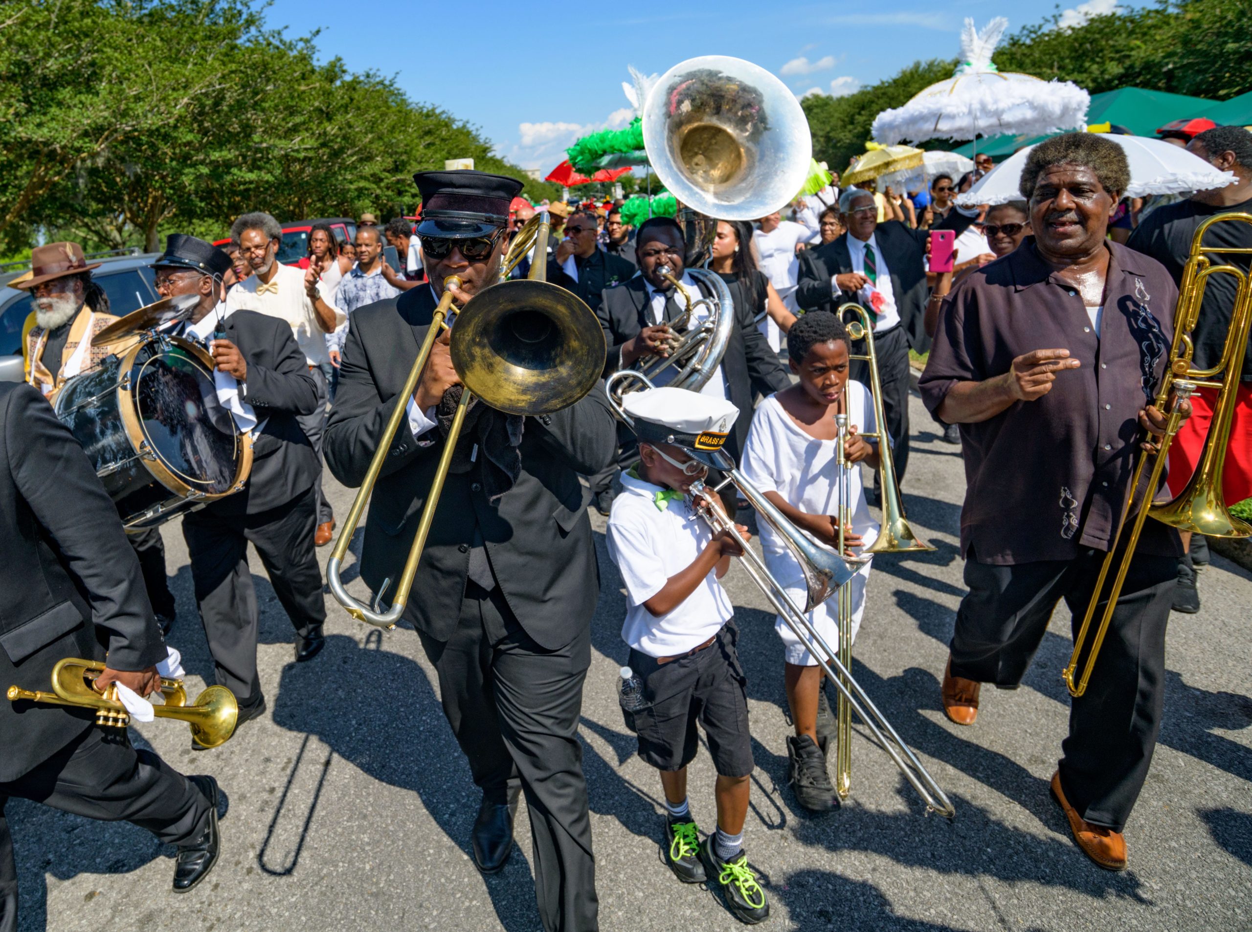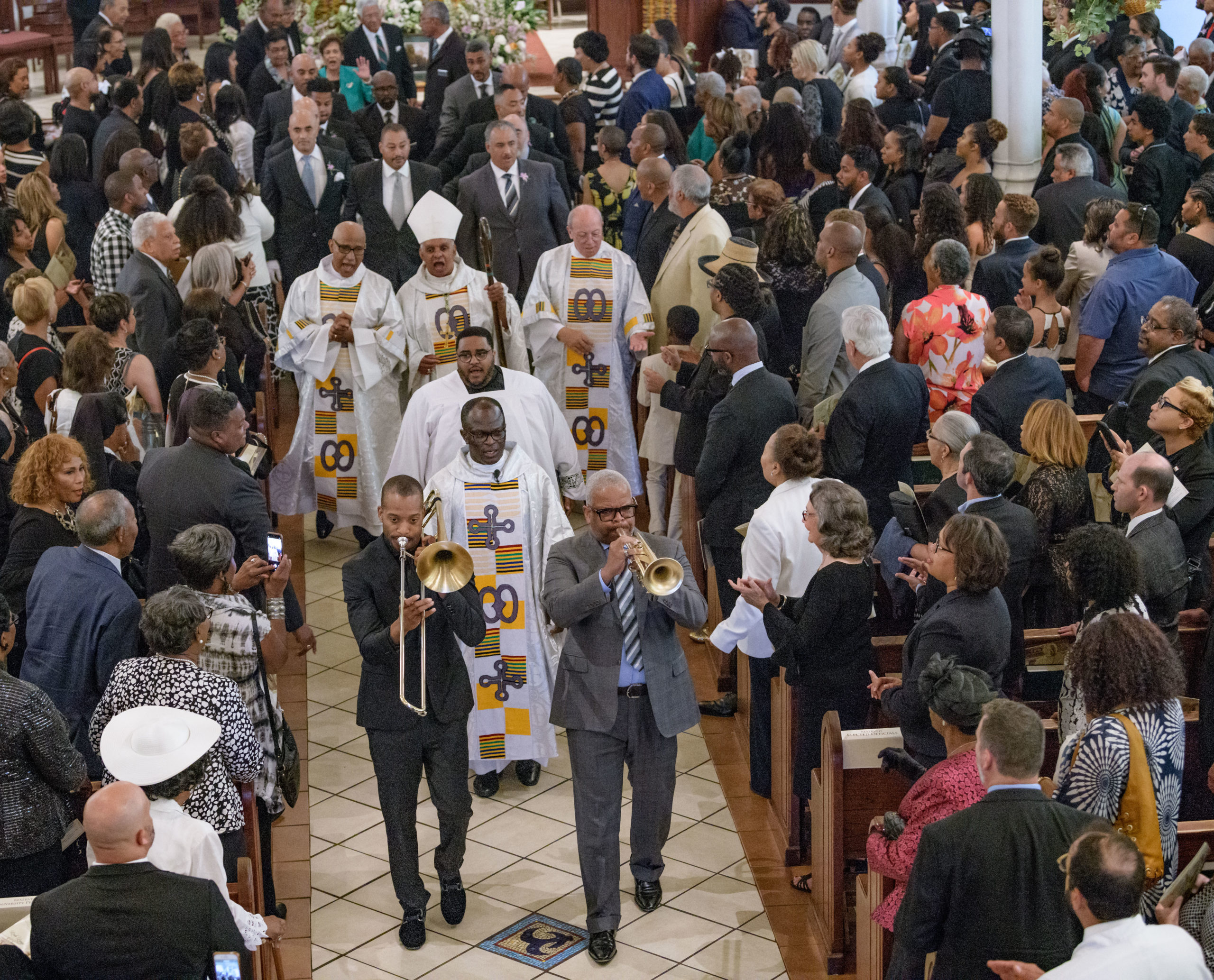 Troy ‘Trombone Shorty’ Andrews and Oscar-nominated and Grammy-winning composer and musician Terence Blancherd lead a funeral procession for Chef Leah Chase at St. Peter Claver Catholic Church at the end of a funeral mass in the Treme neighborhood in New Orleans, La. Monday, June 10, 2019. The Queen of Creole Cuisine at Dooky Chase’s Restaurant passed away last Saturday June 1st at the age of 96. Born on January 6, 1923 she later served two U.S. presidents and also Freedom Riders during the Civil Rights era. The restaurant she ran with her husband, Dooky Chase, Jr., served as a meeting place for African-American politicians for decades. Photo by Matthew Hinton