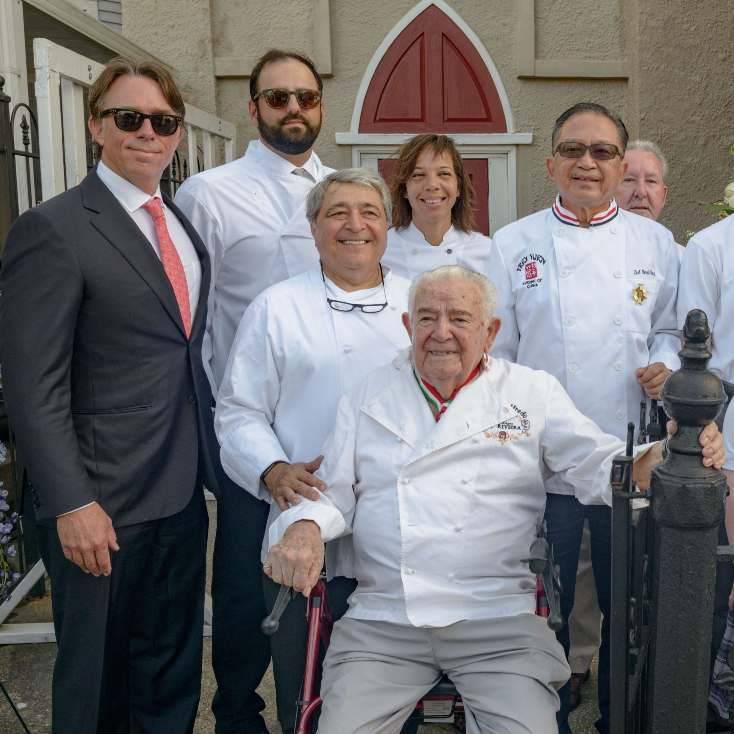 James Beard Award Winners Chef John Besh, left, Chef Alon Shaya, and Chef Nina Compton; stand with Chef Andrea Apuzzo Chef Frank Wong, and Chef Goffredo Fraccaro before a funeral mass for Chef Leah Chase in the Treme neighborhood in New Orleans, La. Monday, June 10, 2019. The Queen of Creole Cuisine at Dooky Chase’s Restaurant passed away last Saturday June 1st at the age of 96. Born on January 6, 1923 she later served two U.S. presidents and also Freedom Riders during the Civil Rights era. The restaurant she ran with her husband, Dooky Chase, Jr., served as a meeting place for African-American politicians for decades. Photo by Matthew Hinton
