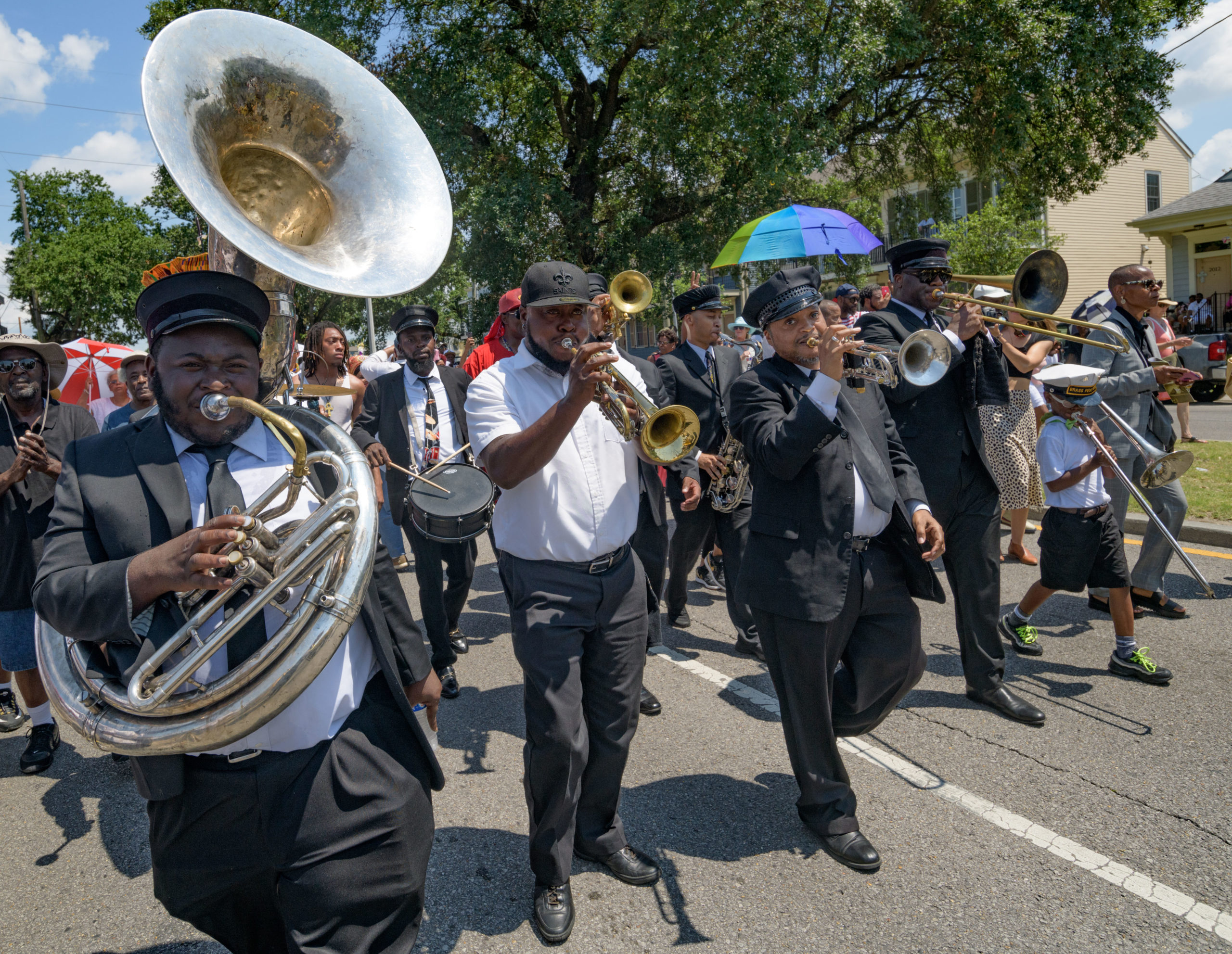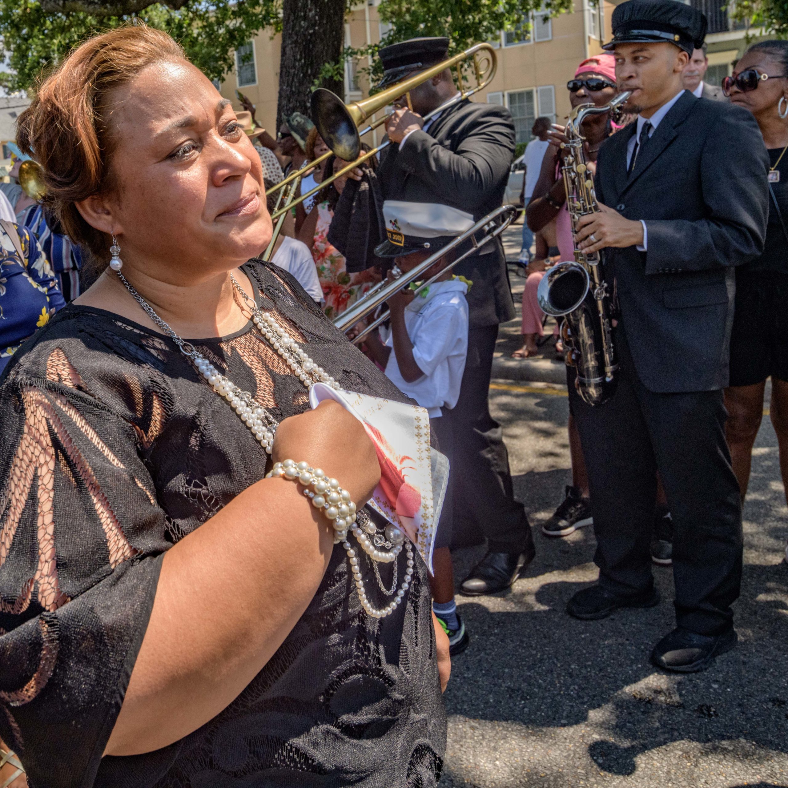 Musicians play during a jazz funeral after a funeral mass for Chef Leah Chase at St. Peter Claver Catholic Church in the Treme neighborhood in New Orleans, La. Monday, June 10, 2019. The Queen of Creole Cuisine at Dooky Chase’s Restaurant passed away last Saturday June 1st at the age of 96. Born on January 6, 1923 she later served two U.S. presidents and also Freedom Riders during the Civil Rights era. The restaurant she ran with her husband, Dooky Chase, Jr., served as a meeting place for African-American politicians for decades. Photo by Matthew Hinton