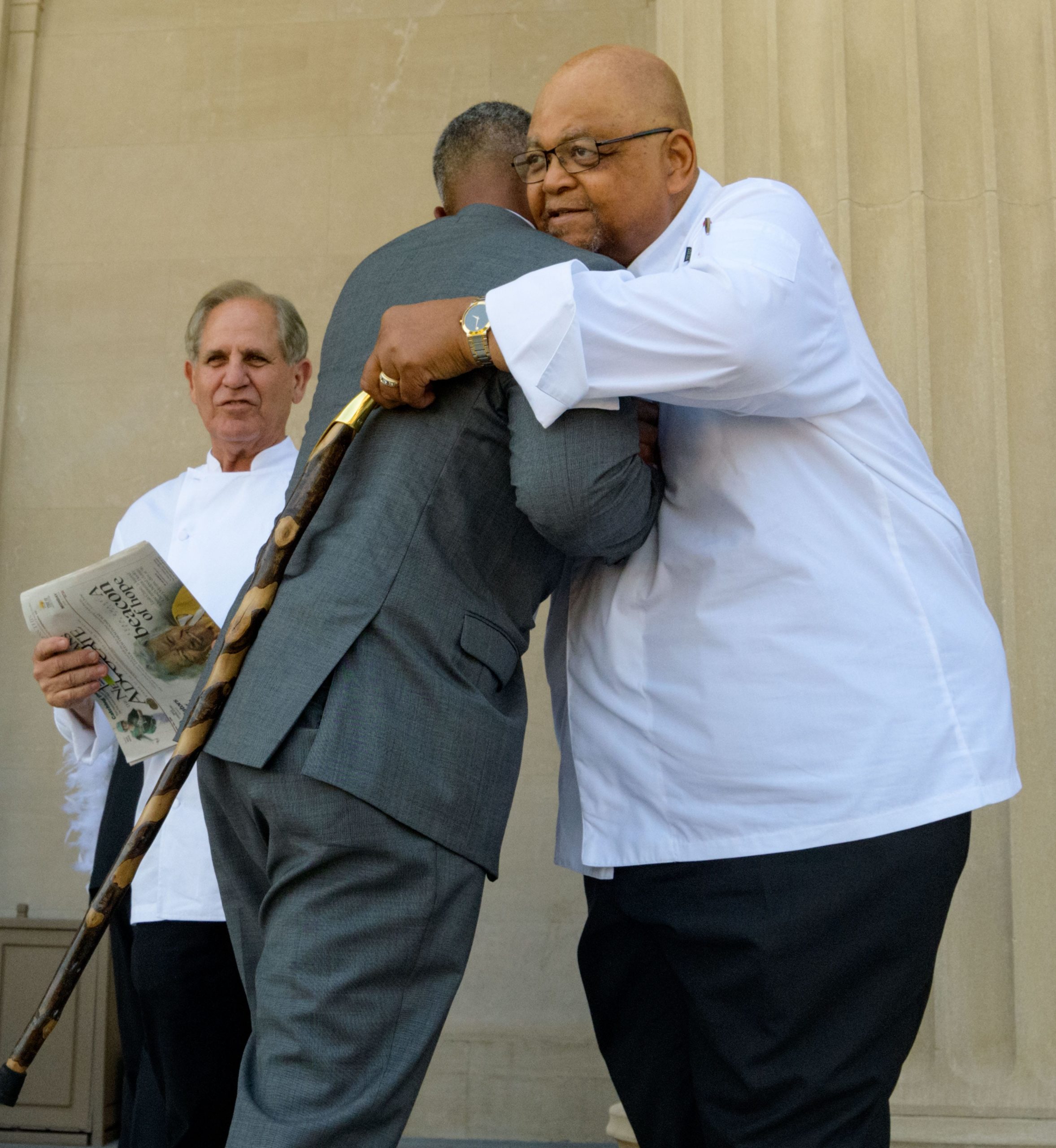 Chef Joe Randall of Savannah, Georgia, hugs Edgar ‘Dooky’ Chase, IV, the grandson of Leah Chase, next to Chef John Folse, a leading expert of Cajun and Creole cuisine after a second line at City Park in New Orleans, La. Monday, June 10, 2019. The Queen of Creole Cuisine at Dooky Chase’s Restaurant passed away last Saturday June 1st at the age of 96. Born on January 6, 1923 she later served two U.S. presidents and also Freedom Riders during the Civil Rights era. The restaurant she ran with her husband, Dooky Chase, Jr., served as a meeting place for African-American politicians for decades. Photo by Matthew Hinton