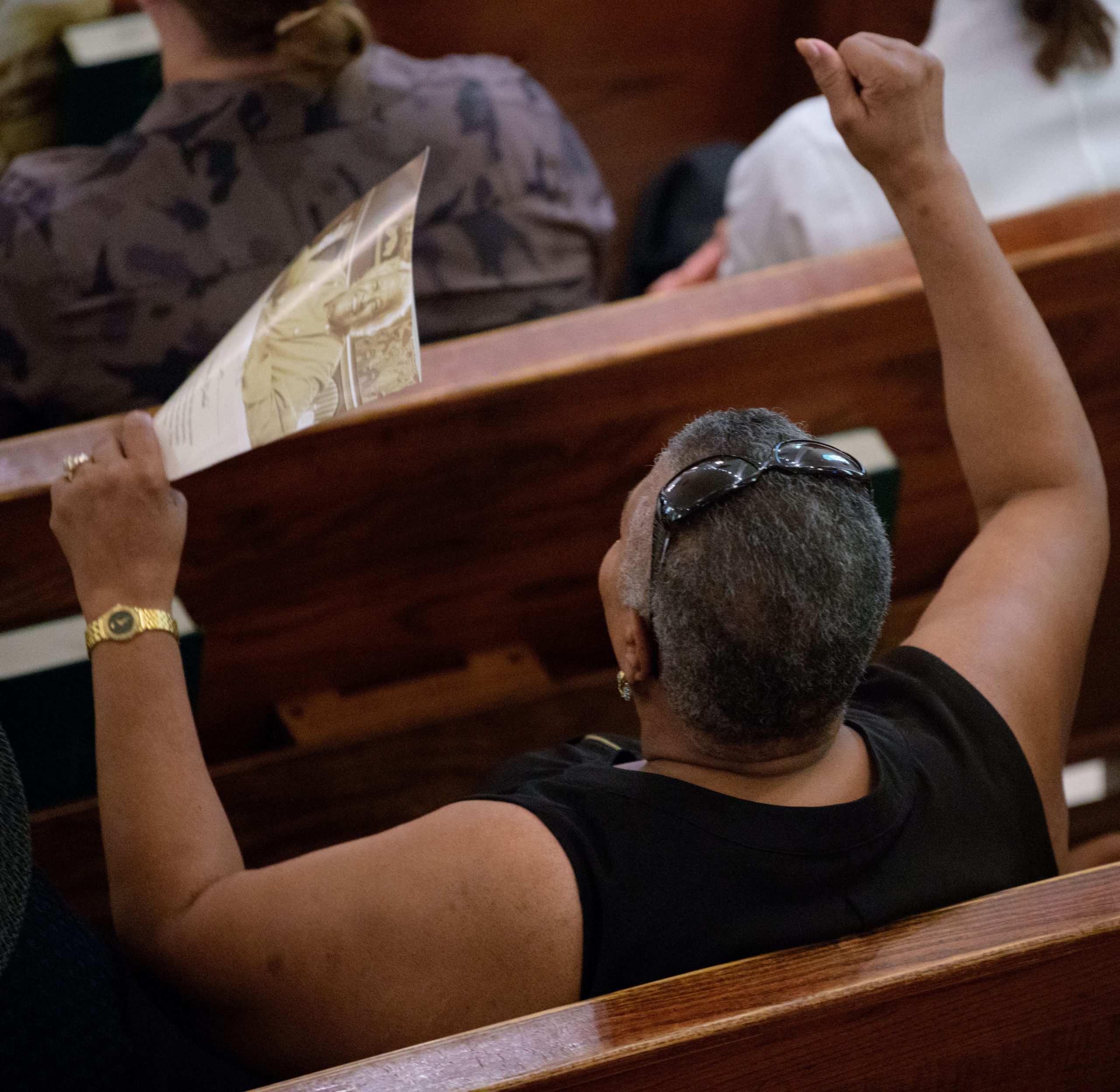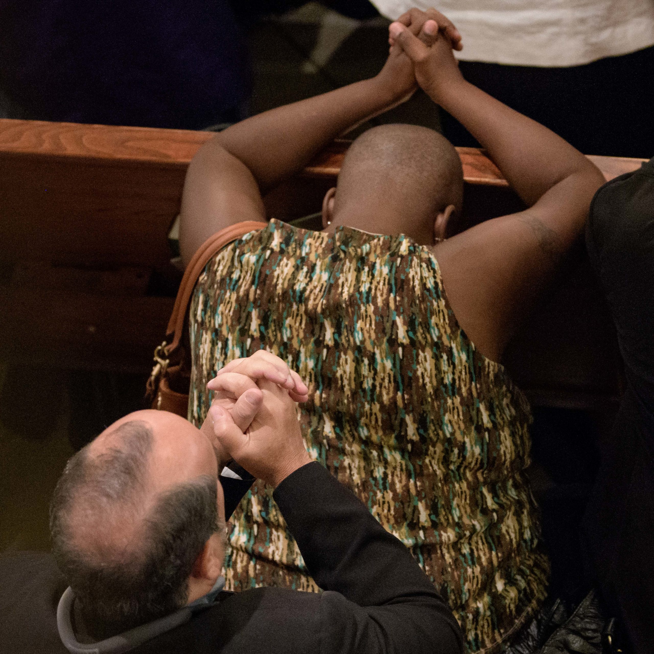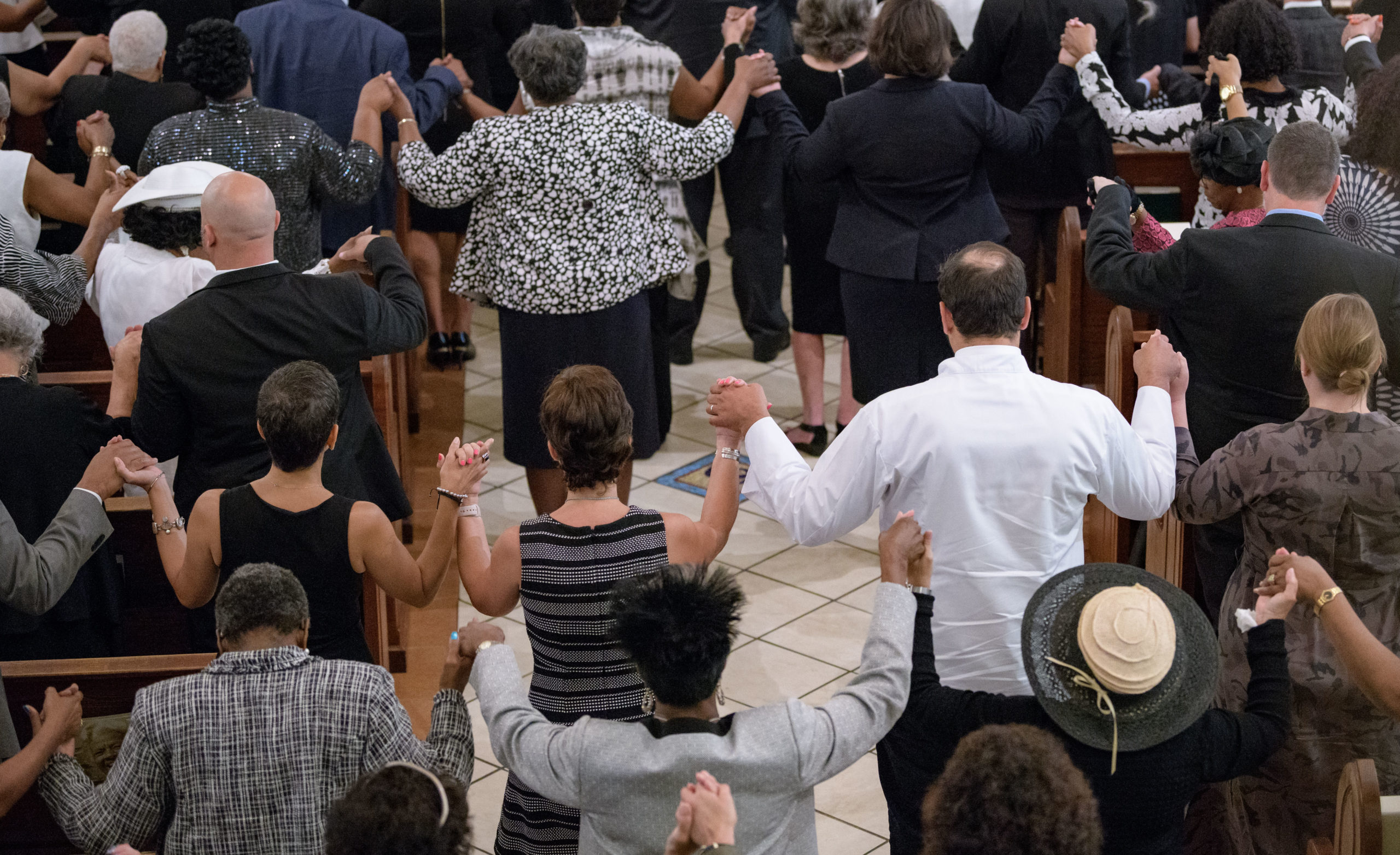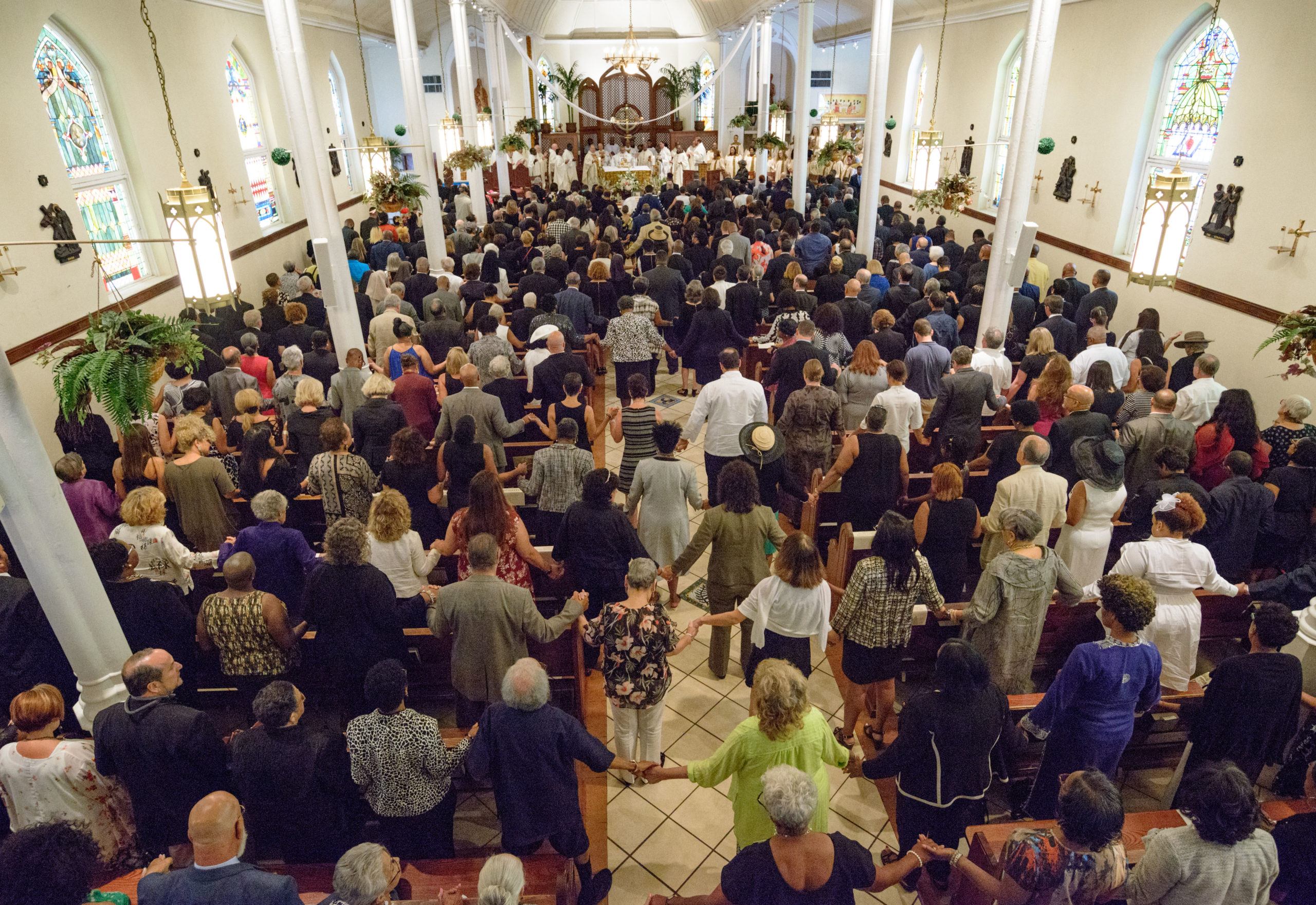 People including Chef Alon Shaya join hands during a funeral mass for Chef Leah Chase at St. Peter Claver Catholic Church at the end of a funeral mass in the Treme neighborhood in New Orleans, La. Monday, June 10, 2019. The Queen of Creole Cuisine at Dooky Chase’s Restaurant passed away last Saturday June 1st at the age of 96. Born on January 6, 1923 she later served two U.S. presidents and also Freedom Riders during the Civil Rights era. The restaurant she ran with her husband, Dooky Chase, Jr., served as a meeting place for African-American politicians for decades. Photo by Matthew Hinton