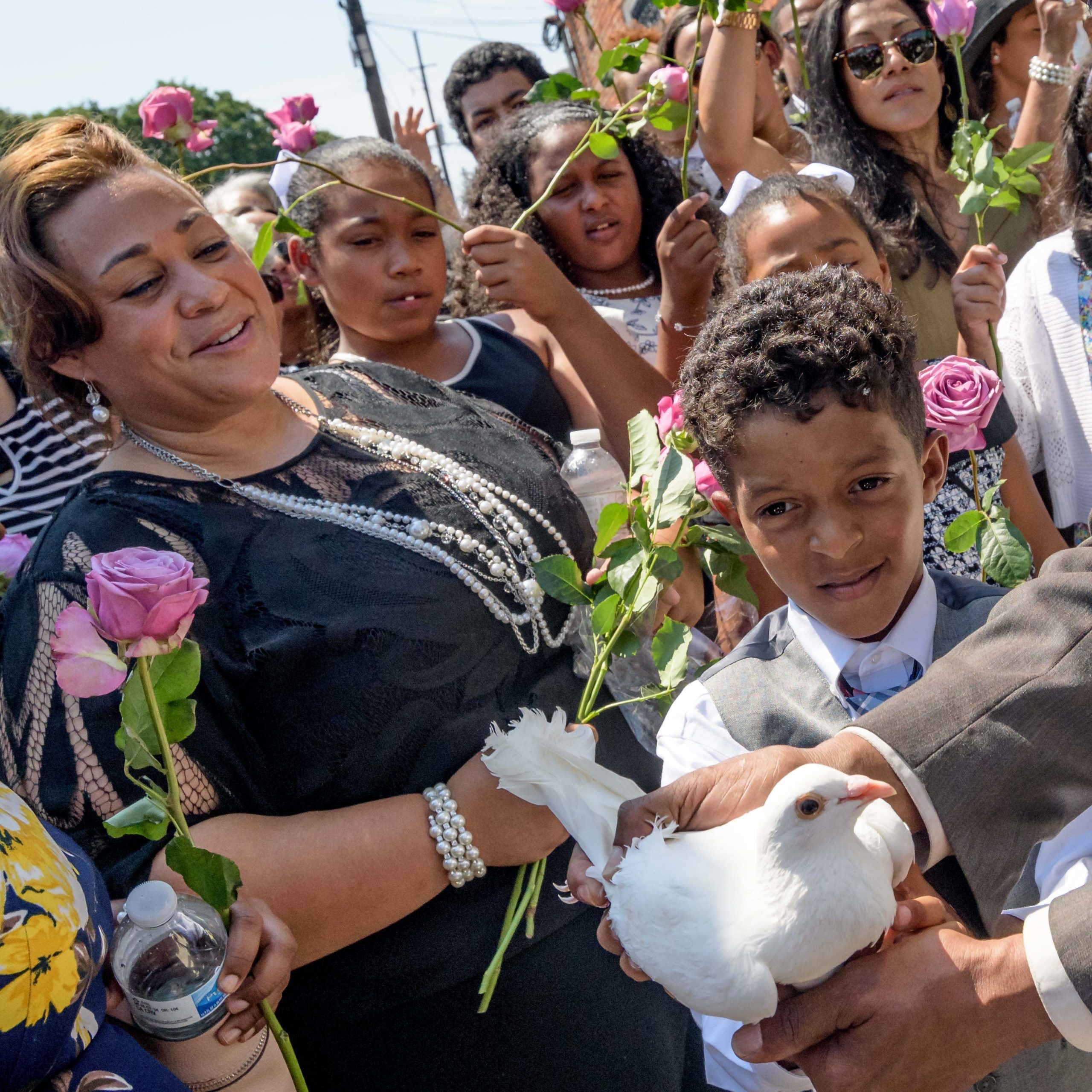 Tracie Haydel Griffin, the granddaughter of Chef Leah Chase, left, watches as Clarence Dalcour, Chief of the Creole Oceolas Mardi Gras Indians, releases doves in remembrance of Chef Chase at Dooky Chase’s Restaurant in the Treme neighborhood in New Orleans, La. Monday, June 10, 2019. The Queen of Creole Cuisine at Dooky Chase’s Restaurant passed away last Saturday June 1st at the age of 96. Born on January 6, 1923 she later served two U.S. presidents and also Freedom Riders during the Civil Rights era. The restaurant she ran with her husband, Dooky Chase, Jr., served as a meeting place for African-American politicians for decades. Photo by Matthew Hinton