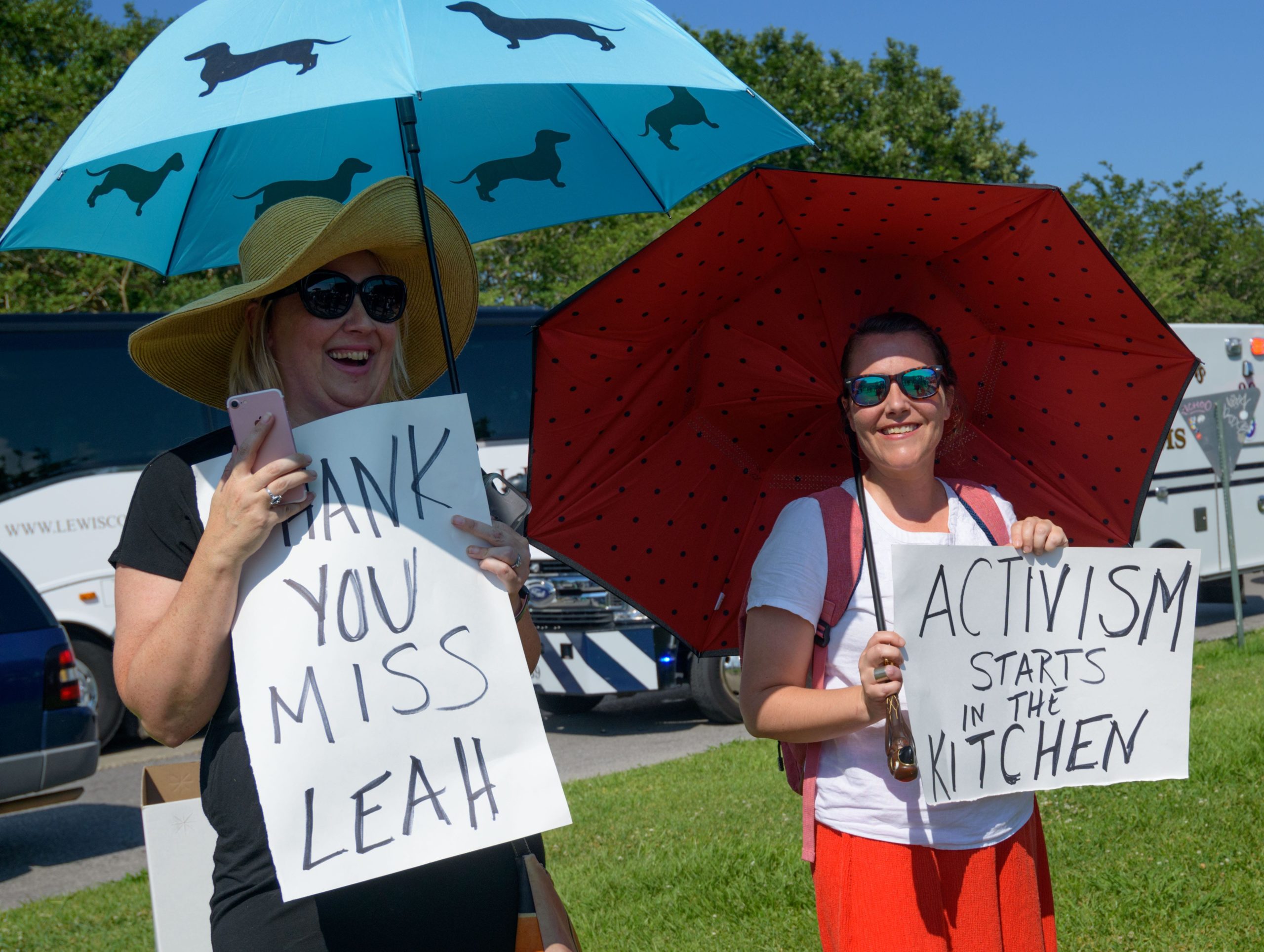 Two ladies hold signs honoring Chef Leah Chase during a second line in City Park after her burial at nearby St. Louis Cemetery #3 in New Orleans, La. Monday, June 10, 2019. The Queen of Creole Cuisine at Dooky Chase’s Restaurant passed away last Saturday June 1st at the age of 96. Born on January 6, 1923 she later served two U.S. presidents and also Freedom Riders during the Civil Rights era. The restaurant she ran with her husband, Dooky Chase, Jr., served as a meeting place for African-American politicians for decades. Photo by Matthew Hinton