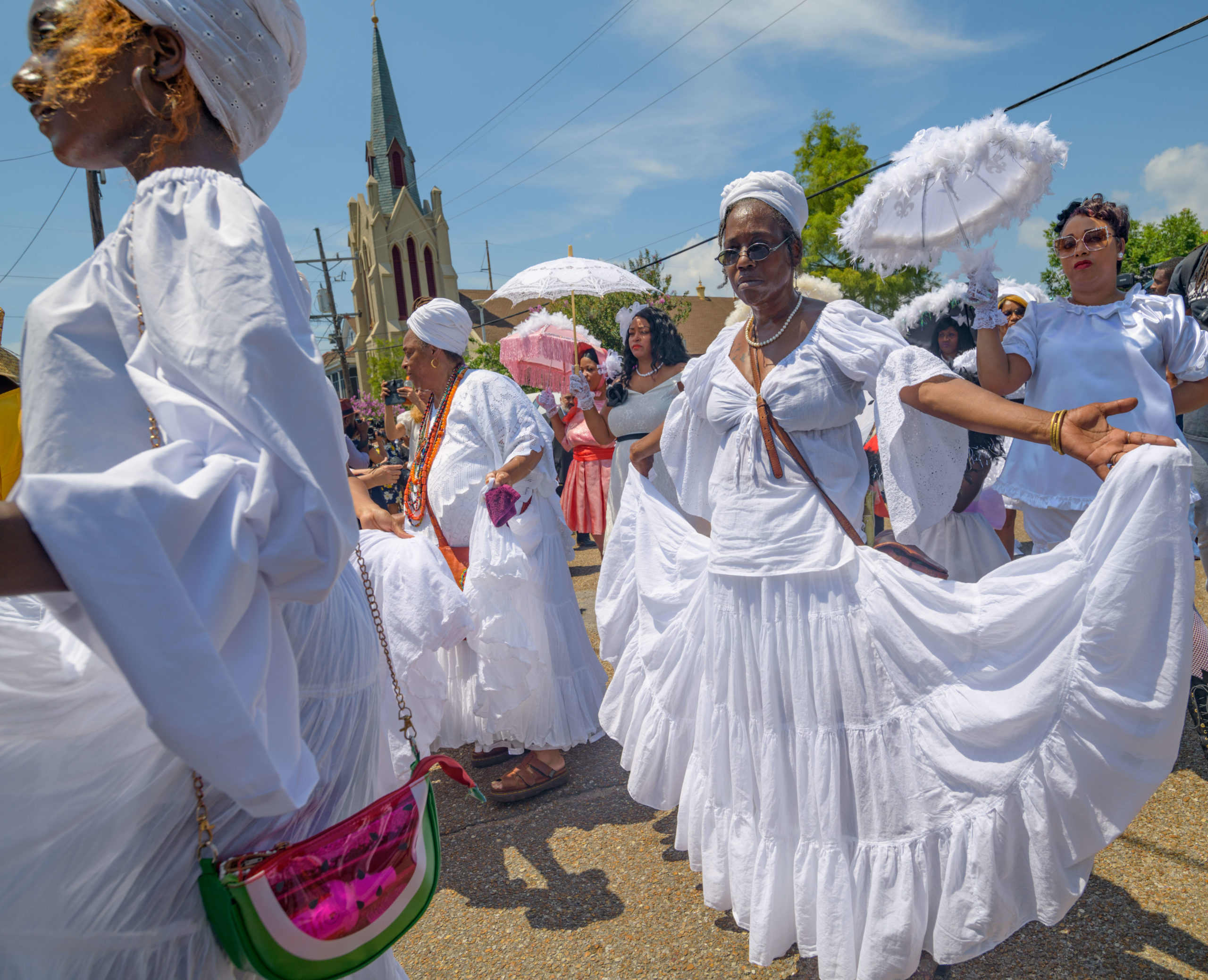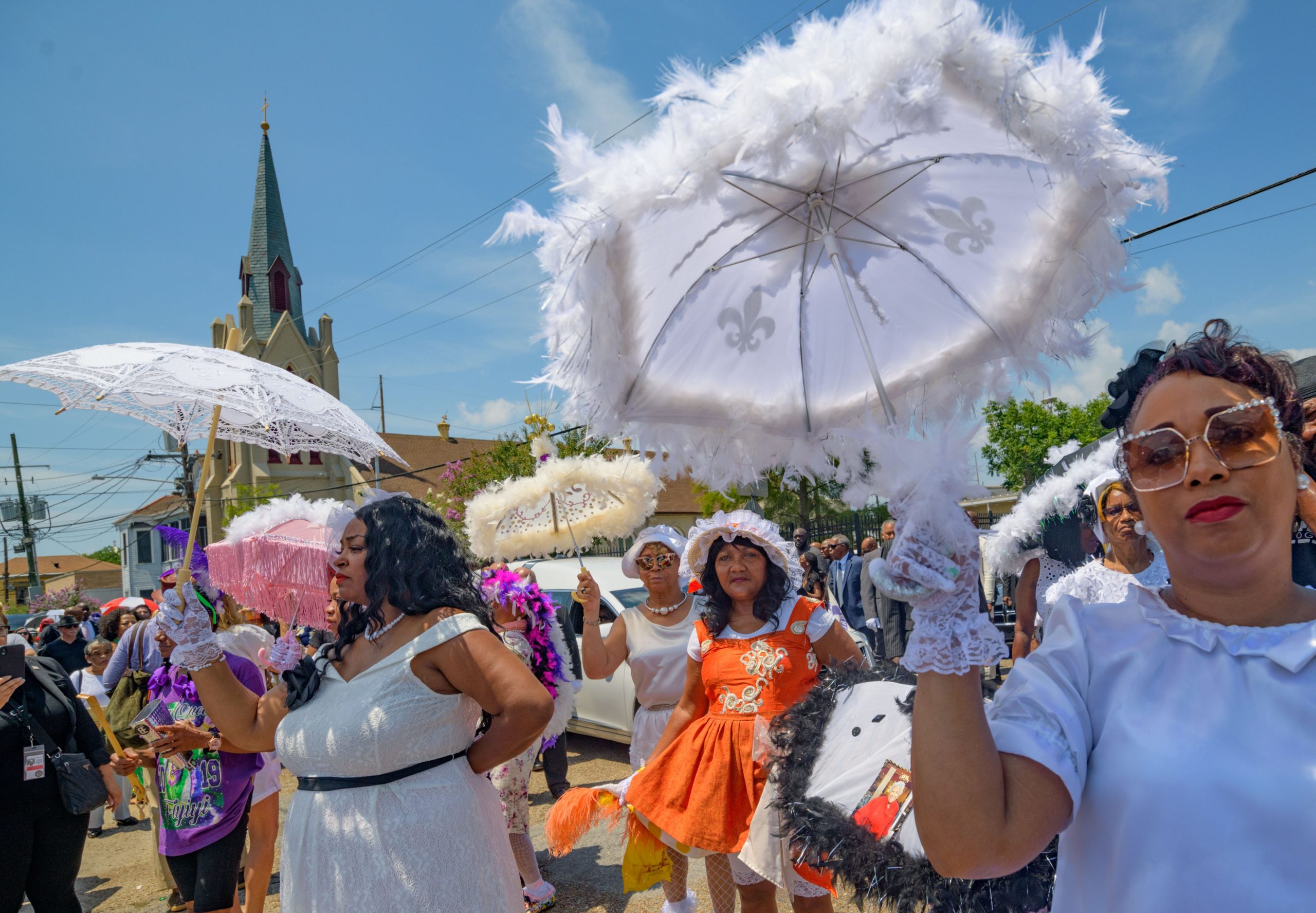 Baby Dolls line up for a jazz funeral after a funeral mass for Chef Leah Chase at St. Peter Claver Catholic Church in the Treme neighborhood in New Orleans, La. Monday, June 10, 2019. The Queen of Creole Cuisine at Dooky Chase’s Restaurant passed away last Saturday June 1st at the age of 96. Born on January 6, 1923 she later served two U.S. presidents and also Freedom Riders during the Civil Rights era. The restaurant she ran with her husband, Dooky Chase, Jr., served as a meeting place for African-American politicians for decades. Photo by Matthew Hinton