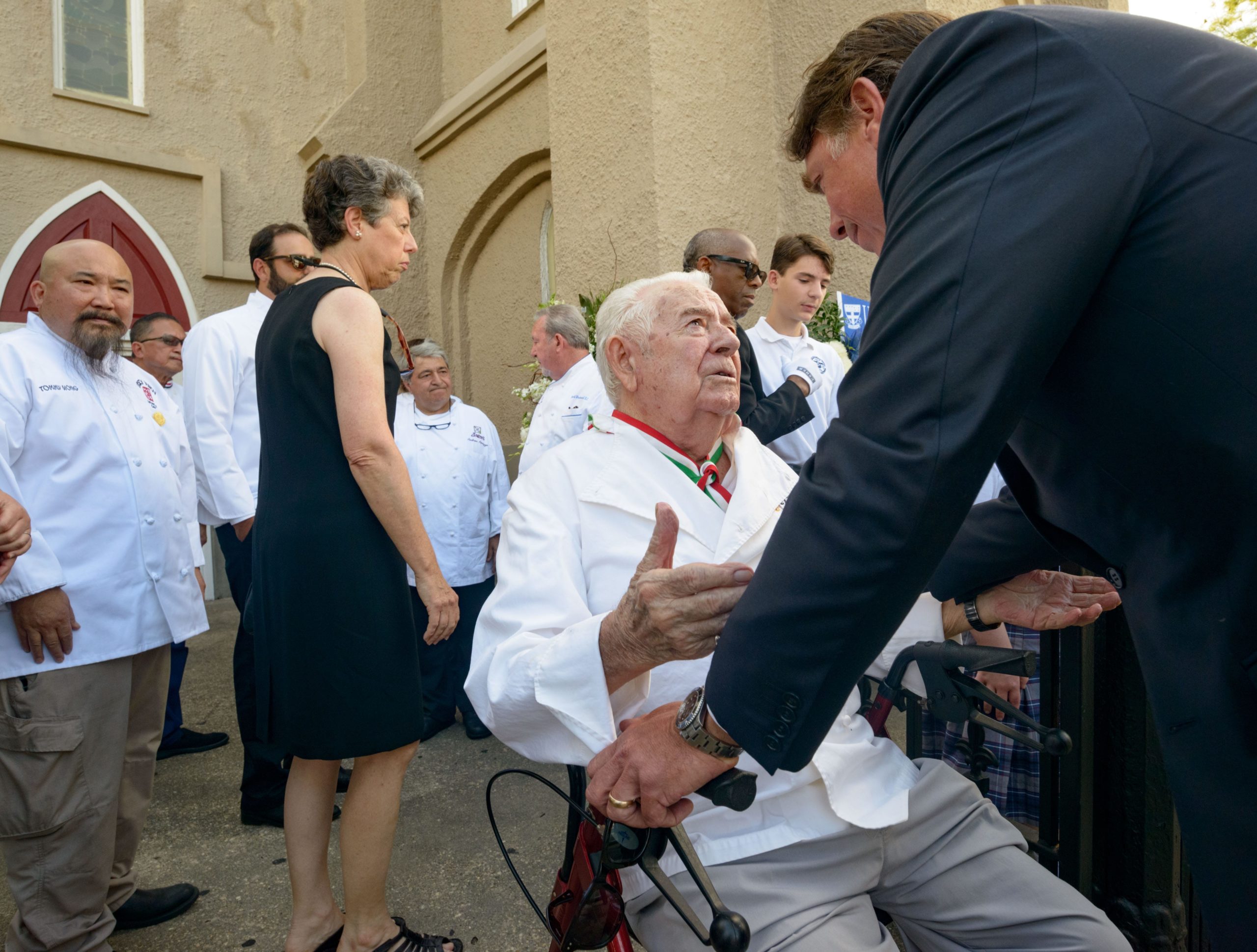 Chef John Besh, top right, talks to retired Chef Goffredo Fraccaro, seated, before a funeral mass for Chef Leah Chase in the Treme neighborhood in New Orleans, La. Monday, June 10, 2019. The Queen of Creole Cuisine at Dooky Chase’s Restaurant passed away last Saturday June 1st at the age of 96. Born on January 6, 1923 she later served two U.S. presidents and also Freedom Riders during the Civil Rights era. The restaurant she ran with her husband, Dooky Chase, Jr., served as a meeting place for African-American politicians for decades. Photo by Matthew Hinton