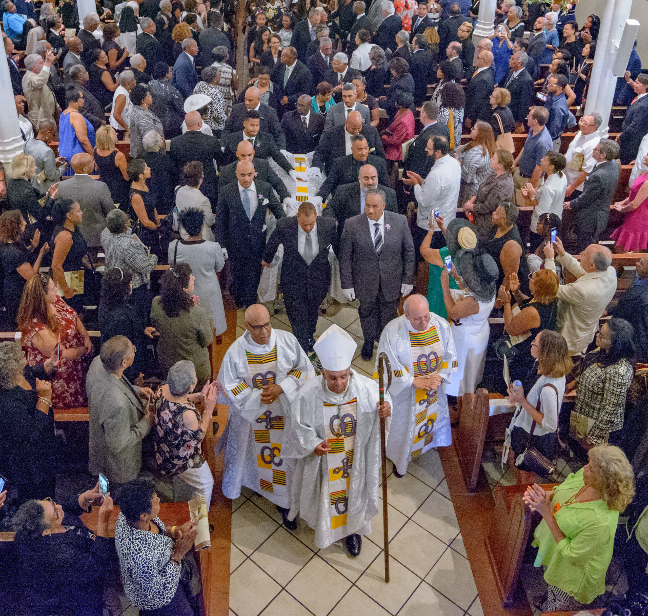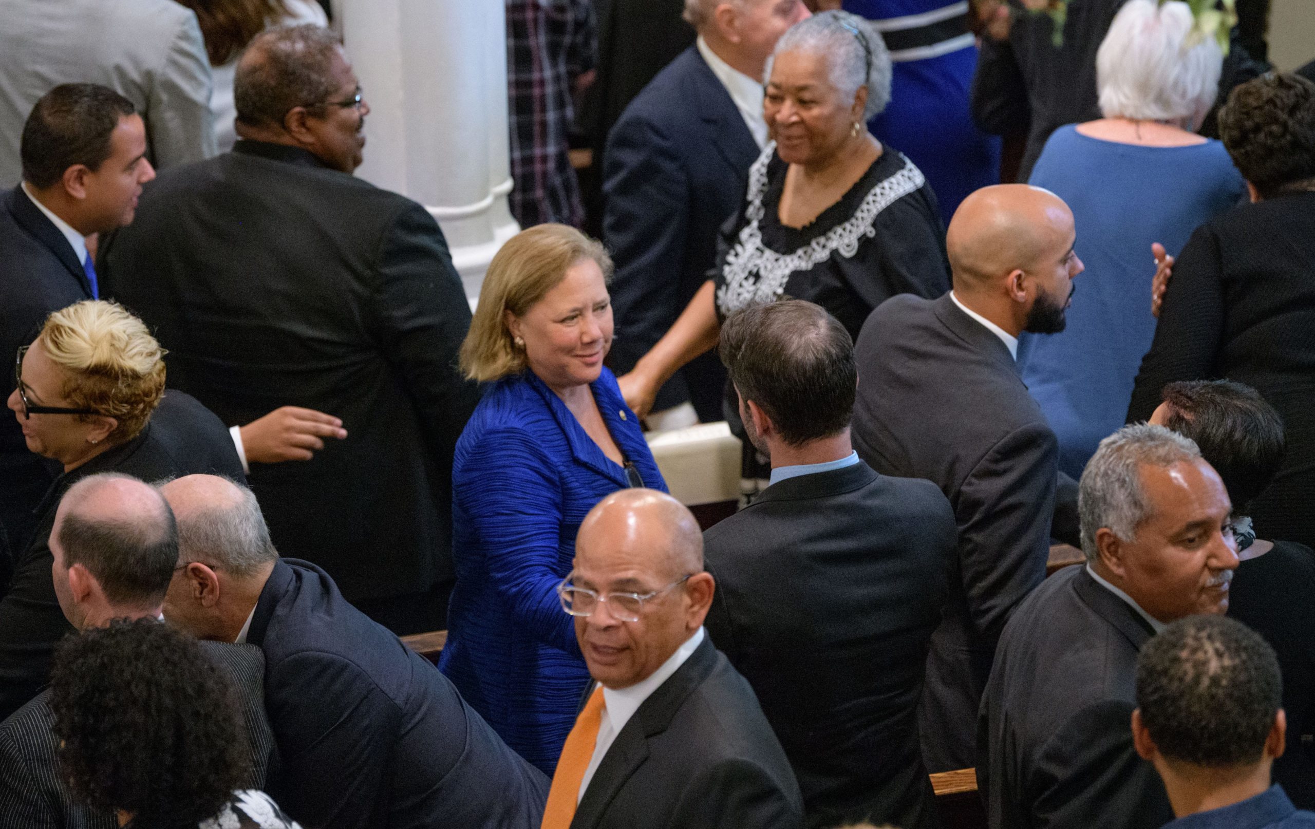 People including former U.S. Senator Mary Landrieu, center, and current Orleans Parish Sheriff Marlin Gusman, bottom right, shake hands during a funeral mass for Chef Leah Chase at St. Peter Claver Catholic Church at the end of a funeral mass in the Treme neighborhood in New Orleans, La. Monday, June 10, 2019. The Queen of Creole Cuisine at Dooky Chase’s Restaurant passed away last Saturday June 1st at the age of 96. Born on January 6, 1923 she later served two U.S. presidents and also Freedom Riders during the Civil Rights era. The restaurant she ran with her husband, Dooky Chase, Jr., served as a meeting place for African-American politicians for decades. Photo by Matthew Hinton
