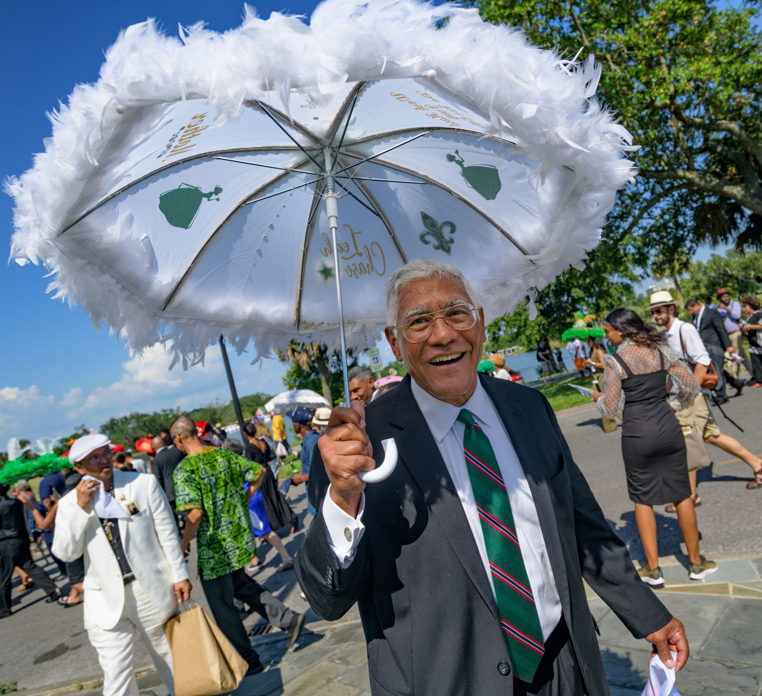 Edgar ‘Dooky’ Chase, III, the son of Chef Leah Chase, right, takes part in a second line for his mother in City Park after her burial at nearby St. Louis Cemetery #3 in New Orleans, La. Monday, June 10, 2019. The Queen of Creole Cuisine at Dooky Chase’s Restaurant passed away last Saturday June 1st at the age of 96. Born on January 6, 1923 she later served two U.S. presidents and also Freedom Riders during the Civil Rights era. The restaurant she ran with her husband, Dooky Chase, Jr., served as a meeting place for African-American politicians for decades. Photo by Matthew Hinton