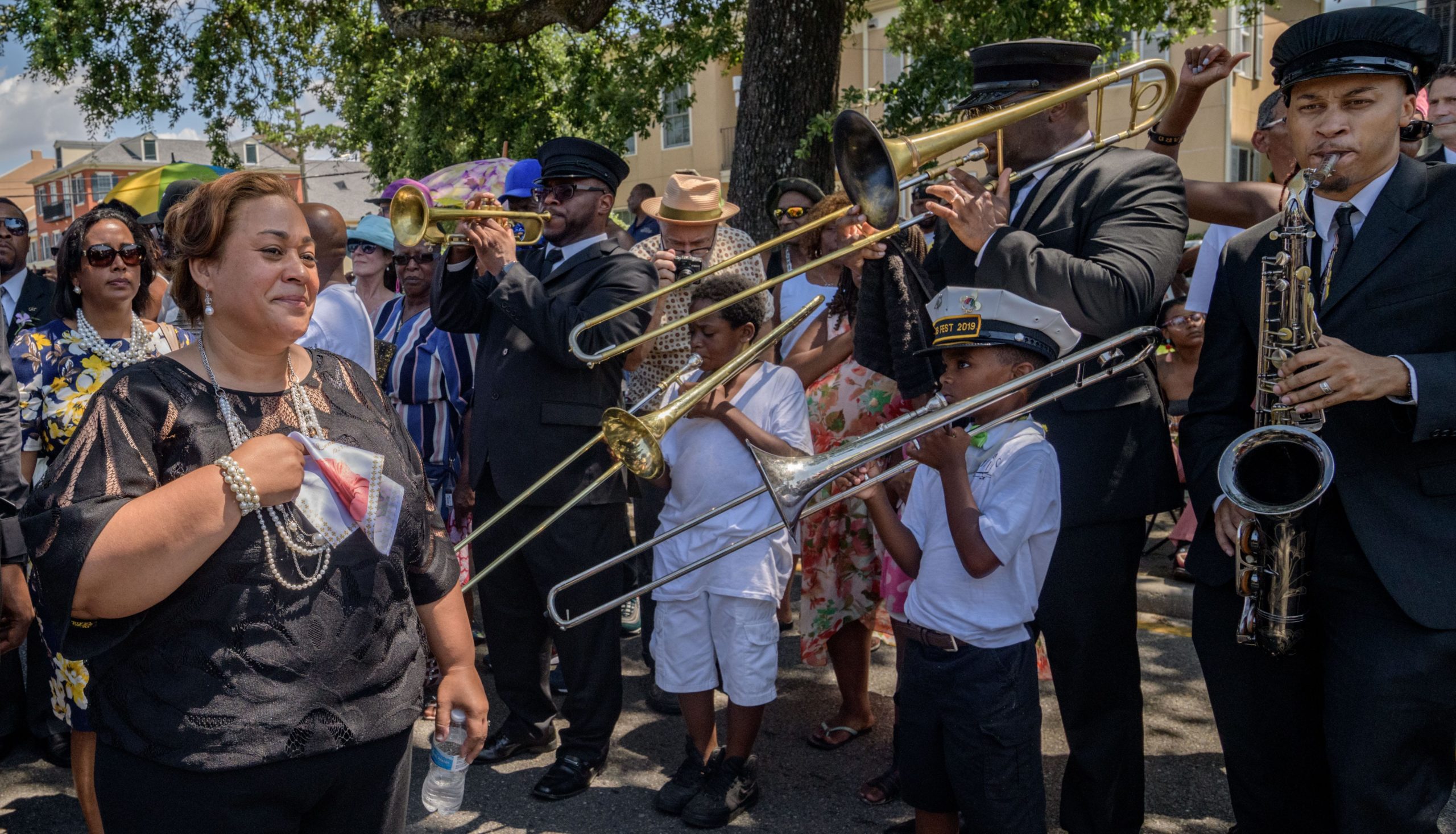 Tracie Haydel Griffin, the granddaughter of Chef Leah Chase, walks during a jazz funeral procession to Dooky Chase’s Restaurant in the Treme neighborhood in New Orleans, La. Monday, June 10, 2019. Playing trombone next them are Alvin Coco, a 7-year-old, and band leader Big Sam Williams. The Queen of Creole Cuisine at Dooky Chase’s Restaurant passed away last Saturday June 1st at the age of 96. Born on January 6, 1923 she later served two U.S. presidents and also Freedom Riders during the Civil Rights era. The restaurant she ran with her husband, Dooky Chase, Jr., served as a meeting place for African-American politicians for decades. Photo by Matthew Hinton