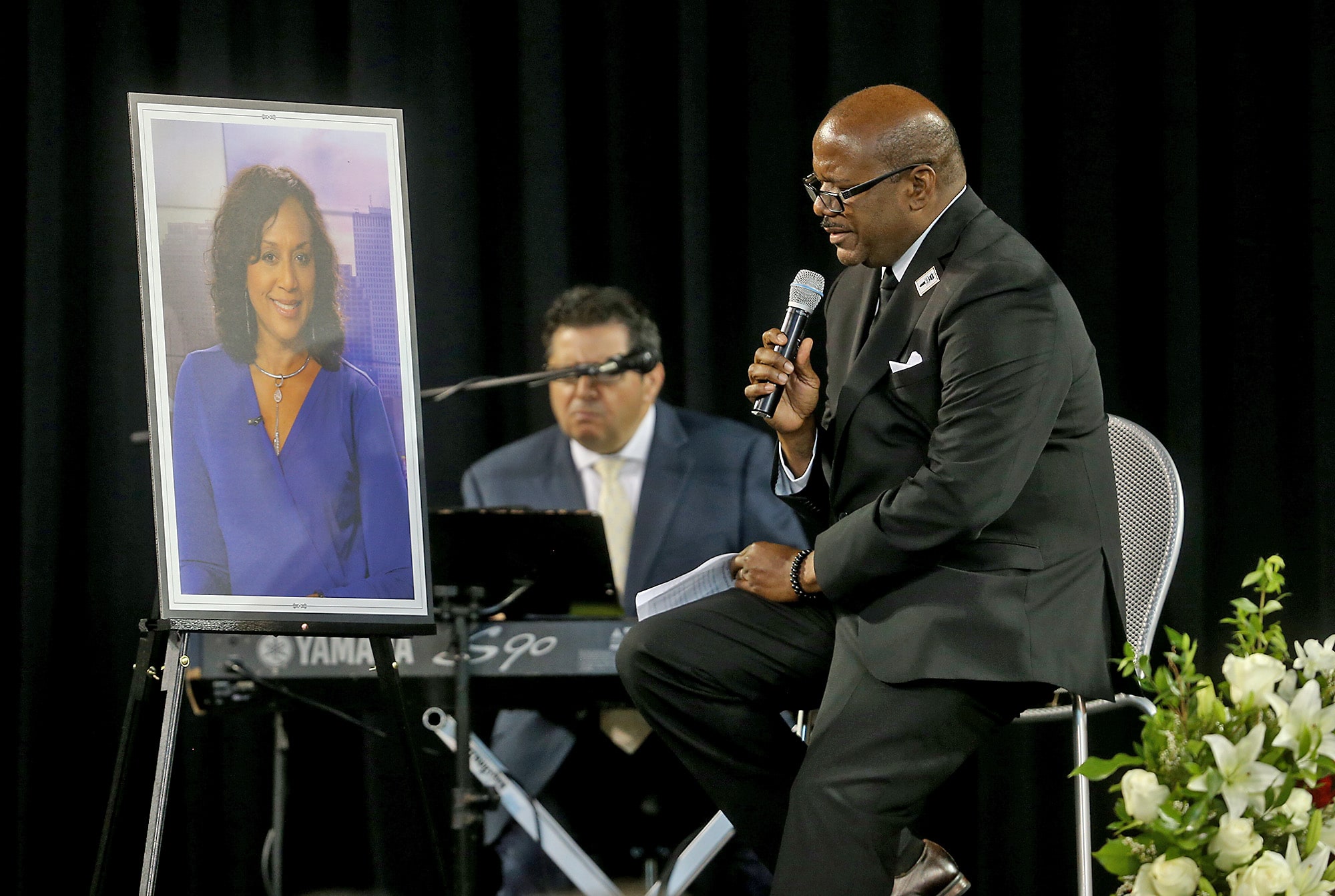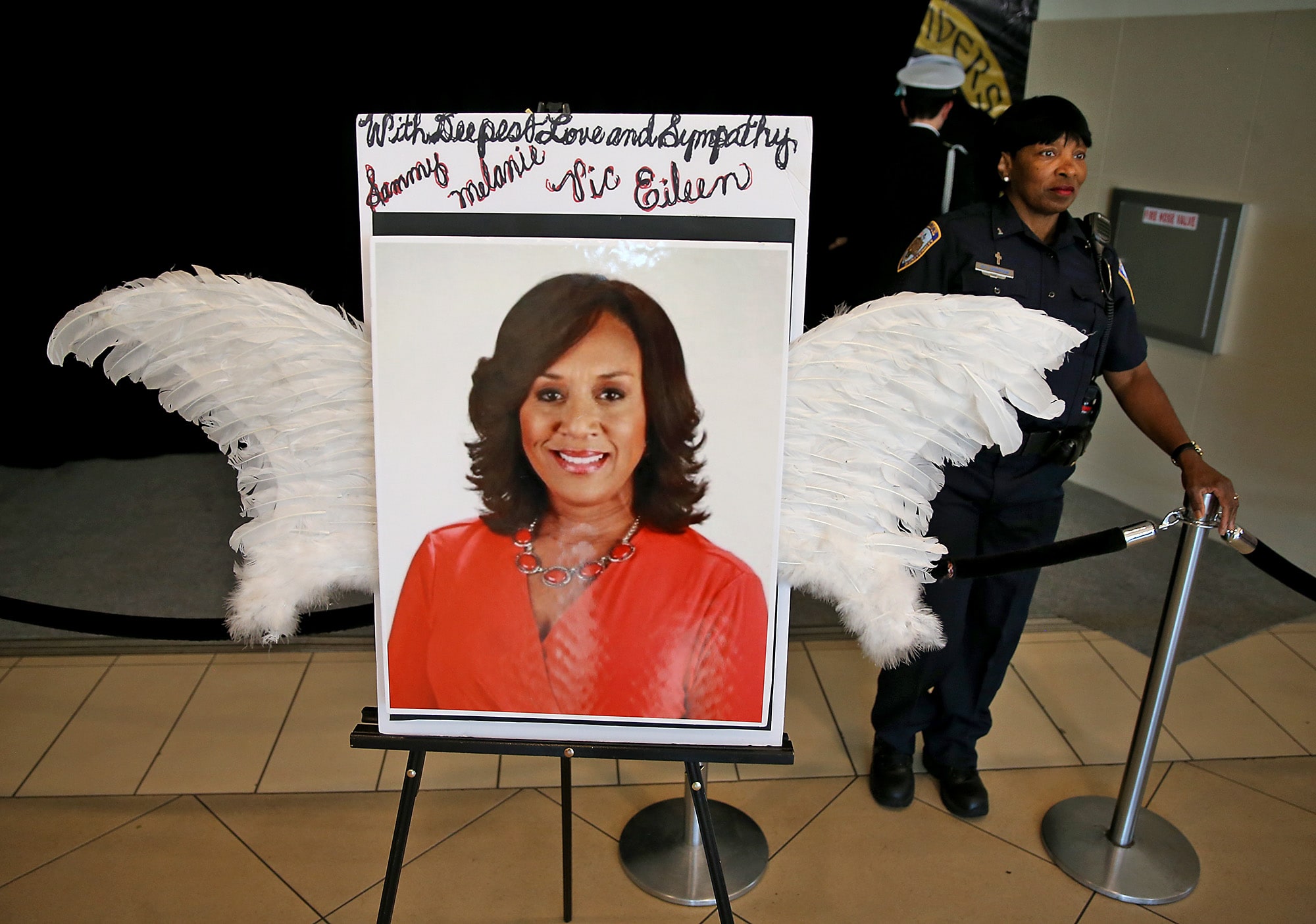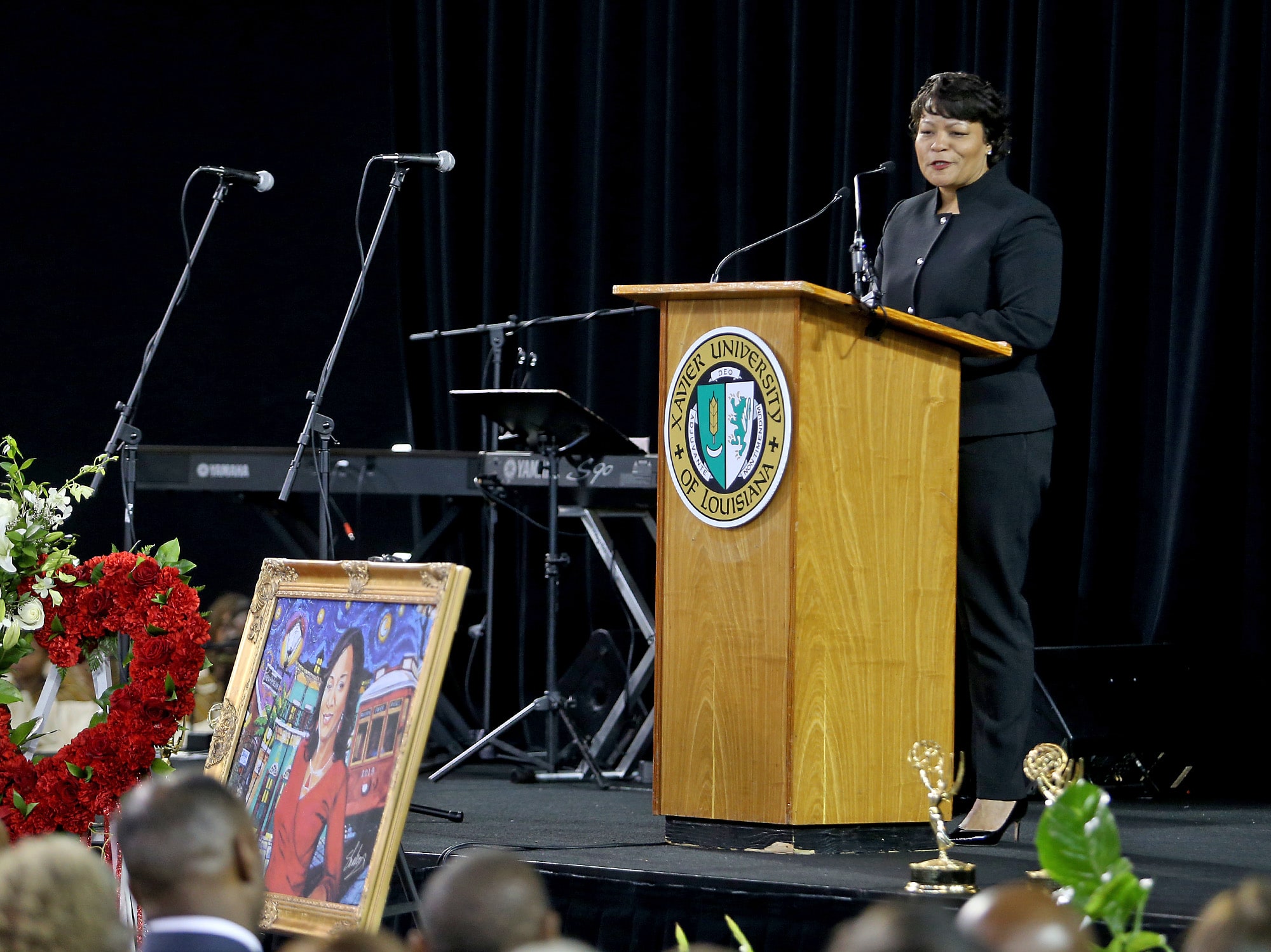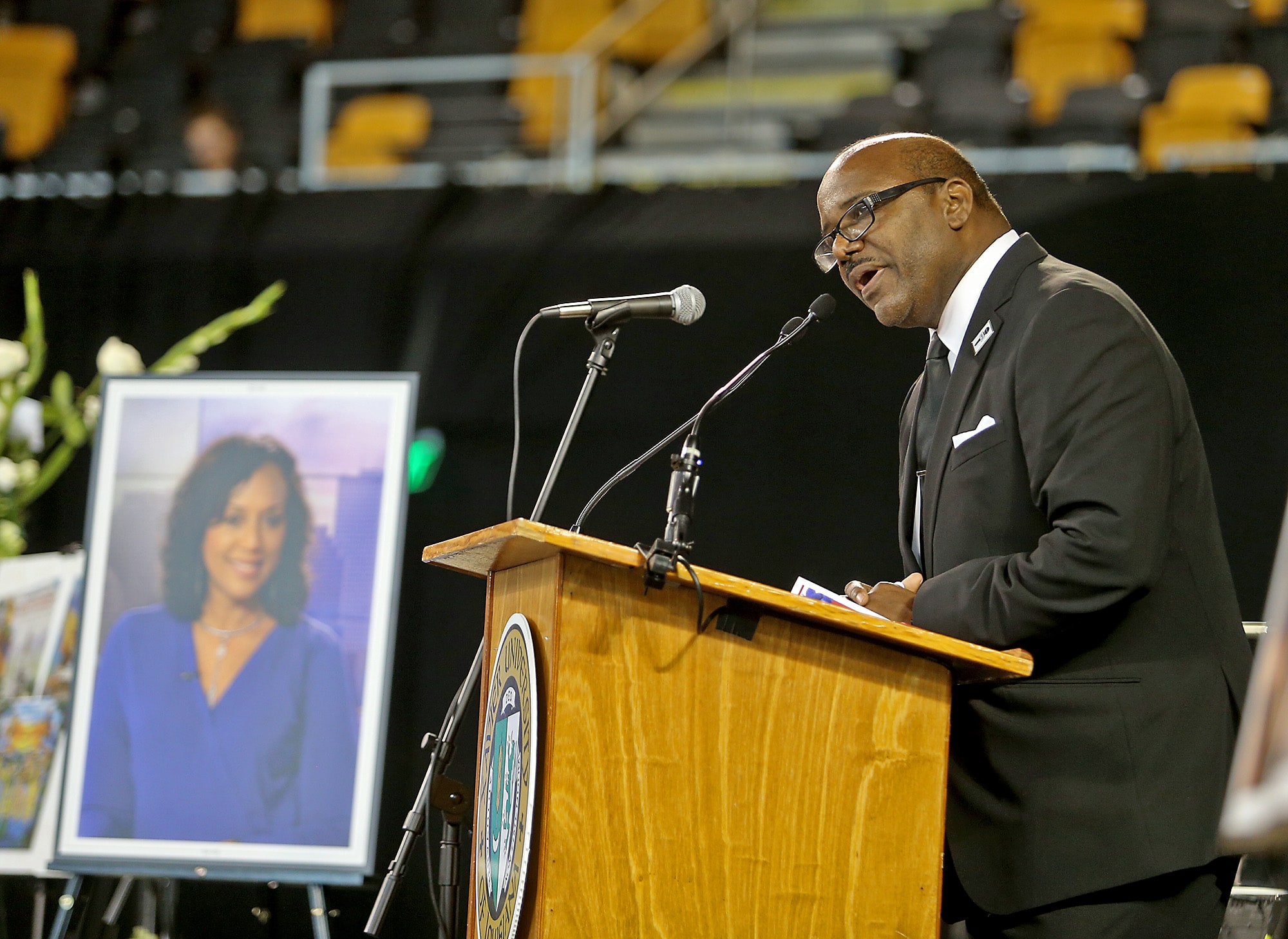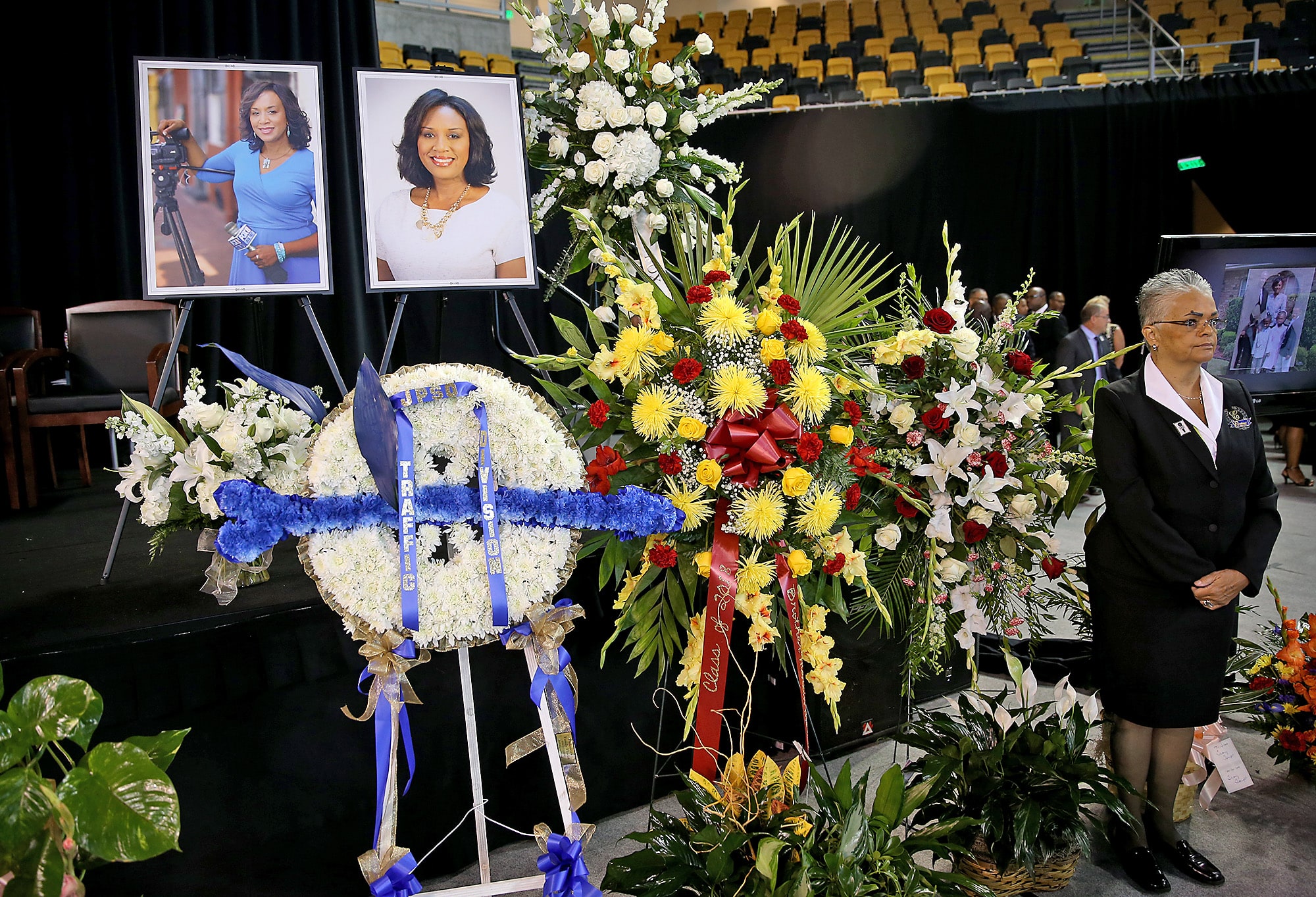 Flowers and photos during the public memorial service at the Xavier Convocation Center for Fox 8 journalist and anchor Nancy Parker who was killed last week in a small plane crash while working on a story. (Photo by Michael DeMocker)