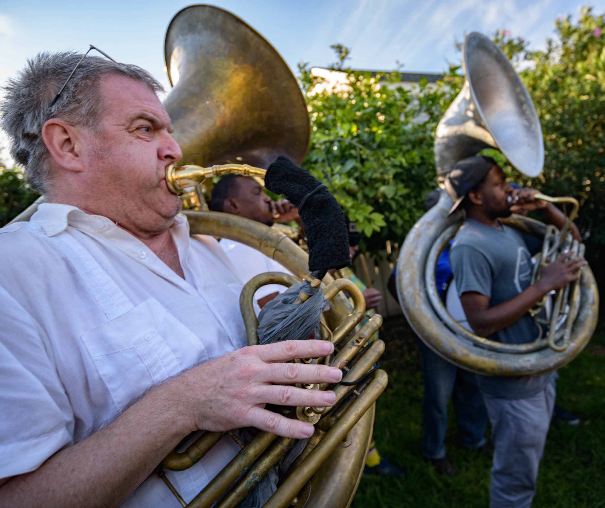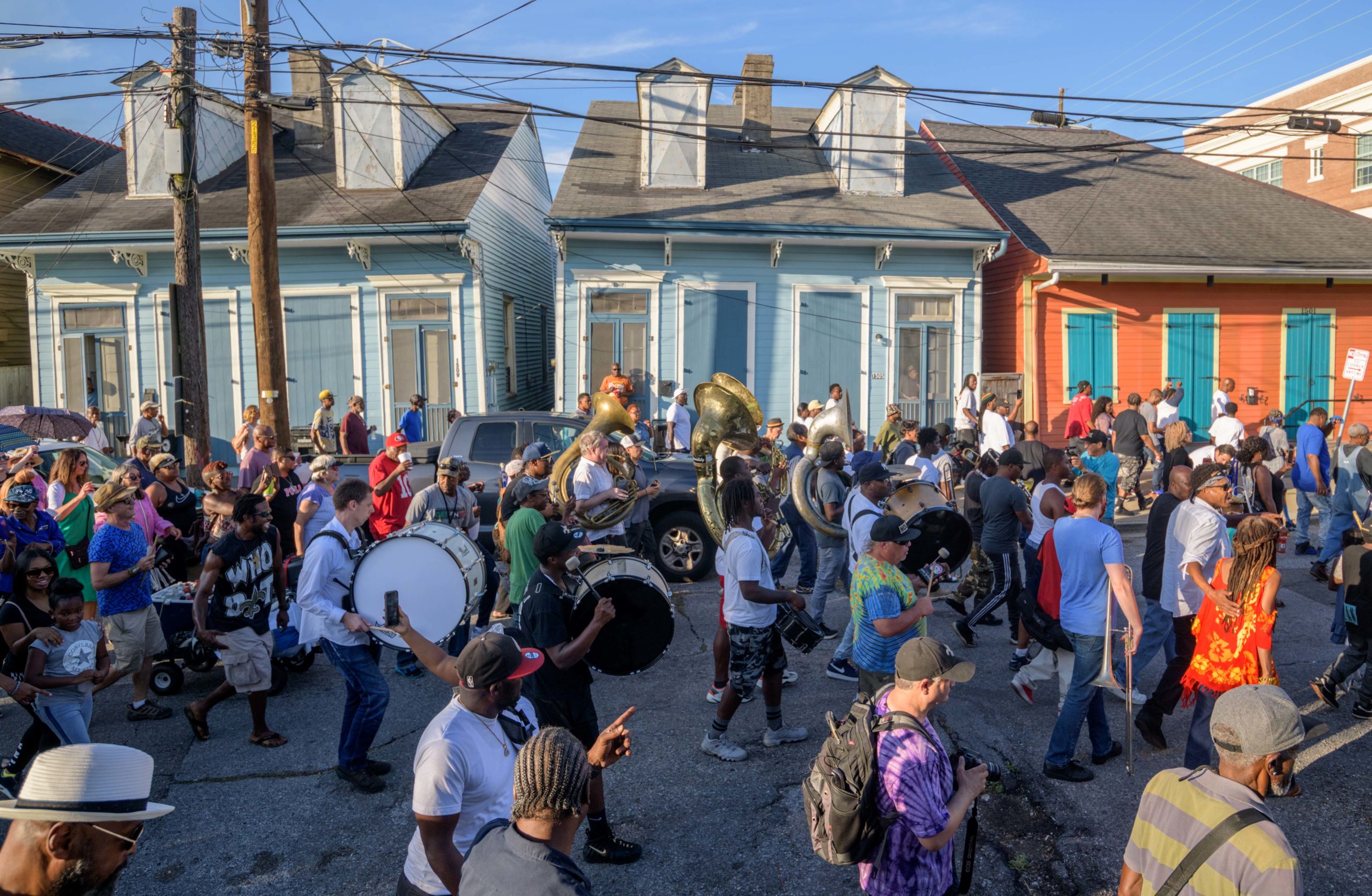 A brass band parades in memory of Art Poppa Funk Neville in the Treme neighborhood lead by Treme trombonist Corey Henry in New Orleans, Monday, July 29, 2019. Arthur Lanon Neville (December 17, 1937 July 22, 2019) was known for New Orleans standards Hey Pocky A-Way, Fire on the Bayou, and Mardi Gras Mambo. He was a pioneer of funk and New Orleans music, and was best known as the keyboardist and songwriter for the Grammy-winning Neville Brothers and Rock and Roll Hall of Fame nominated The Meters. Photo by Matthew Hinton