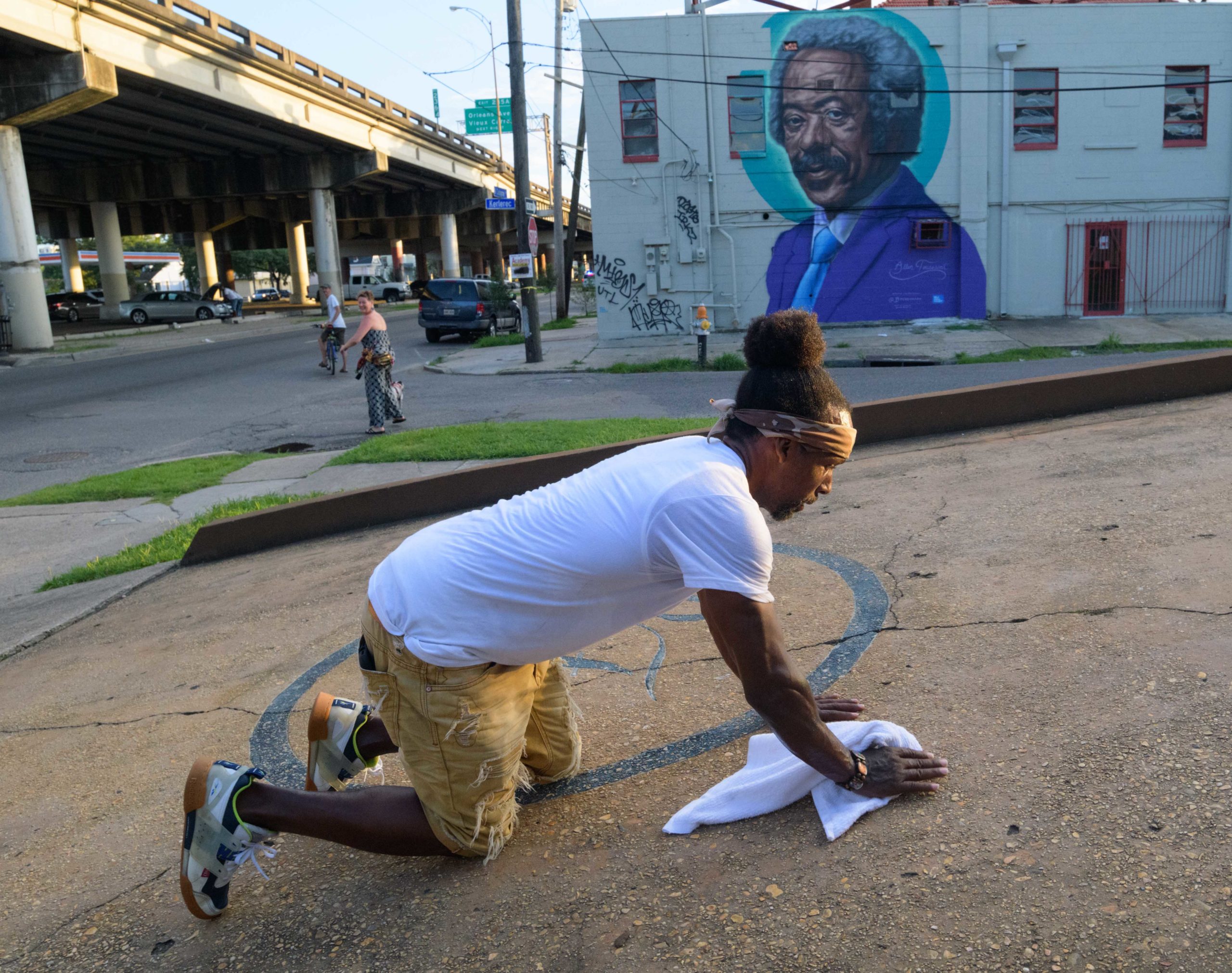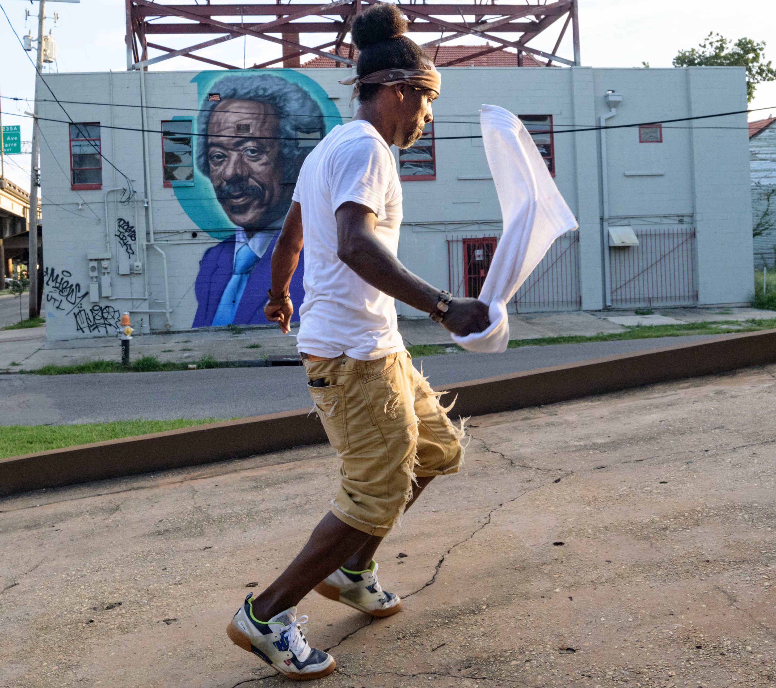 Wilson Moreheab also know as the Camouflage Boomer dances next to a mural of Allen Toussaint during a second line in memory of Art Poppa Funk Neville in the Treme neighborhood lead by Treme trombonist Corey Henry in New Orleans, Monday, July 29, 2019. Arthur Lanon Neville (December 17, 1937 July 22, 2019) was known for New Orleans standards Hey Pocky A-Way, Fire on the Bayou, and Mardi Gras Mambo. He was a pioneer of funk and New Orleans music, and was best known as the keyboardist and songwriter for the Grammy-winning Neville Brothers and Rock and Roll Hall of Fame nominated The Meters. Photo by Matthew Hinton