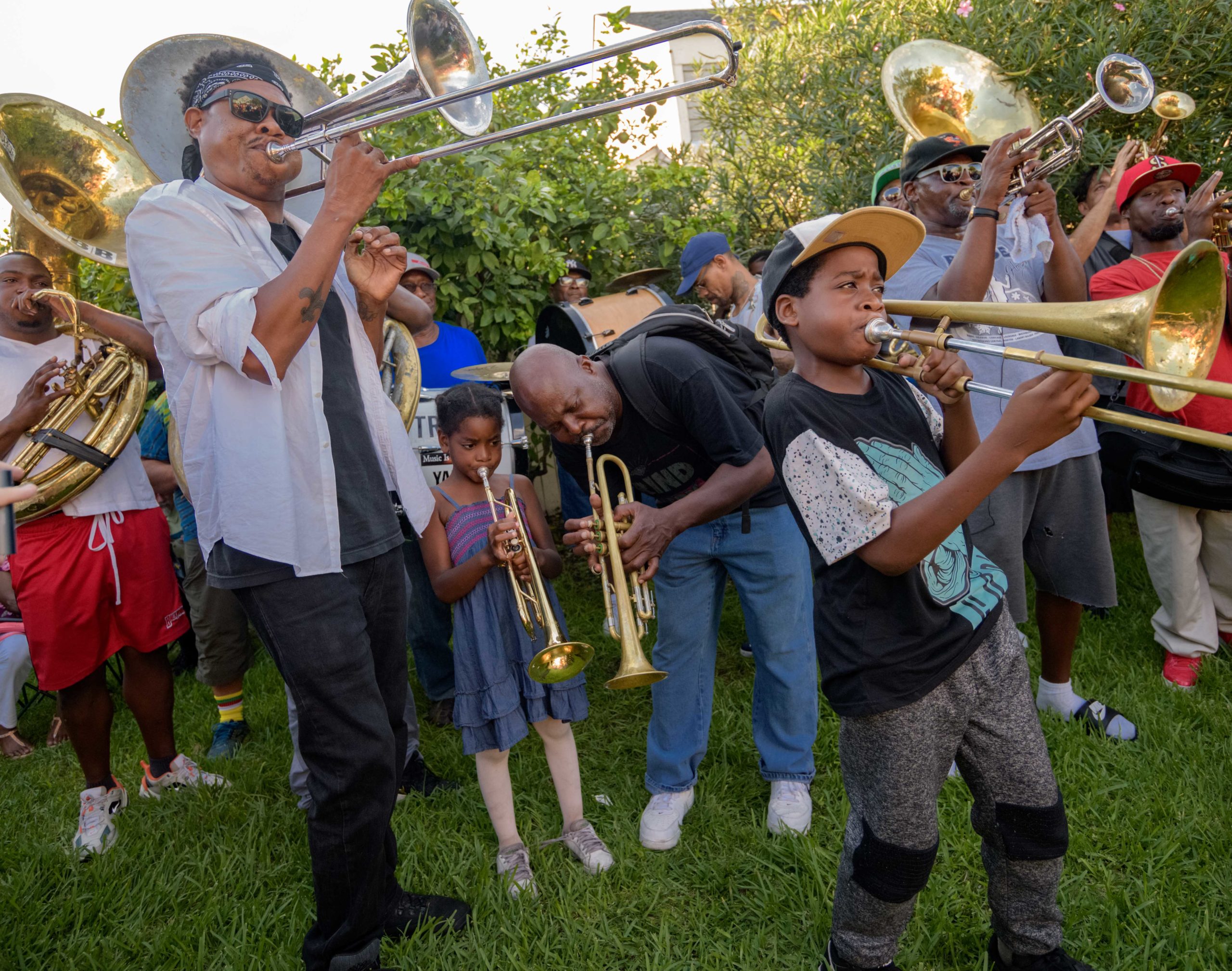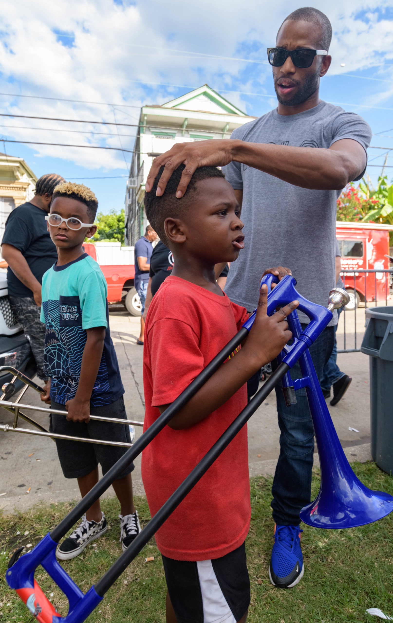 Troy Trombone Shorty Andrews greets other short trombonists including Alvin Coco, left, and Mosiah Chartock, center, before a second line for Art Poppa Funk Neville in the Treme neighborhood during lead by Treme trombonist Corey Henry in New Orleans, Monday, July 29, 2019. Andrews got the nickname for playing trombone when he was young and he gave Alvin some pointers including how to breathe and stand while playing. Arthur Lanon Neville (December 17, 1937 July 22, 2019) was known for New Orleans standards Hey Pocky A-Way, Fire on the Bayou, and Mardi Gras Mambo. He was a pioneer of funk and New Orleans music, and was best known as the keyboardist and songwriter for the Grammy-winning Neville Brothers and Rock and Roll Hall of Fame nominated The Meters. Photo by Matthew Hinton