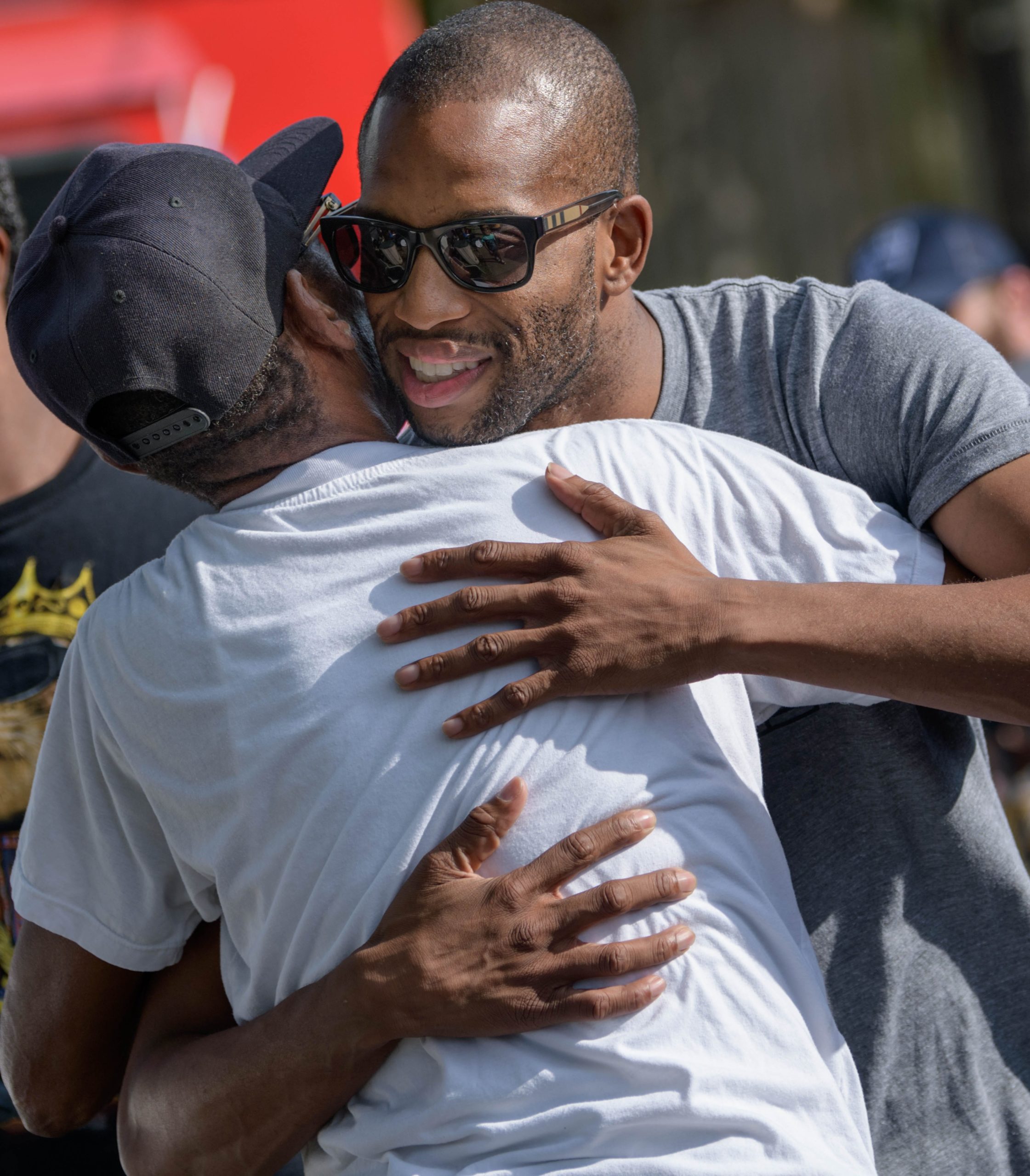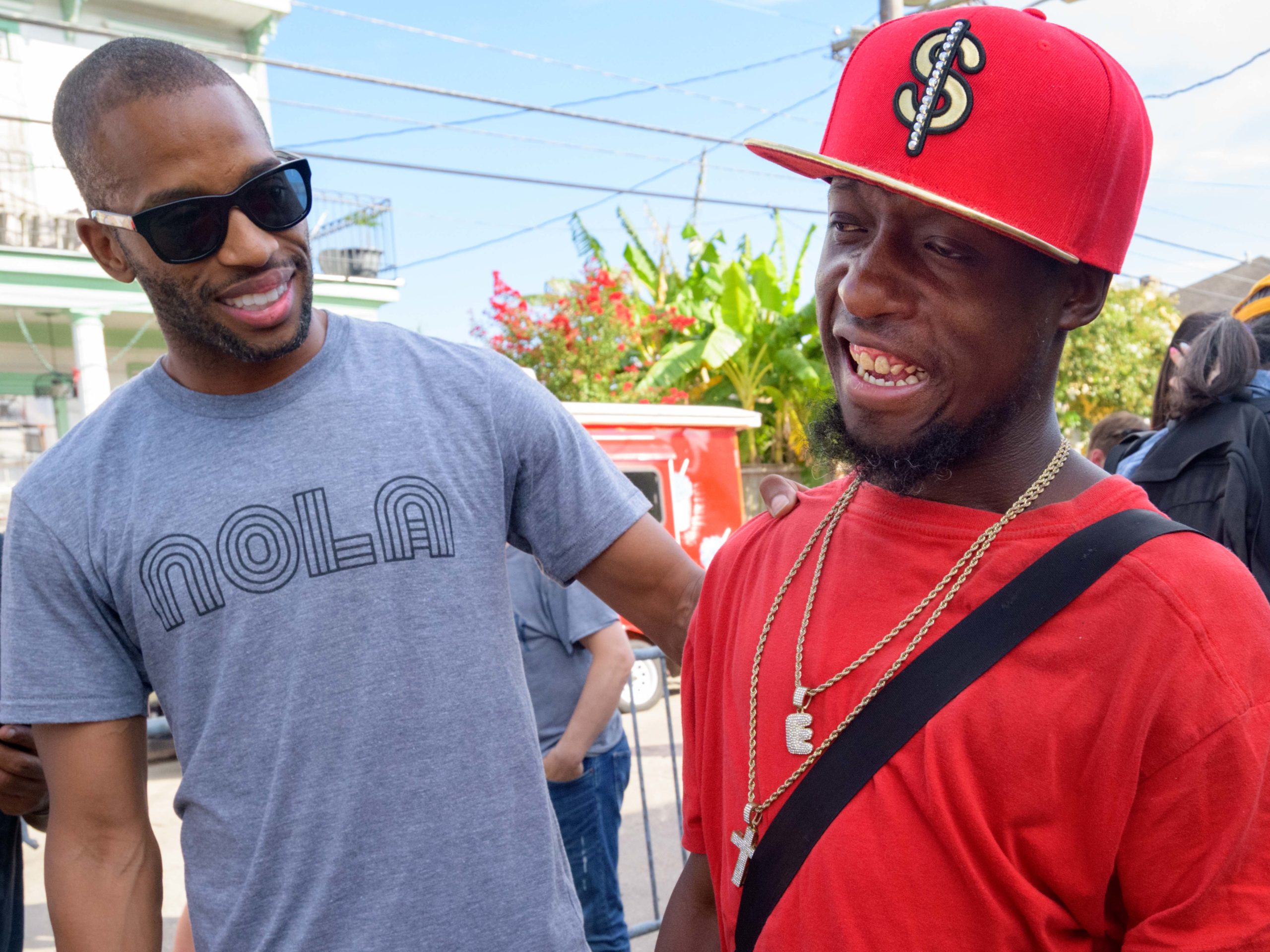 Troy Trombone Shorty Andrews greets Eugene “Little Eugene” Grant, a musician who plays on Frenchmen Street, before a second line for Art Poppa Funk Neville in the Treme neighborhood during lead by Treme trombonist Corey Henry in New Orleans, Monday, July 29, 2019. Arthur Lanon Neville (December 17, 1937 July 22, 2019) was known for New Orleans standards Hey Pocky A-Way, Fire on the Bayou, and Mardi Gras Mambo. He was a pioneer of funk and New Orleans music, and was best known as the keyboardist and songwriter for the Grammy-winning Neville Brothers and Rock and Roll Hall of Fame nominated The Meters. Photo by Matthew Hinton