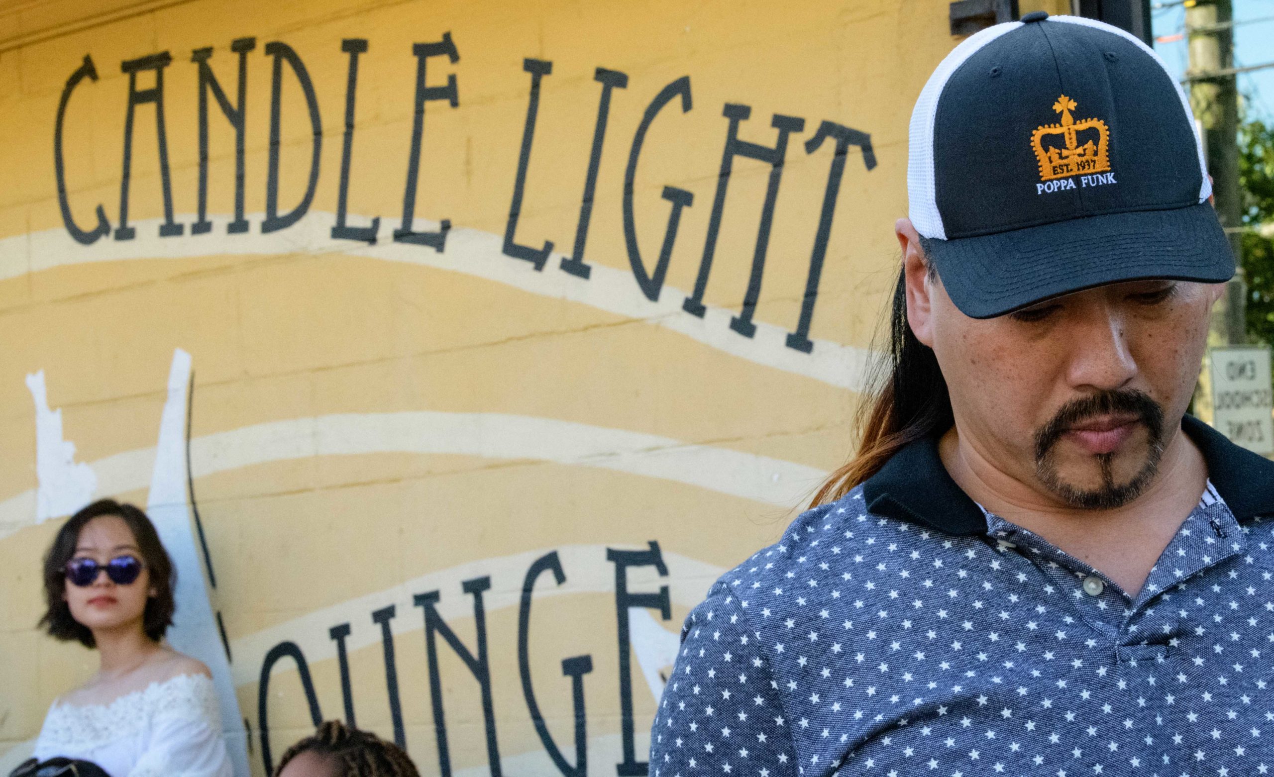 Taku Hirano, the son-in-law of Art Poppa Funk Neville and Music producer as well as a percussionist known for his work as the electronic Duo Tao of Sound, waits in the Treme neighborhood for a second line for Poppa Funk lead by Treme trombonist Corey Henry in New Orleans, Monday, July 29, 2019. Arthur Lanon Neville (December 17, 1937 July 22, 2019) was known for New Orleans standards Hey Pocky A-Way, Fire on the Bayou, and Mardi Gras Mambo. He was a pioneer of funk and New Orleans music, and was best known as the keyboardist and songwriter for the Grammy-winning Neville Brothers and Rock and Roll Hall of Fame nominated The Meters. Photo by Matthew Hinton