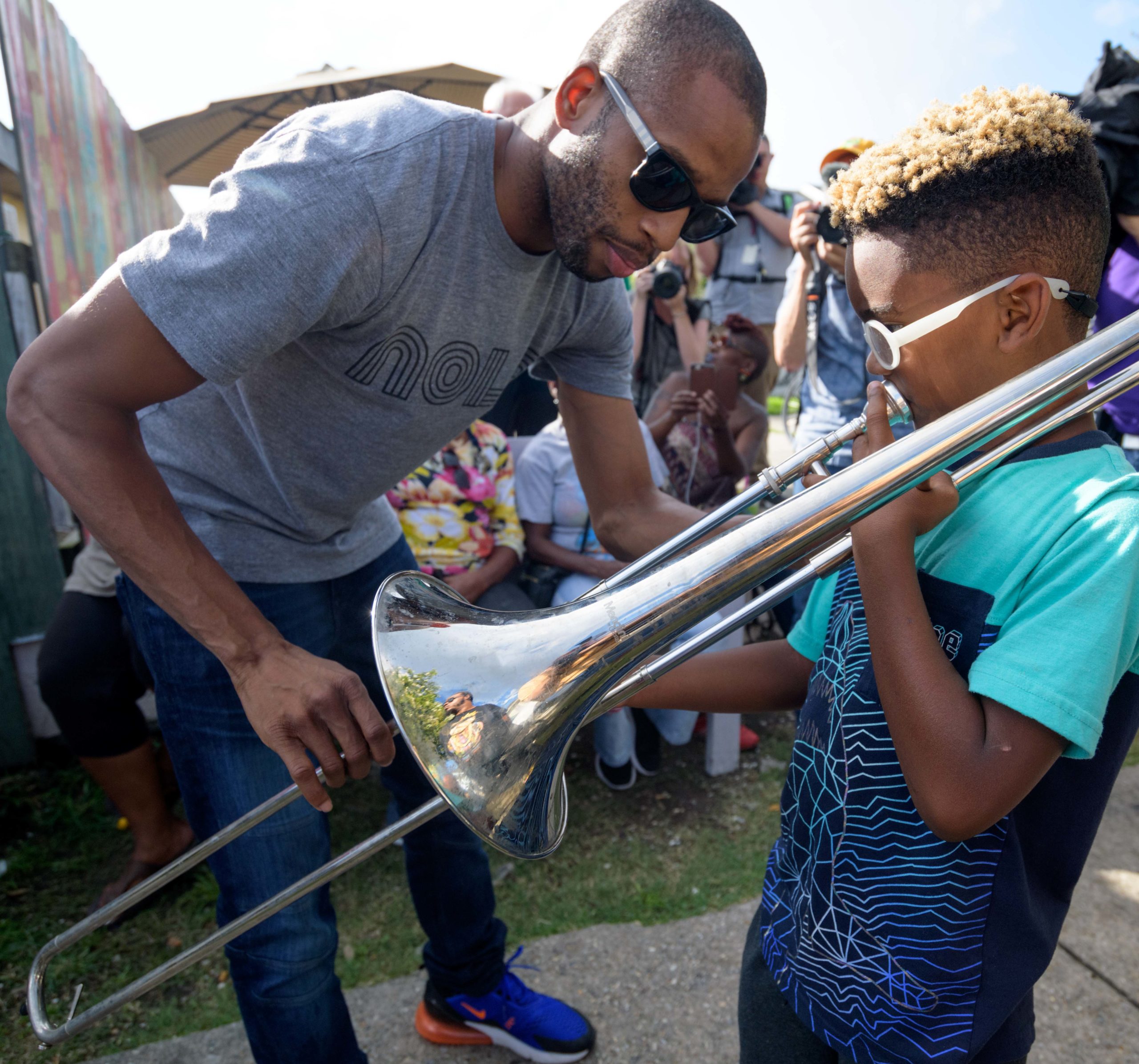 Troy Trombone Shorty Andrews greets another short trombonist, Alvin Coco, before a second line for Art Poppa Funk Neville in the Treme neighborhood during lead by Treme trombonist Corey Henry in New Orleans, Monday, July 29, 2019. Andrews got the nickname for playing trombone when he was young and he gave Alvin some pointers including how to breathe and stand while playing. Arthur Lanon Neville (December 17, 1937 July 22, 2019) was known for New Orleans standards Hey Pocky A-Way, Fire on the Bayou, and Mardi Gras Mambo. He was a pioneer of funk and New Orleans music, and was best known as the keyboardist and songwriter for the Grammy-winning Neville Brothers and Rock and Roll Hall of Fame nominated The Meters. Photo by Matthew Hinton