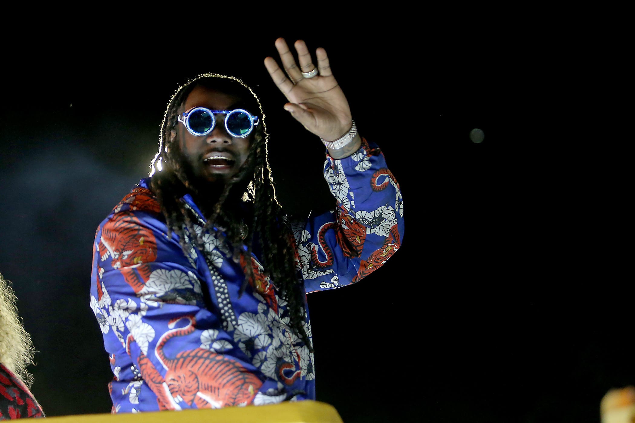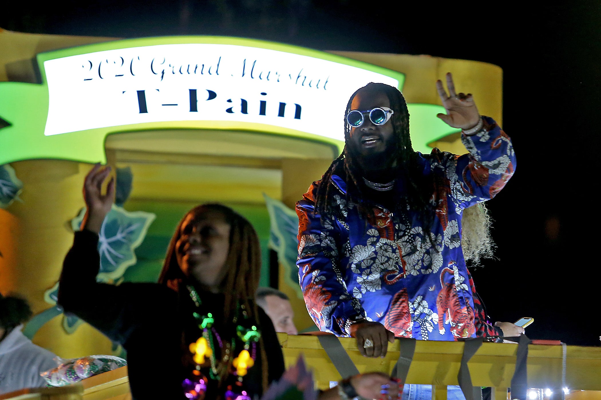 Grand Marshal T-Pain waves to the crowd as the 550 members of Pygmalion roll down the Uptown parade route with an Italy-themed 25-float parade entitled “Viaggia in Italia”. Cary Oswald reigned as King Pygmalion and Kalli Mercer was Queen Pygmalion as the krewe presented their 21st annual parade on Saturday, February 15, 2020. (Photo by Michael DeMocker)