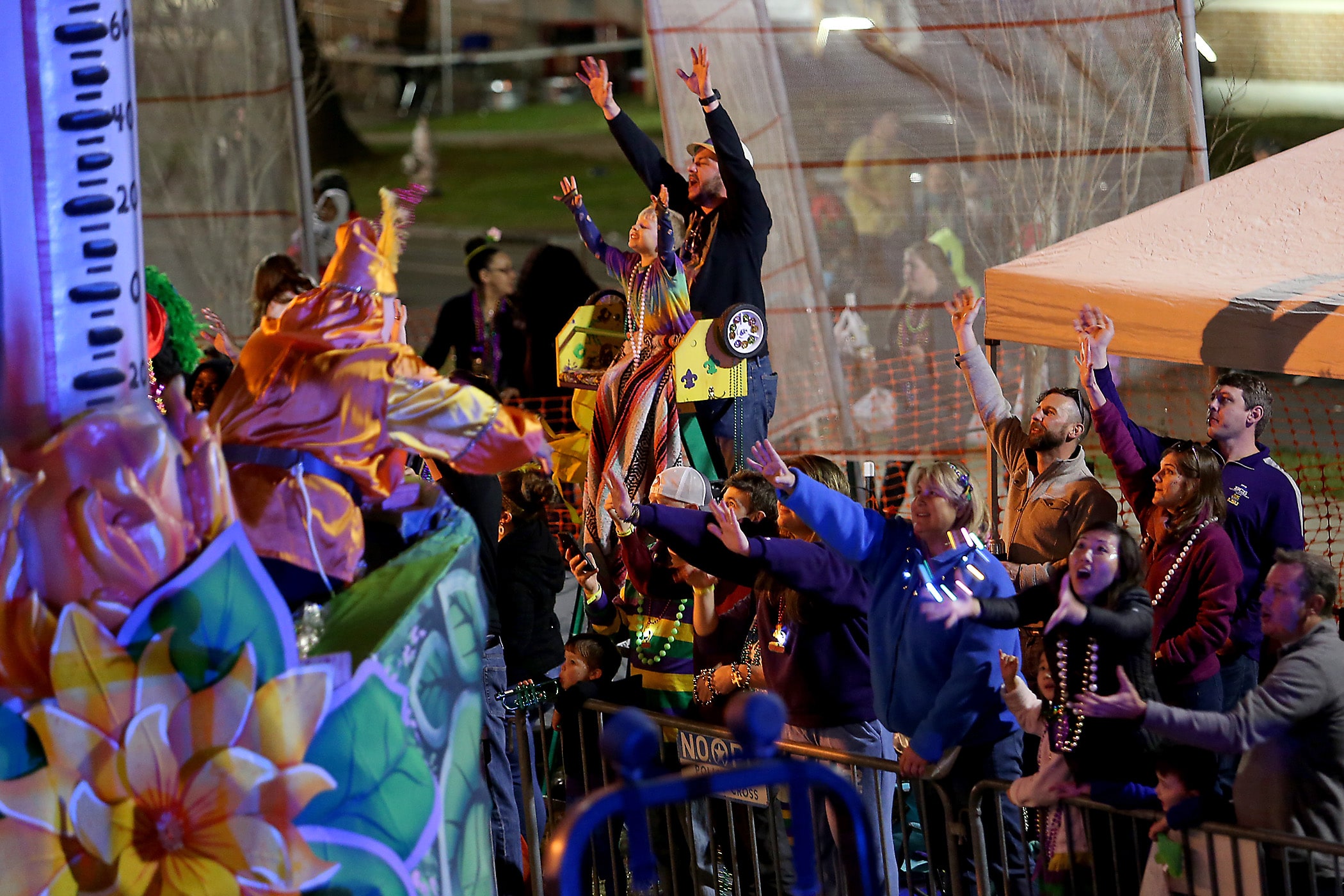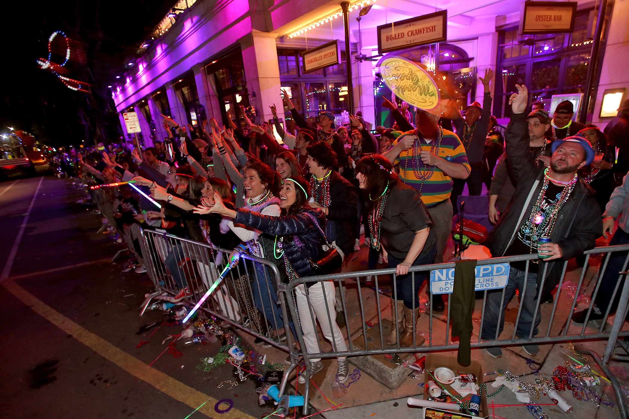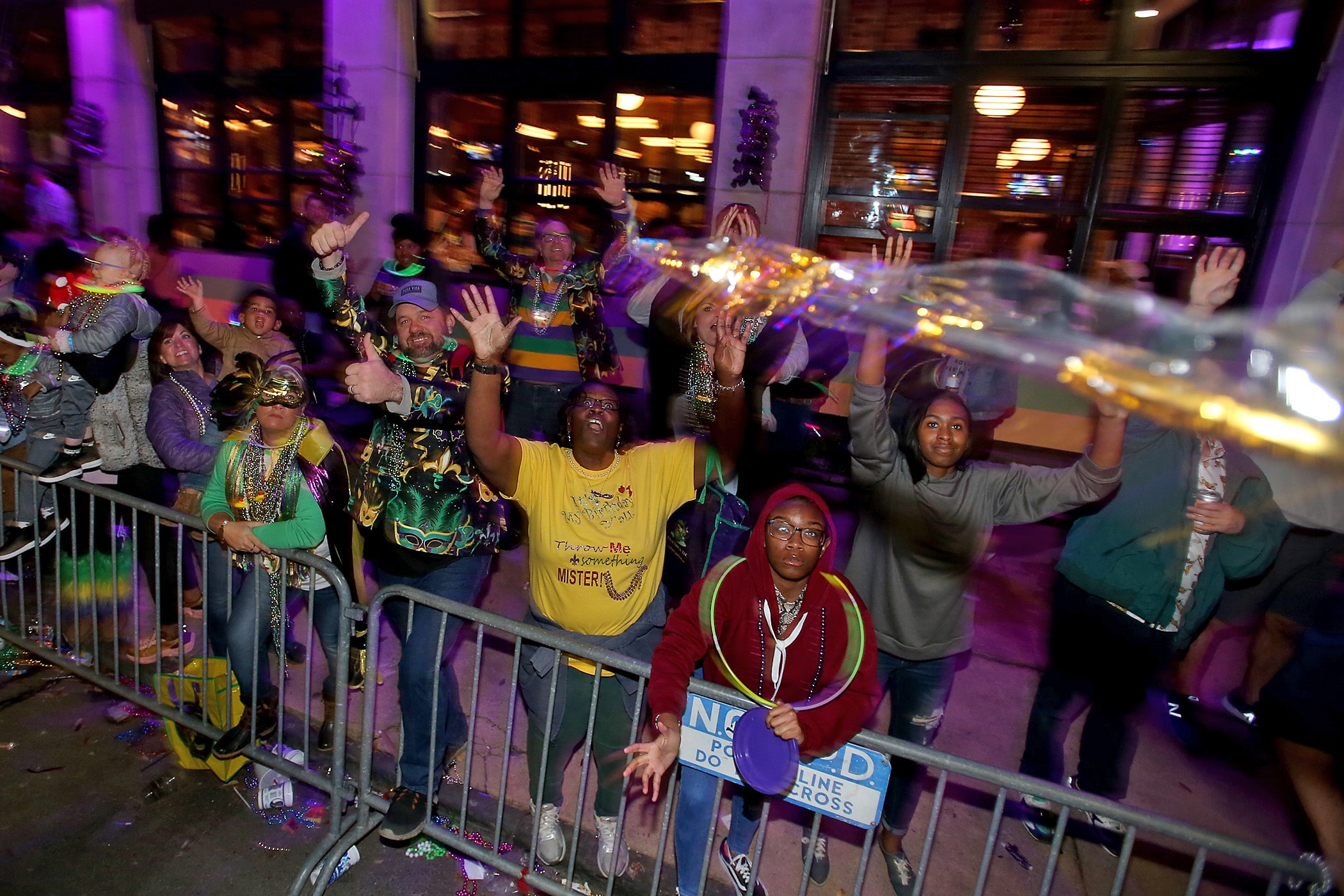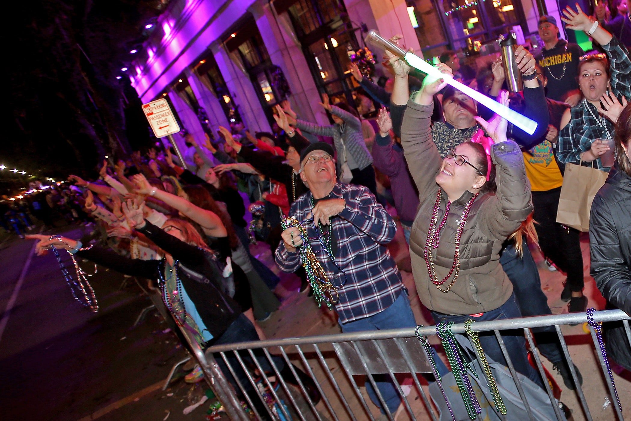 The crowd yells for throws as over 350 Knights of Sparta roll down the Uptown parade route with an 18-float parade entitled “On the Street Where You Live”. Fabian Errol Miller reigned as King and Shannon Barbara Garrety was Queen as the krewe presented their 40th annual parade on Saturday, February 15, 2020. (Photo by Michael DeMocker)