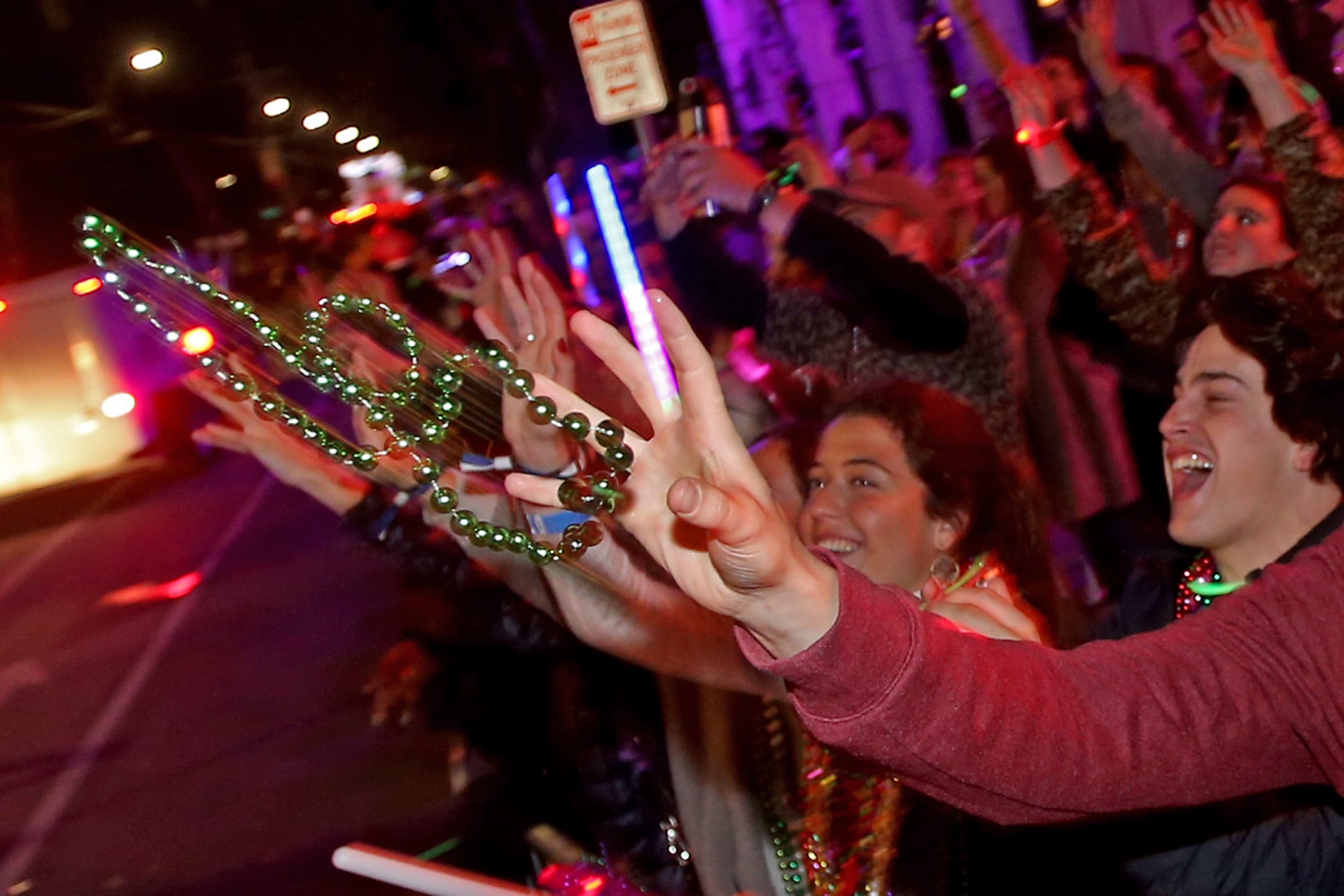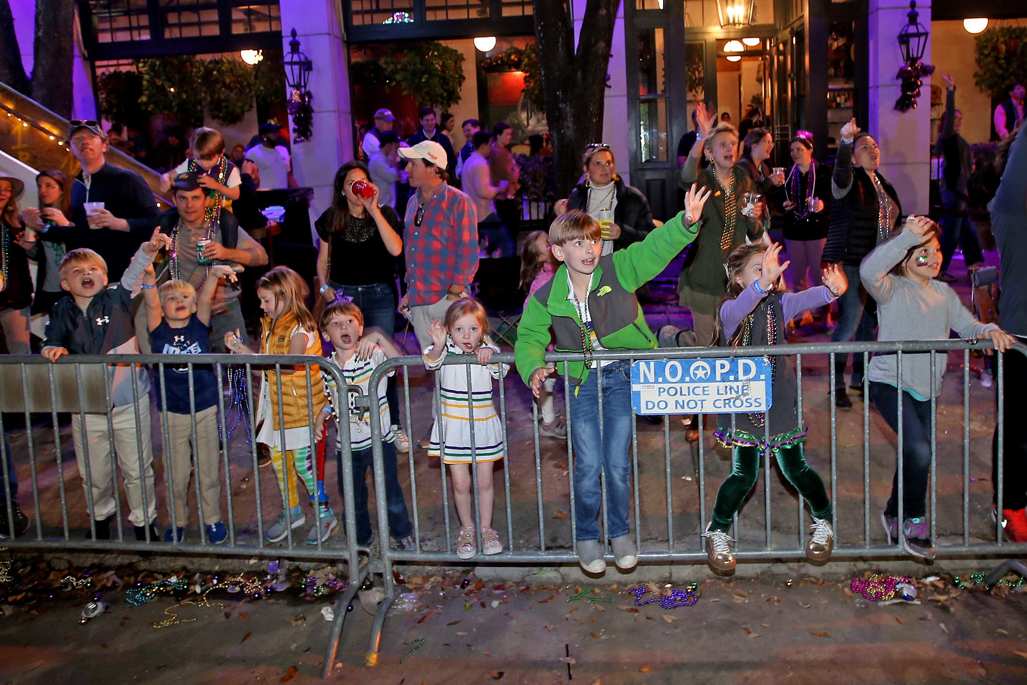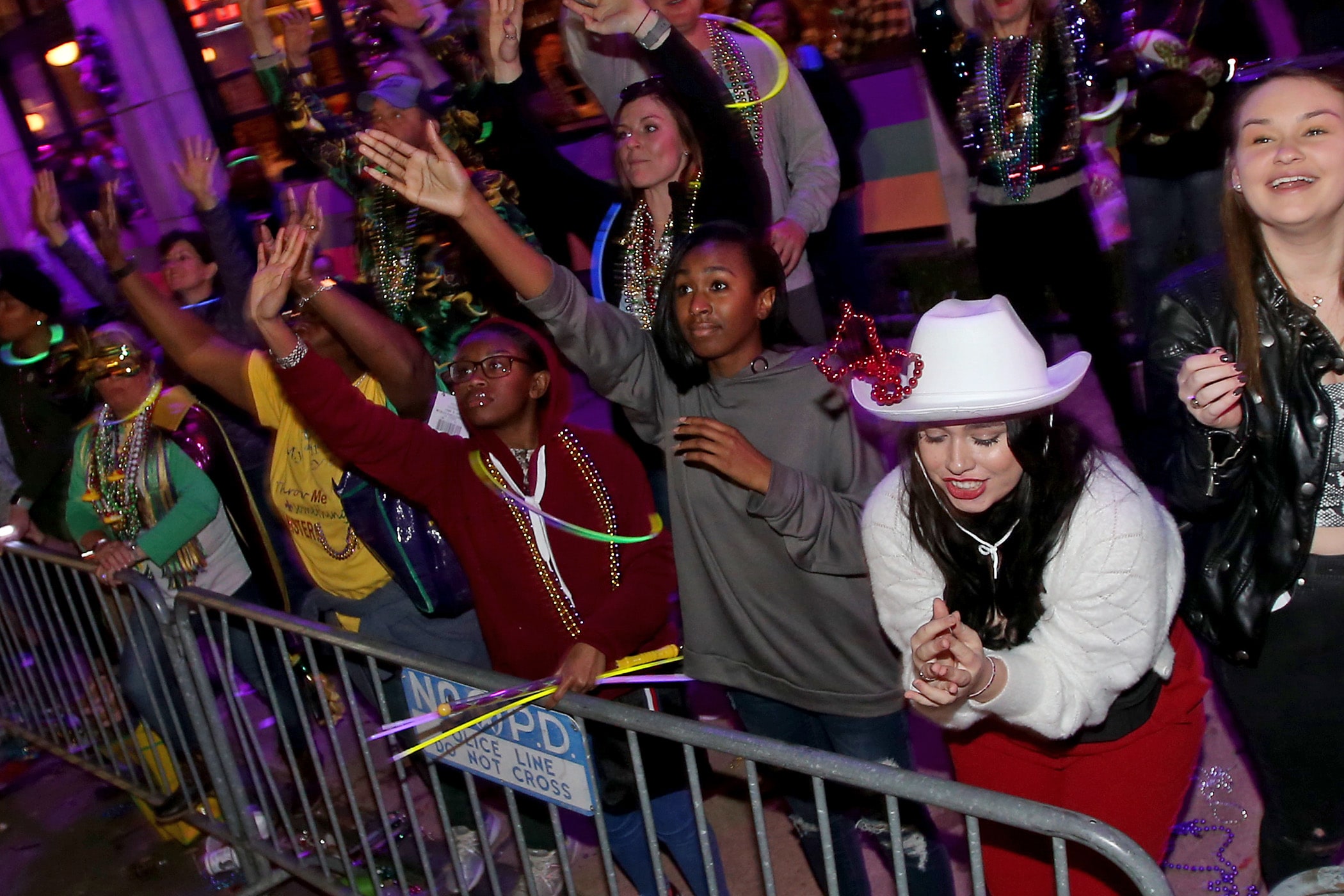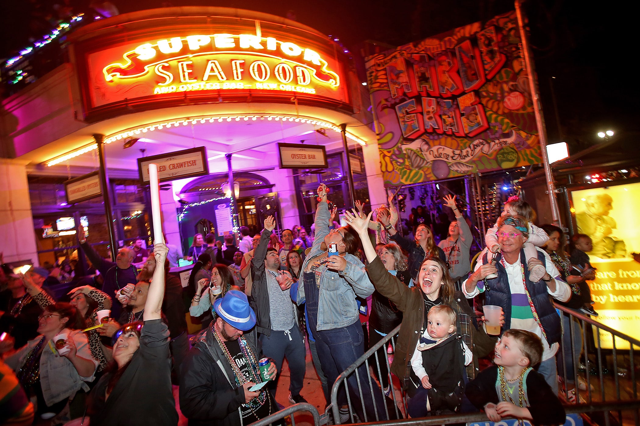 The crowd yells for throws as over 350 Knights of Sparta roll down the Uptown parade route with an 18-float parade entitled “On the Street Where You Live”. Fabian Errol Miller reigned as King and Shannon Barbara Garrety was Queen as the krewe presented their 40th annual parade on Saturday, February 15, 2020. (Photo by Michael DeMocker)