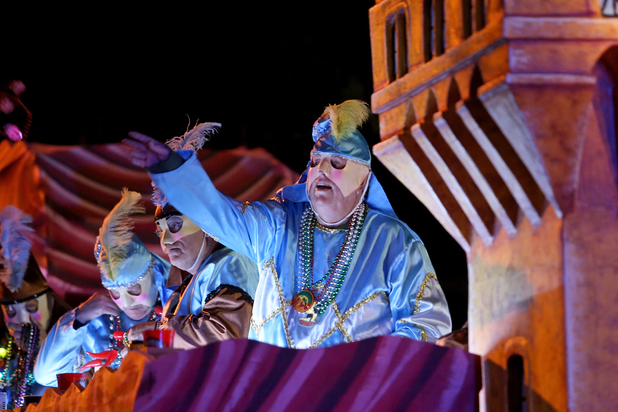A rider throws beads on St. Charles Avenue as the 550 members of Pygmalion roll down the Uptown parade route with an Italy-themed 25-float parade entitled “Viaggia in Italia”. Cary Oswald reigned as King Pygmalion and Kalli Mercer was Queen Pygmalion as the krewe presented their 21st annual parade on Saturday, February 15, 2020. (Photo by Michael DeMocker)