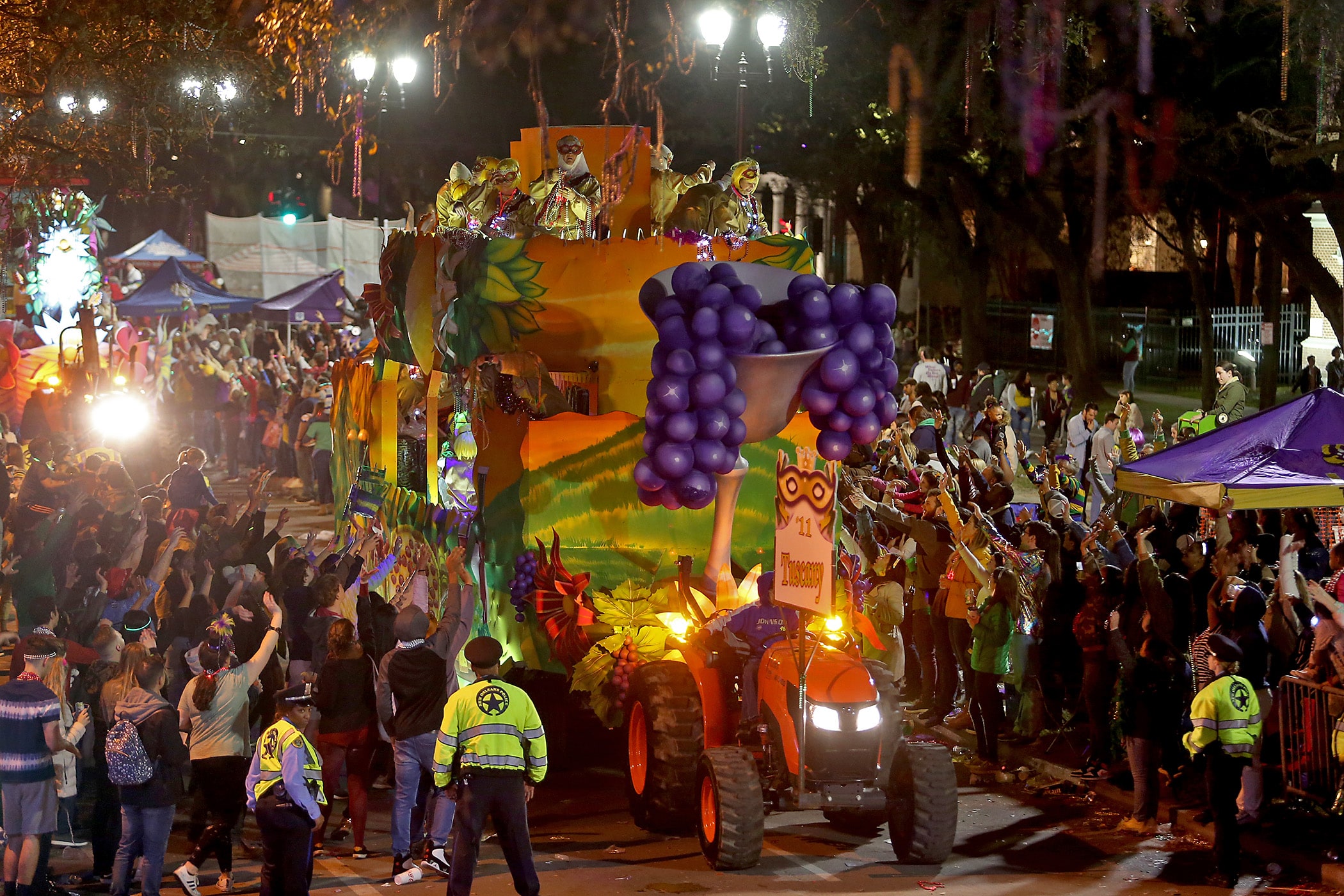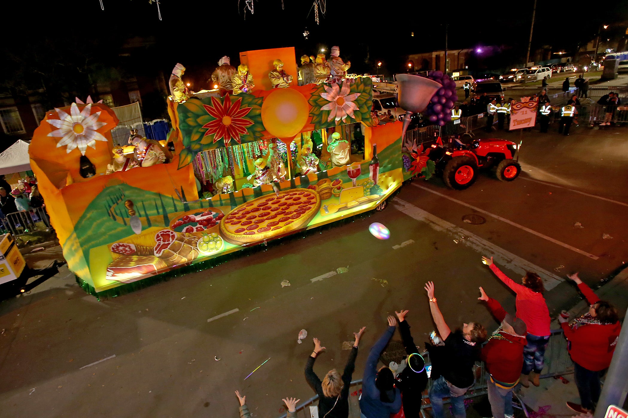 The “Tuscany” float makes it way down Napoleon Avenue as the 550 members of Pygmalion roll down the Uptown parade route with an Italy-themed 25-float parade entitled “Viaggia in Italia”. Cary Oswald reigned as King Pygmalion and Kalli Mercer was Queen Pygmalion as the krewe presented their 21st annual parade on Saturday, February 15, 2020. (Photo by Michael DeMocker)