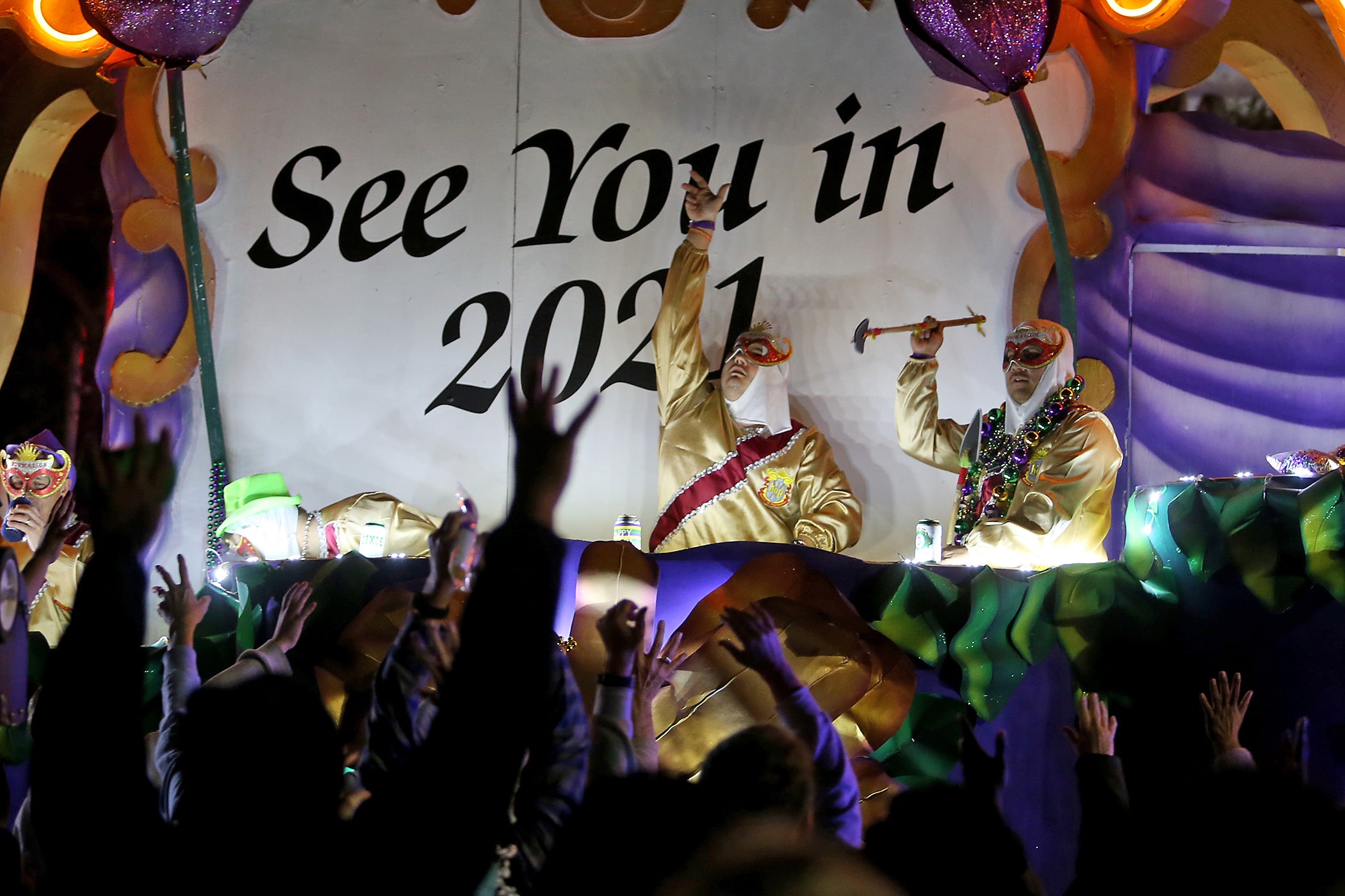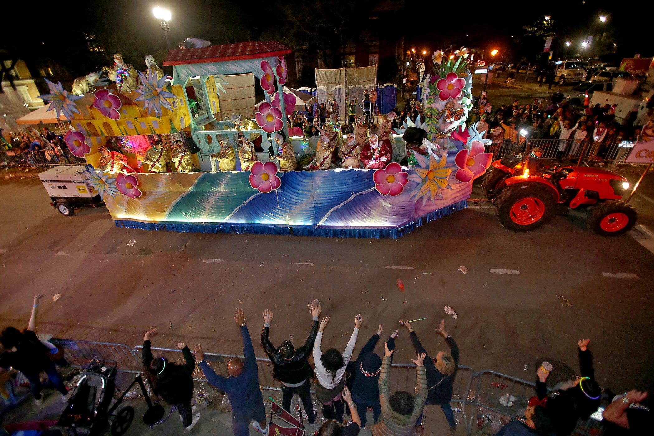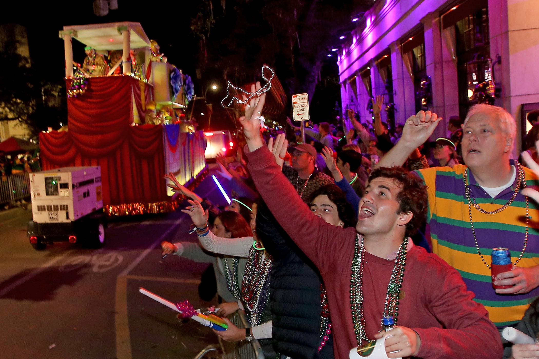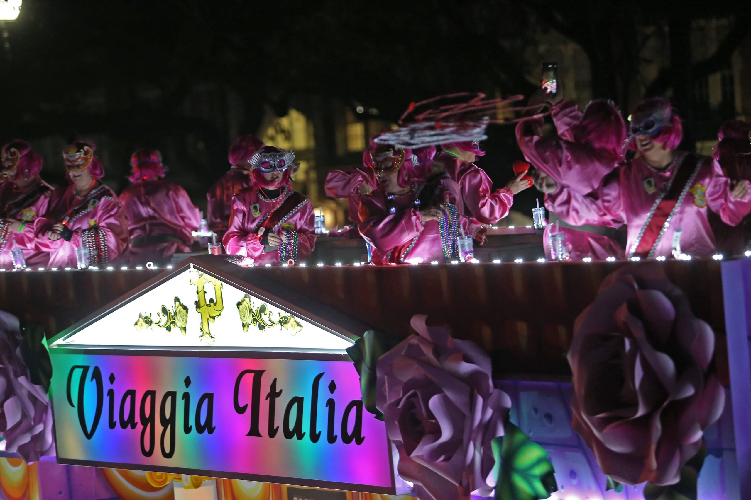 The 550 members of Pygmalion toss beads to the crowd as they roll down the Uptown parade route with an Italy-themed 25-float parade entitled “Viaggia in Italia”. Cary Oswald reigned as King Pygmalion and Kalli Mercer was Queen Pygmalion as the krewe presented their 21st annual parade on Saturday, February 15, 2020. (Photo by Michael DeMocker)
