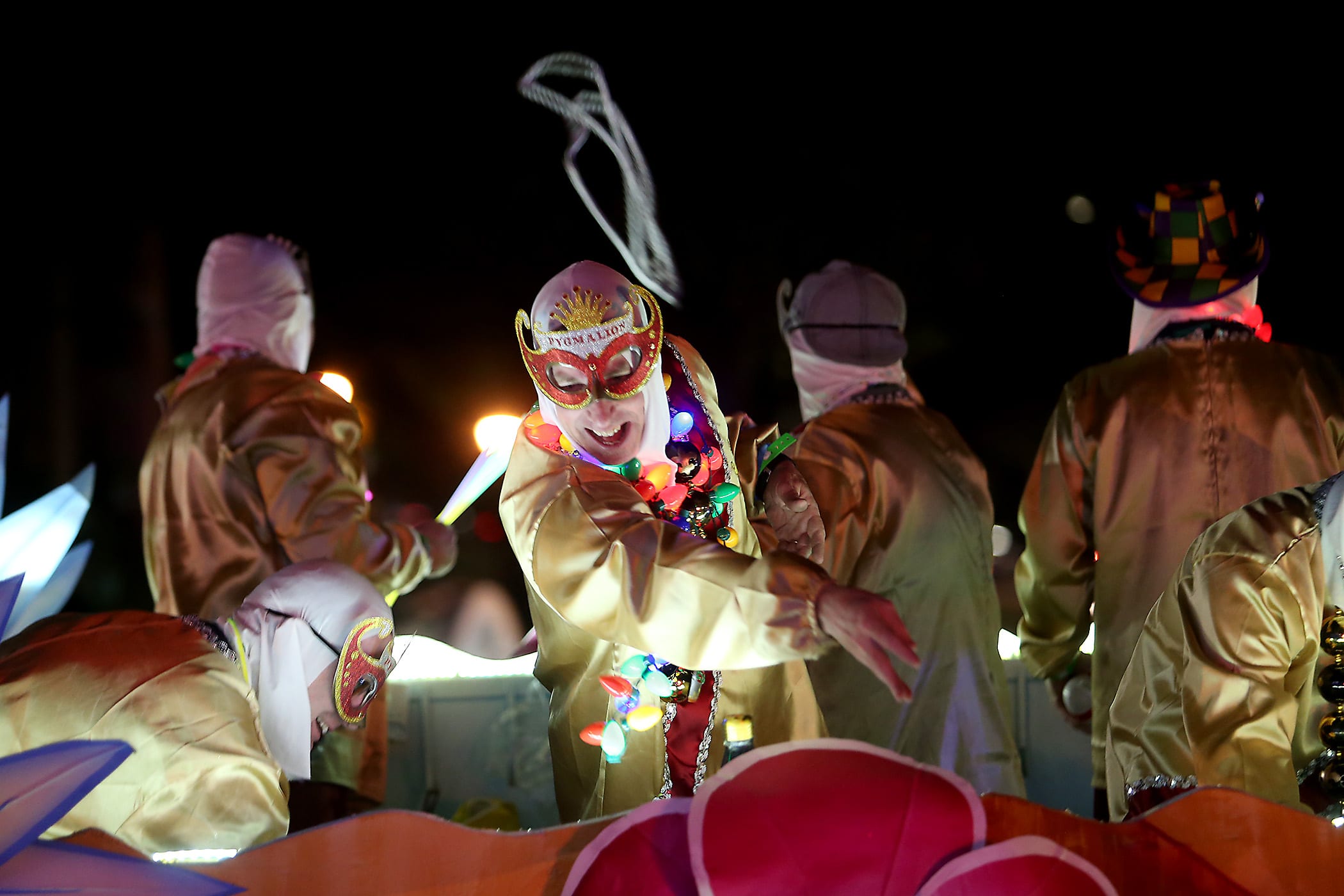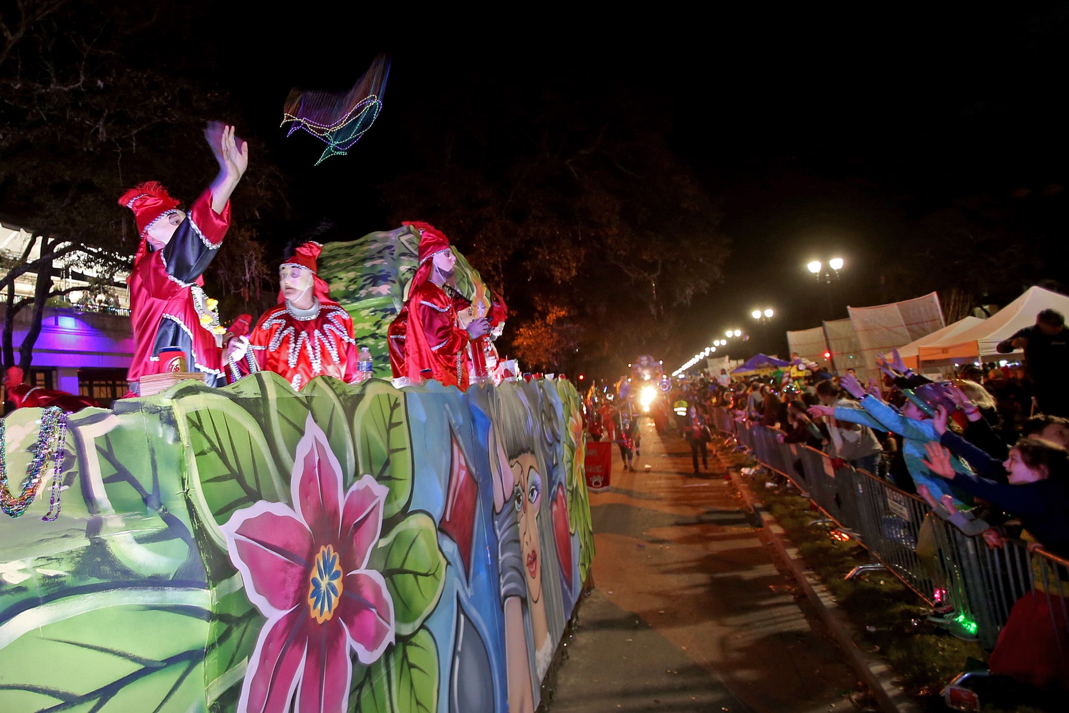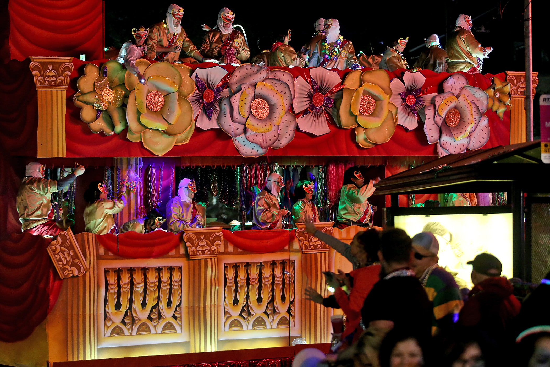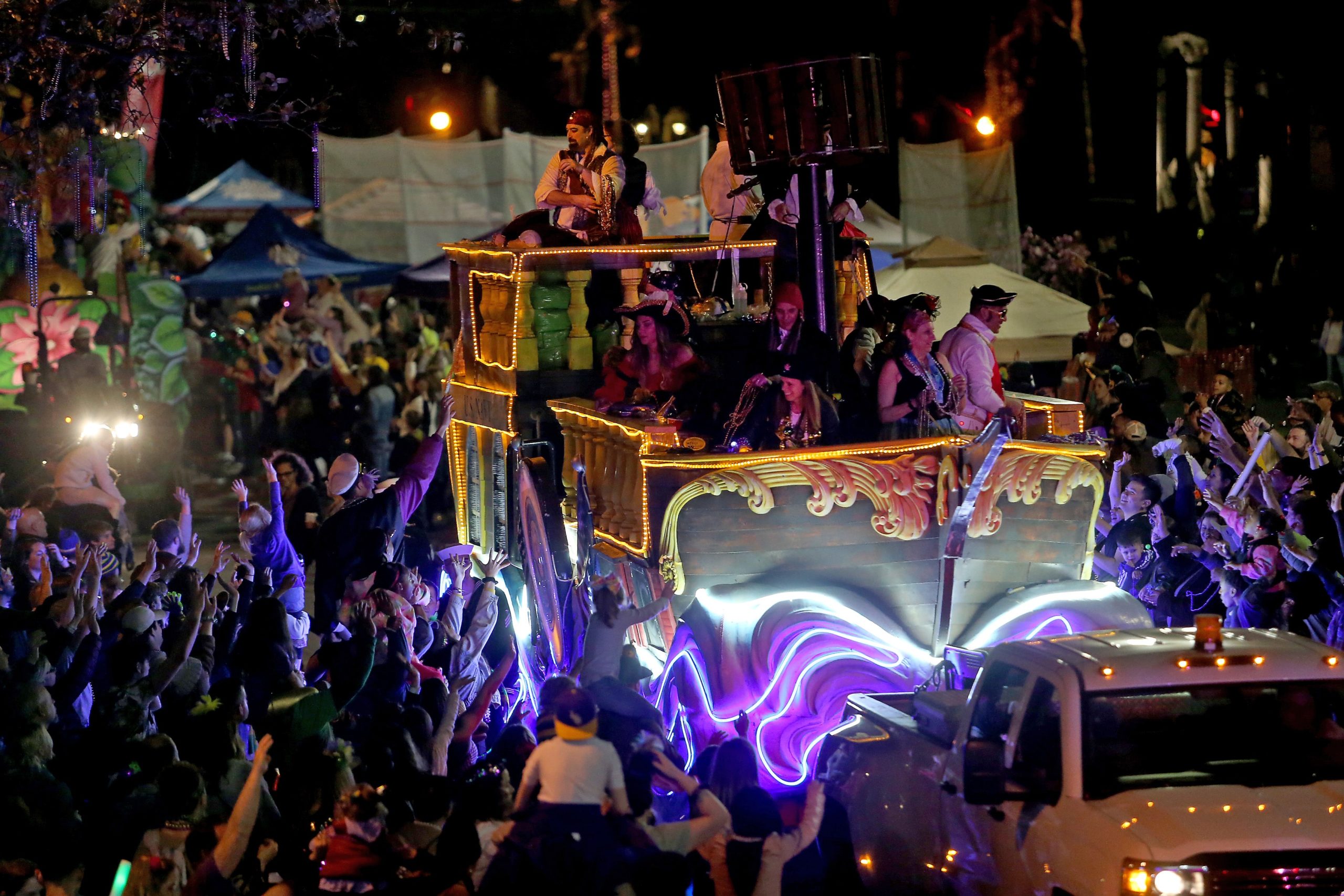 The 550 members of Pygmalion toss beads to the crowd as they roll down the Uptown parade route with an Italy-themed 25-float parade entitled “Viaggia in Italia”. Cary Oswald reigned as King Pygmalion and Kalli Mercer was Queen Pygmalion as the krewe presented their 21st annual parade on Saturday, February 15, 2020. (Photo by Michael DeMocker)