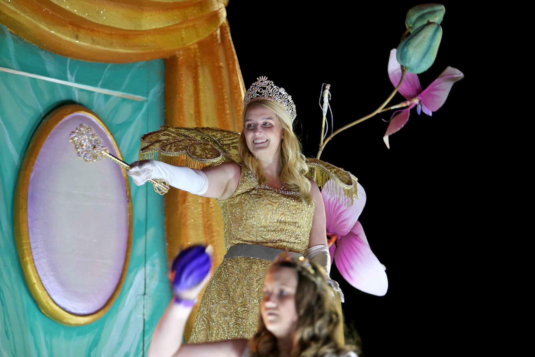 The Queen greets her subjects as the 550 members of Pygmalion roll down the Uptown parade route with an Italy-themed 25-float parade entitled “Viaggia in Italia”. Cary Oswald reigned as King Pygmalion and Kalli Mercer was Queen Pygmalion as the krewe presented their 21st annual parade on Saturday, February 15, 2020. (Photo by Michael DeMocker)