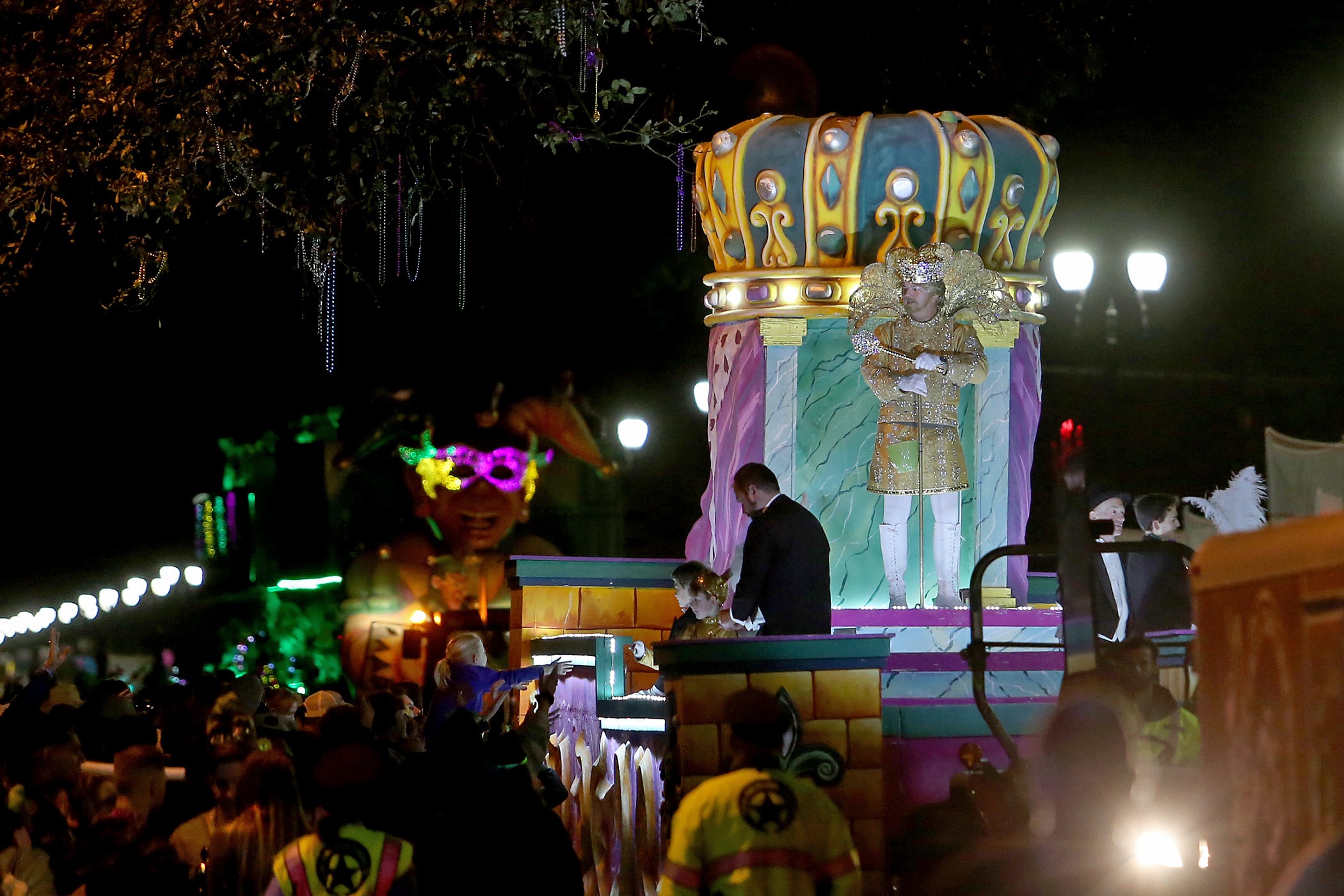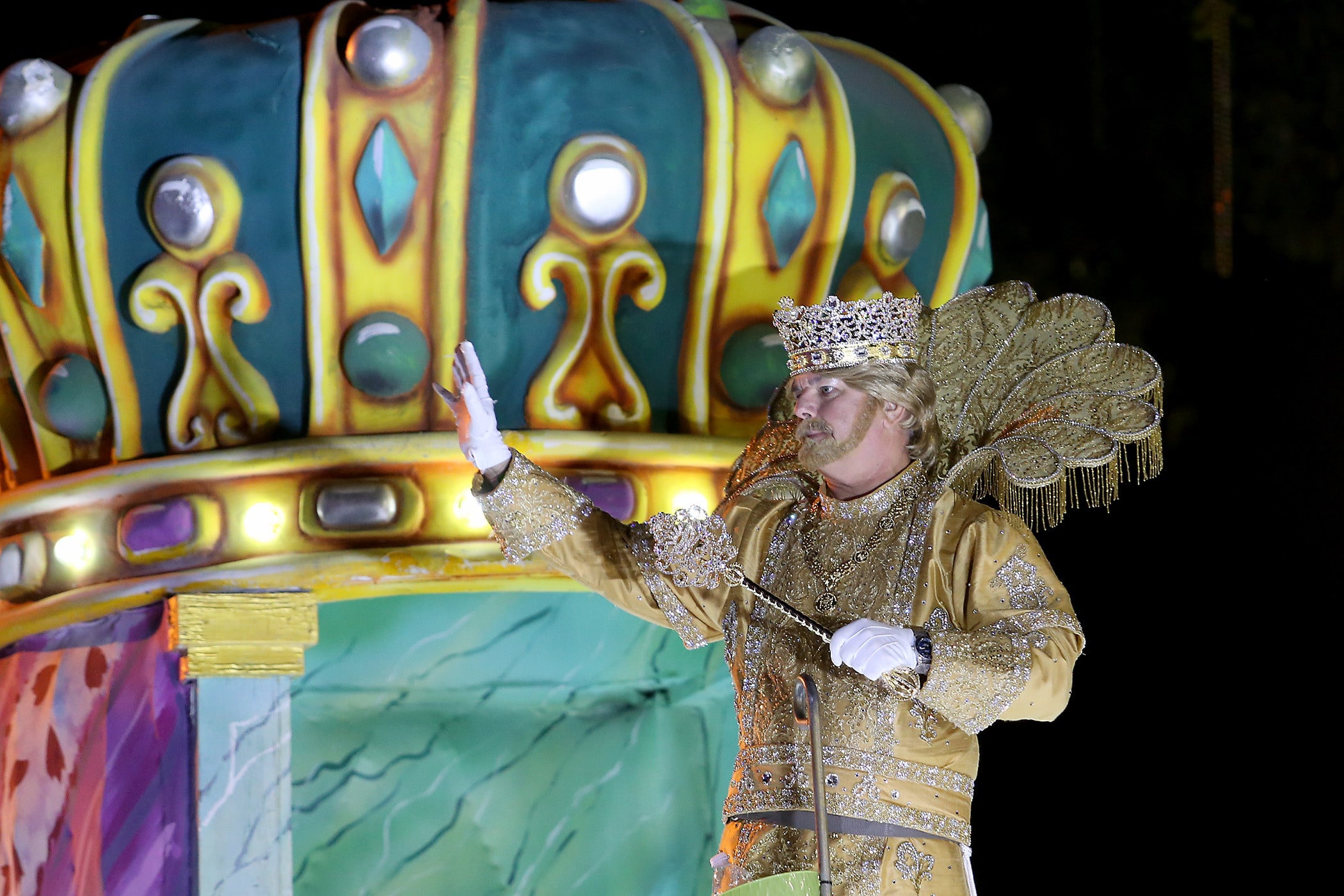 The King greets the crowd as over 350 Knights of Sparta roll down the Uptown parade route with an 18-float parade entitled “On the Street Where You Live”. Fabian Errol Miller reigned as King and Shannon Barbara Garrety was Queen as the krewe presented their 40th annual parade on Saturday, February 15, 2020. (Photo by Michael DeMocker)