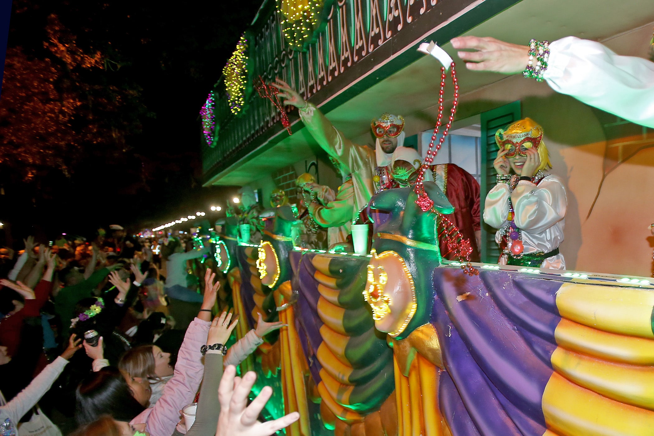 Beads are caught on St. Charles Avenue as the 550 members of Pygmalion roll down the Uptown parade route with an Italy-themed 25-float parade entitled “Viaggia in Italia”. Cary Oswald reigned as King Pygmalion and Kalli Mercer was Queen Pygmalion as the krewe presented their 21st annual parade on Saturday, February 15, 2020. (Photo by Michael DeMocker)
