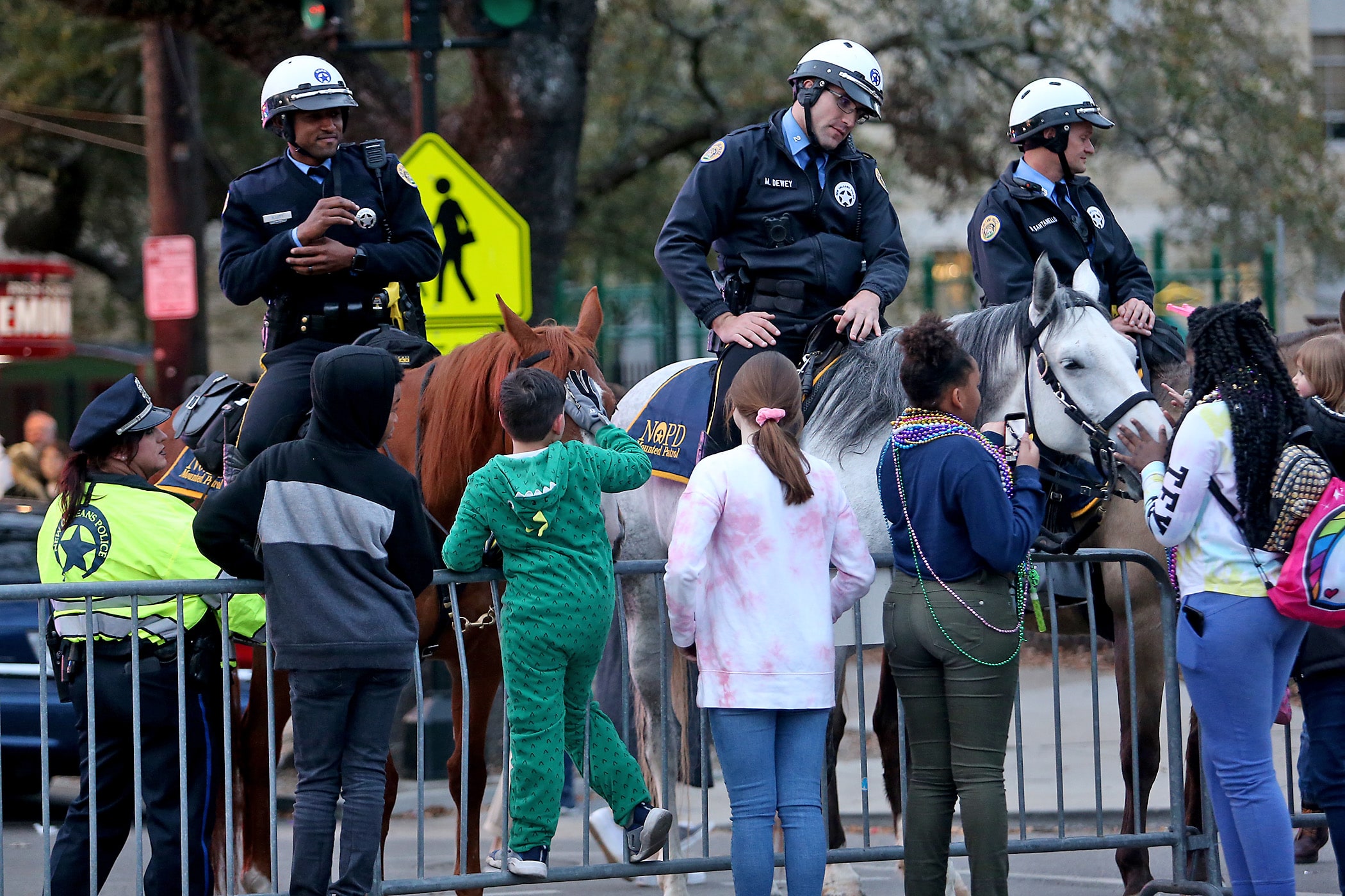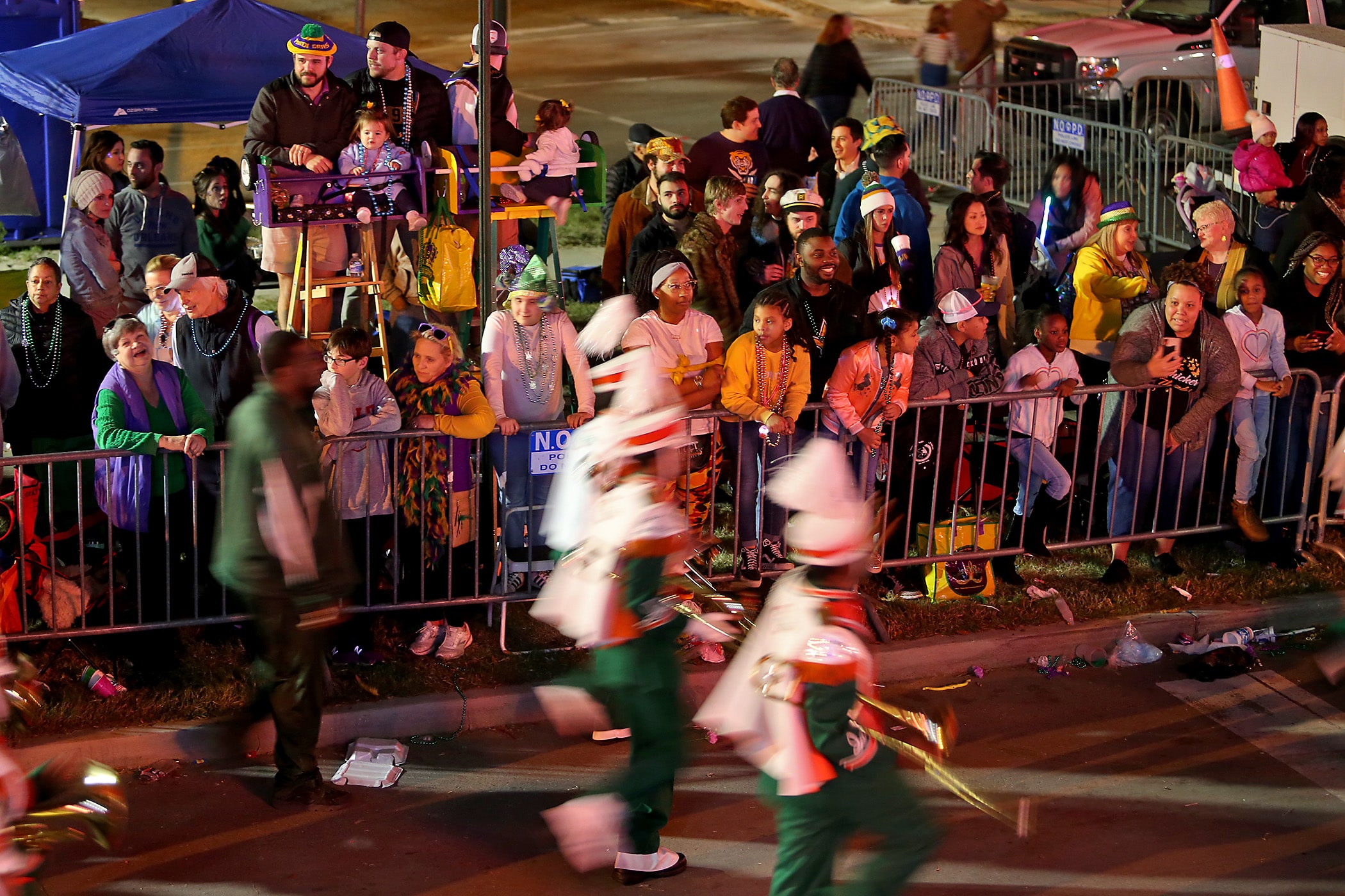 The crowd watches the Carver marching band pass as the 550 members of Pygmalion roll down the Uptown parade route with an Italy-themed 25-float parade entitled “Viaggia in Italia”. Cary Oswald reigned as King Pygmalion and Kalli Mercer was Queen Pygmalion as the krewe presented their 21st annual parade on Saturday, February 15, 2020. (Photo by Michael DeMocker)