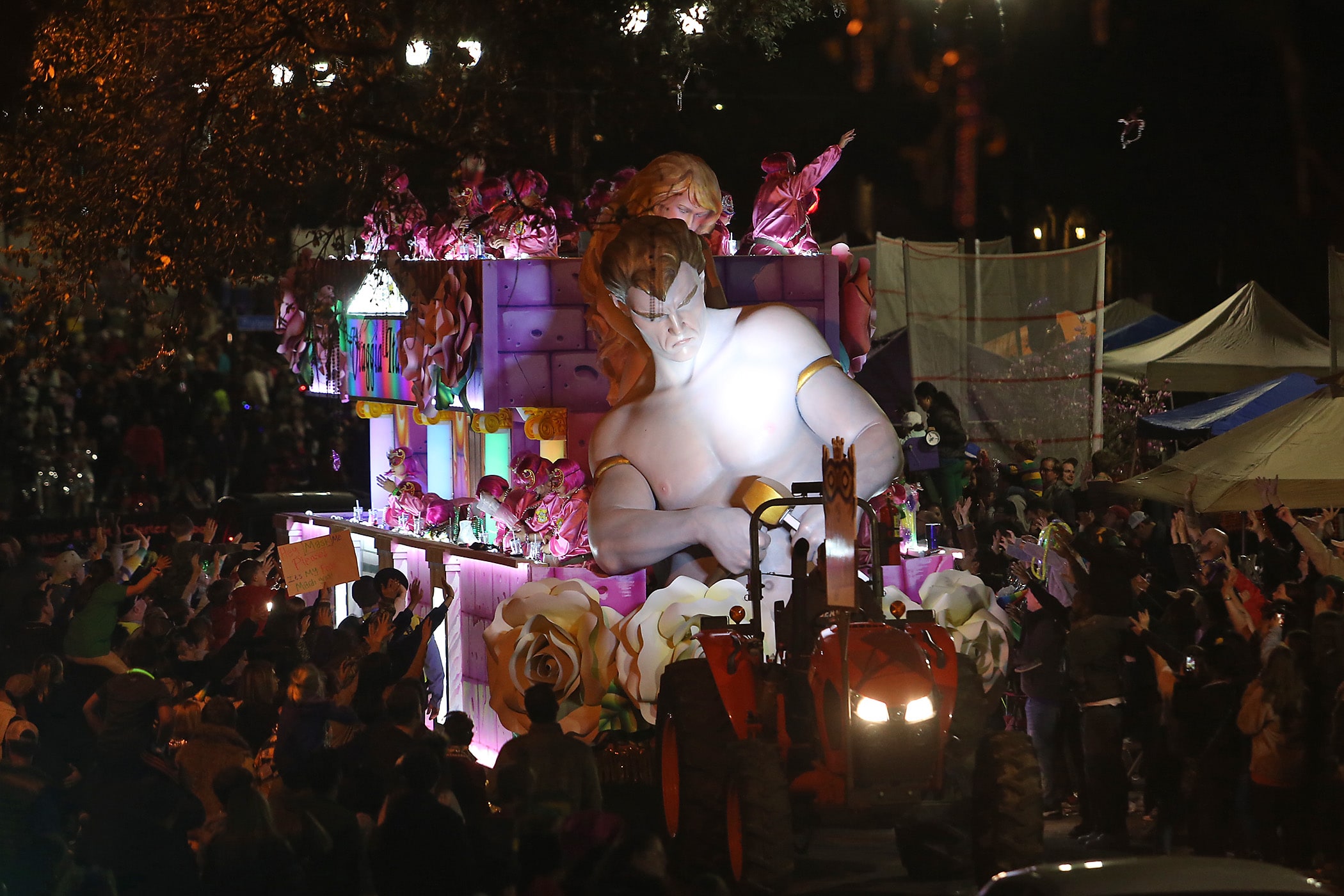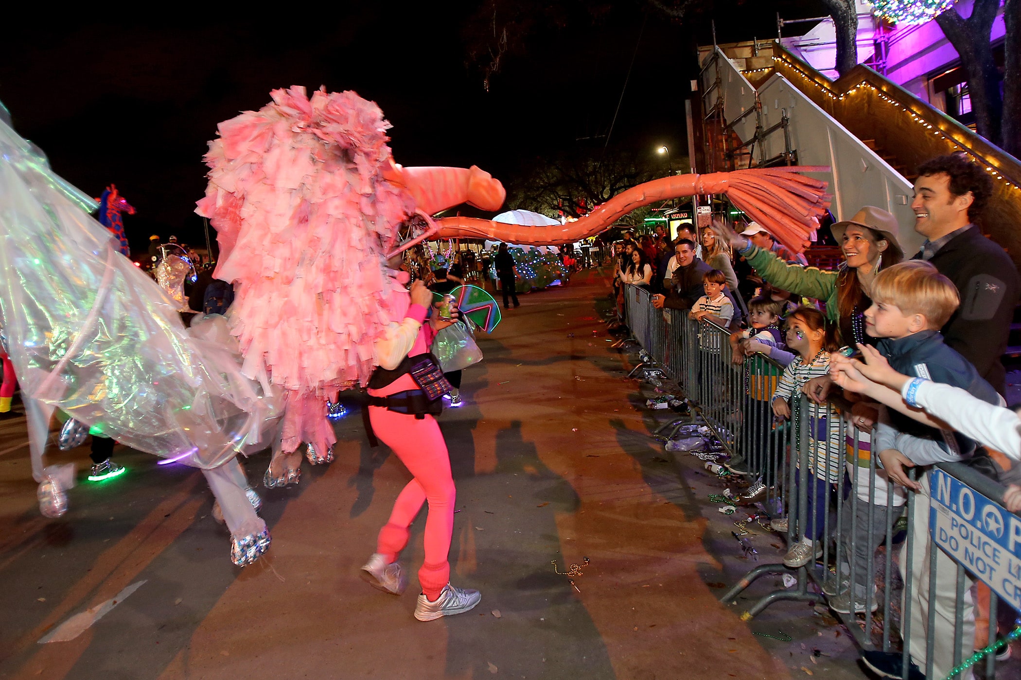 A mythical creature entertains the crowd on Napoleon Avenue as the 550 members of Pygmalion roll down the Uptown parade route with an Italy-themed 25-float parade entitled “Viaggia in Italia”. Cary Oswald reigned as King Pygmalion and Kalli Mercer was Queen Pygmalion as the krewe presented their 21st annual parade on Saturday, February 15, 2020. (Photo by Michael DeMocker)