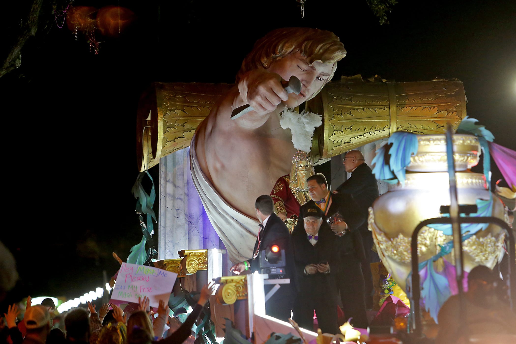 Throws are caught at St. Charles and Napoleon Avenues as the 550 members of Pygmalion roll down the Uptown parade route with an Italy-themed 25-float parade entitled “Viaggia in Italia”. Cary Oswald reigned as King Pygmalion and Kalli Mercer was Queen Pygmalion as the krewe presented their 21st annual parade on Saturday, February 15, 2020. (Photo by Michael DeMocker)