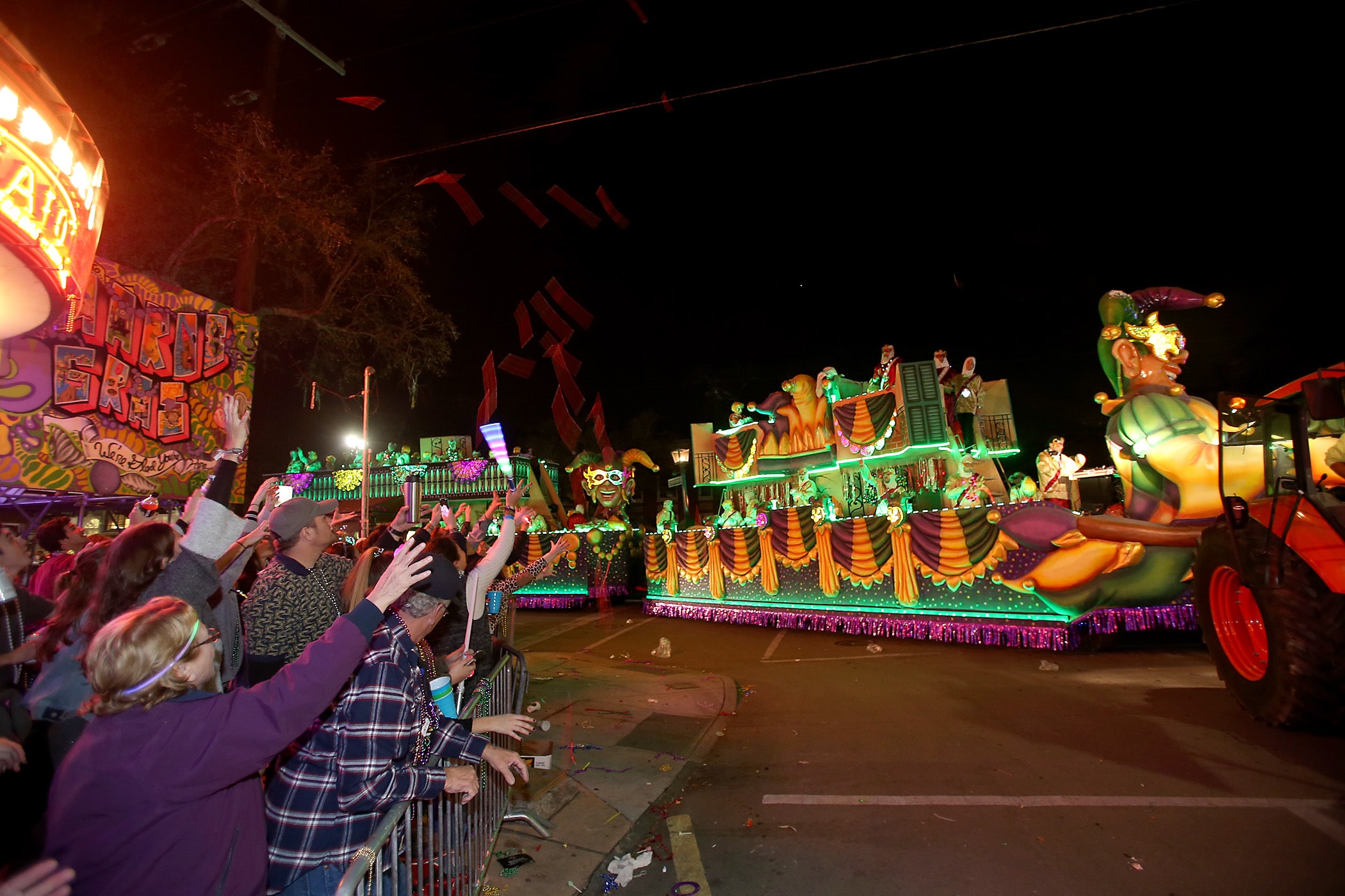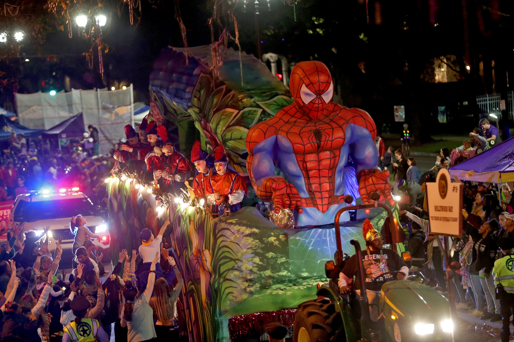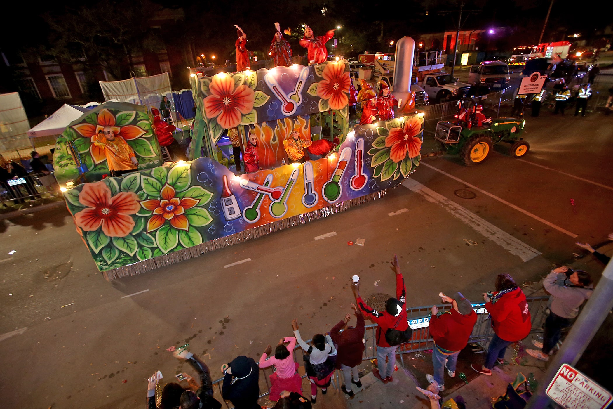 The “State Line Road” float makes its way down Napoleon Avenue as over 350 Knights of Sparta roll down the Uptown parade route with an 18-float parade entitled “On the Street Where You Live”. Fabian Errol Miller reigned as King and Shannon Barbara Garrety was Queen as the krewe presented their 40th annual parade on Saturday, February 15, 2020. (Photo by Michael DeMocker)