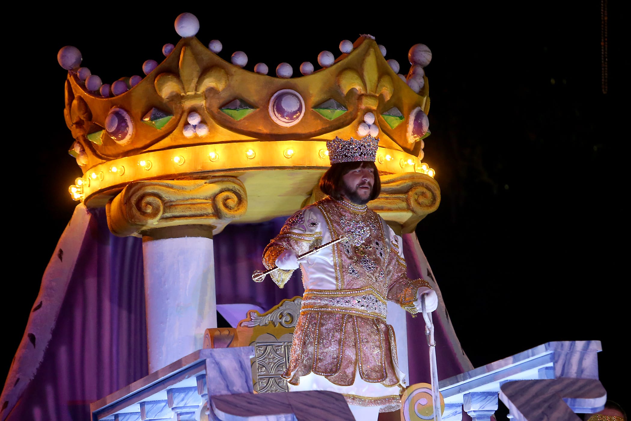The King’s float makes its way down Napoleon Avenue as the 550 members of Pygmalion roll down the Uptown parade route with an Italy-themed 25-float parade entitled “Viaggia in Italia”. Cary Oswald reigned as King Pygmalion and Kalli Mercer was Queen Pygmalion as the krewe presented their 21st annual parade on Saturday, February 15, 2020. (Photo by Michael DeMocker)