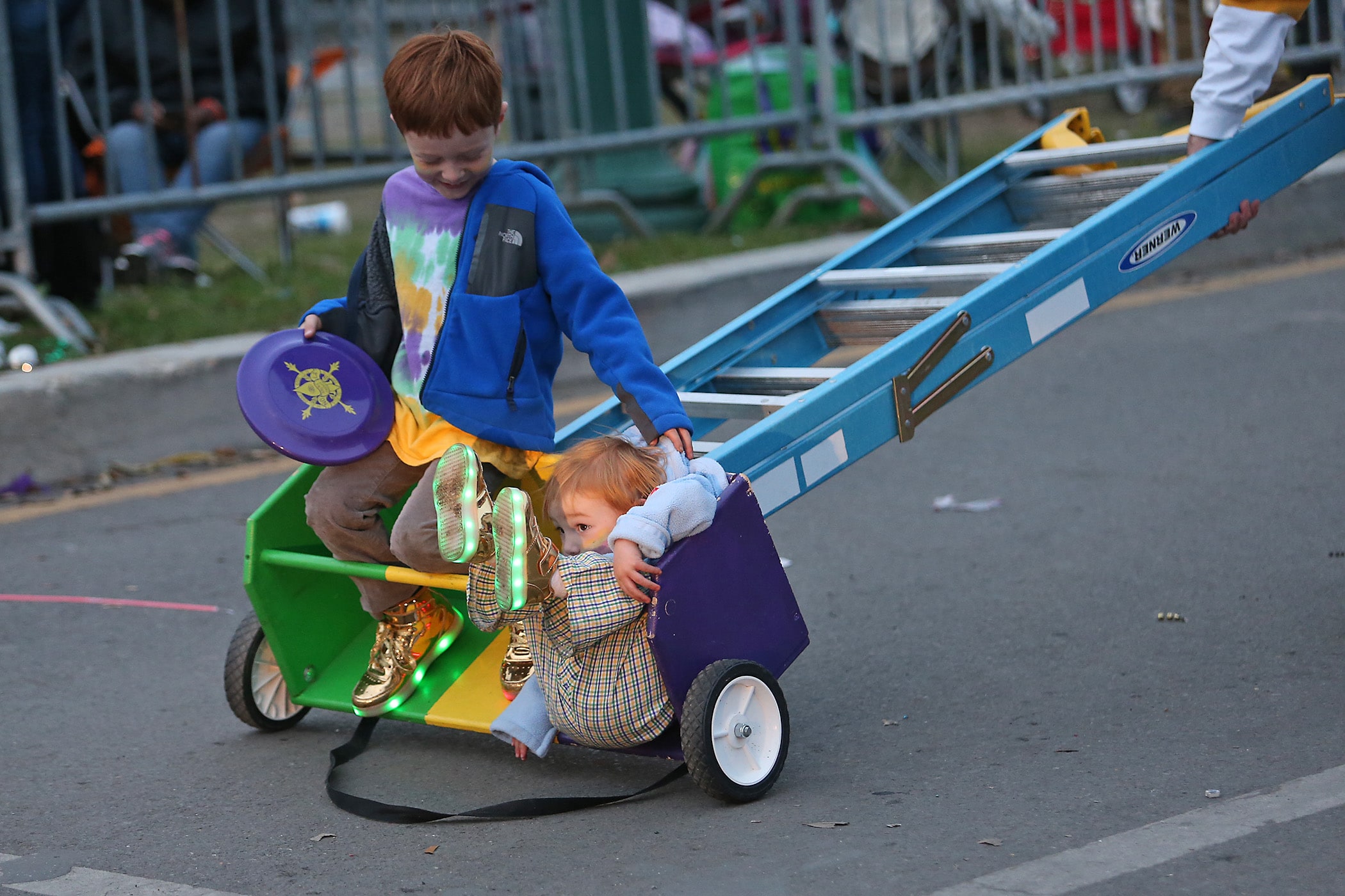 A youngster negotiates riding in his ladder before over 350 Knights of Sparta roll down the Uptown parade route with an 18-float parade entitled “On the Street Where You Live”. Fabian Errol Miller reigned as King and Shannon Barbara Garrety was Queen as the krewe presented their 40th annual parade on Saturday, February 15, 2020. (Photo by Michael DeMocker)