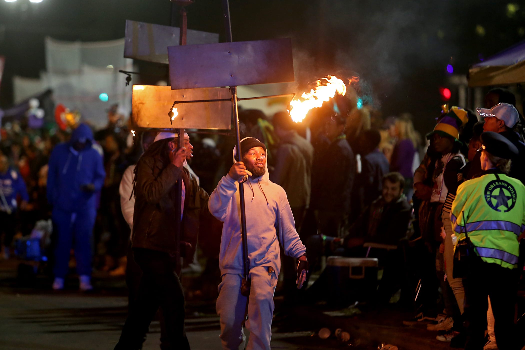 A flambeaux carrier lights the way as over 350 Knights of Sparta roll down the Uptown parade route with an 18-float parade entitled “On the Street Where You Live”. Fabian Errol Miller reigned as King and Shannon Barbara Garrety was Queen as the krewe presented their 40th annual parade on Saturday, February 15, 2020. (Photo by Michael DeMocker)