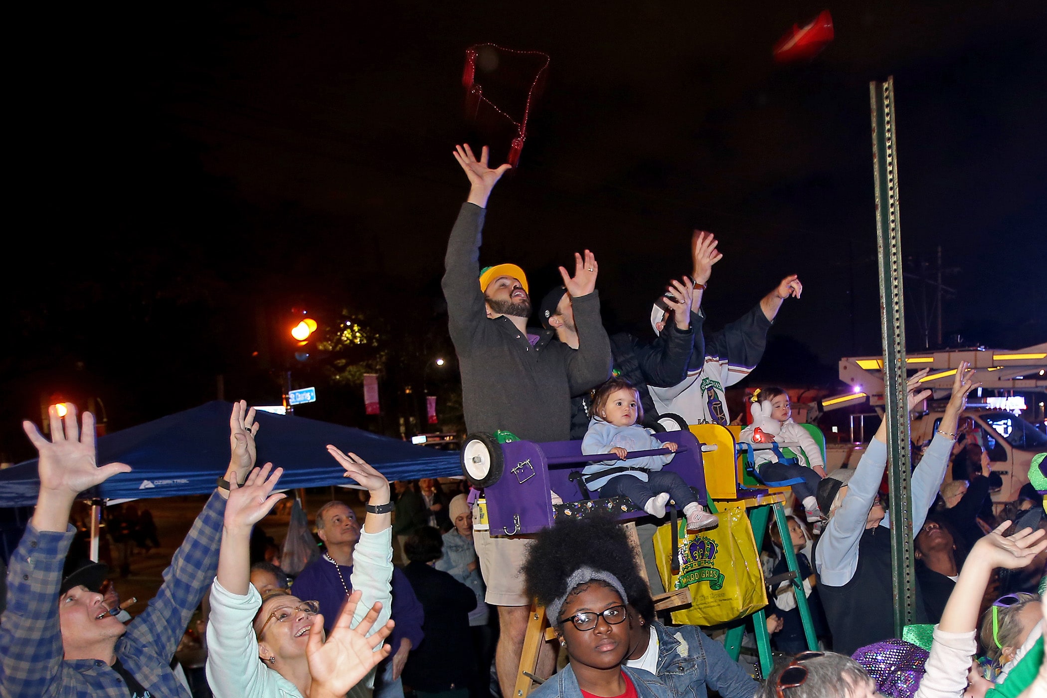 Revelers catch throws as over 350 Knights of Sparta roll down the Uptown parade route with an 18-float parade entitled “On the Street Where You Live”. Fabian Errol Miller reigned as King and Shannon Barbara Garrety was Queen as the krewe presented their 40th annual parade on Saturday, February 15, 2020. (Photo by Michael DeMocker)