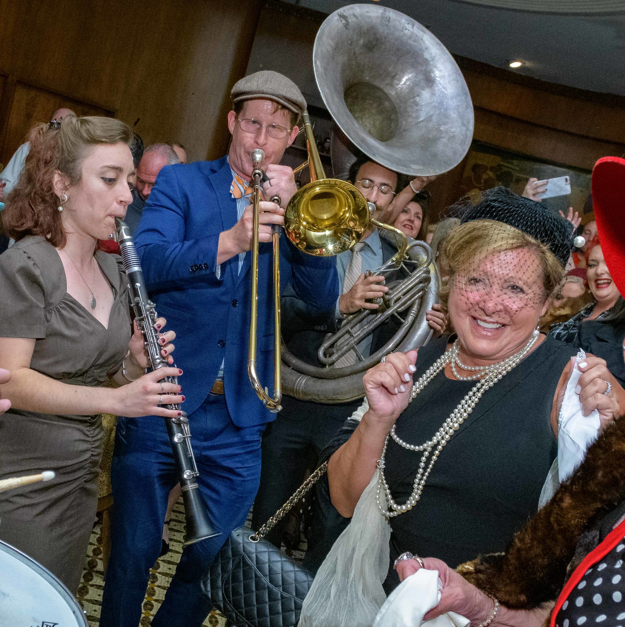Women commemorate the 70th anniversary of the Stormin of the Sazerac bar at the Roosevelt Hotel in New Orleans, September 20, 2019. The Sazerac bar excluded women except on Mardi Gras until September 26, 1949 when women stormed the bar. The event was celebrated first with a luncheon and fashion show at the Blue Room before the group of women second lined to the Sazerac bar with music by the Twisty River Band. WDSU anchor Charles Divins hosted and WDSU Chief Meteorologist Margaret Orr, who was the reigning Spirit of the Sazerac, announced this years Spirit as Meaghan Ryan Bonavita, the president of Dress for Success New Orleans that provides women in need with clothing for jobs. Photo by Matthew Hinton