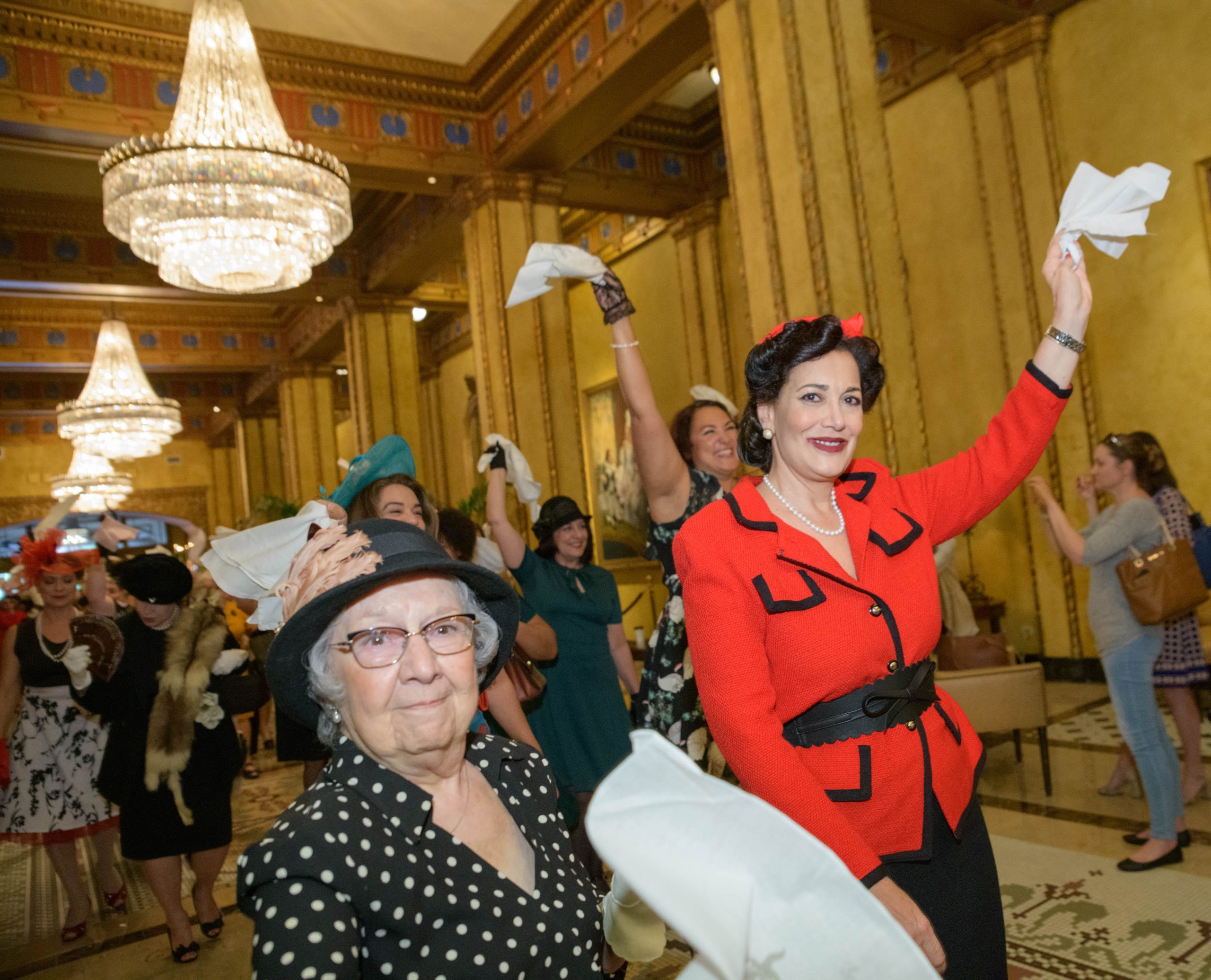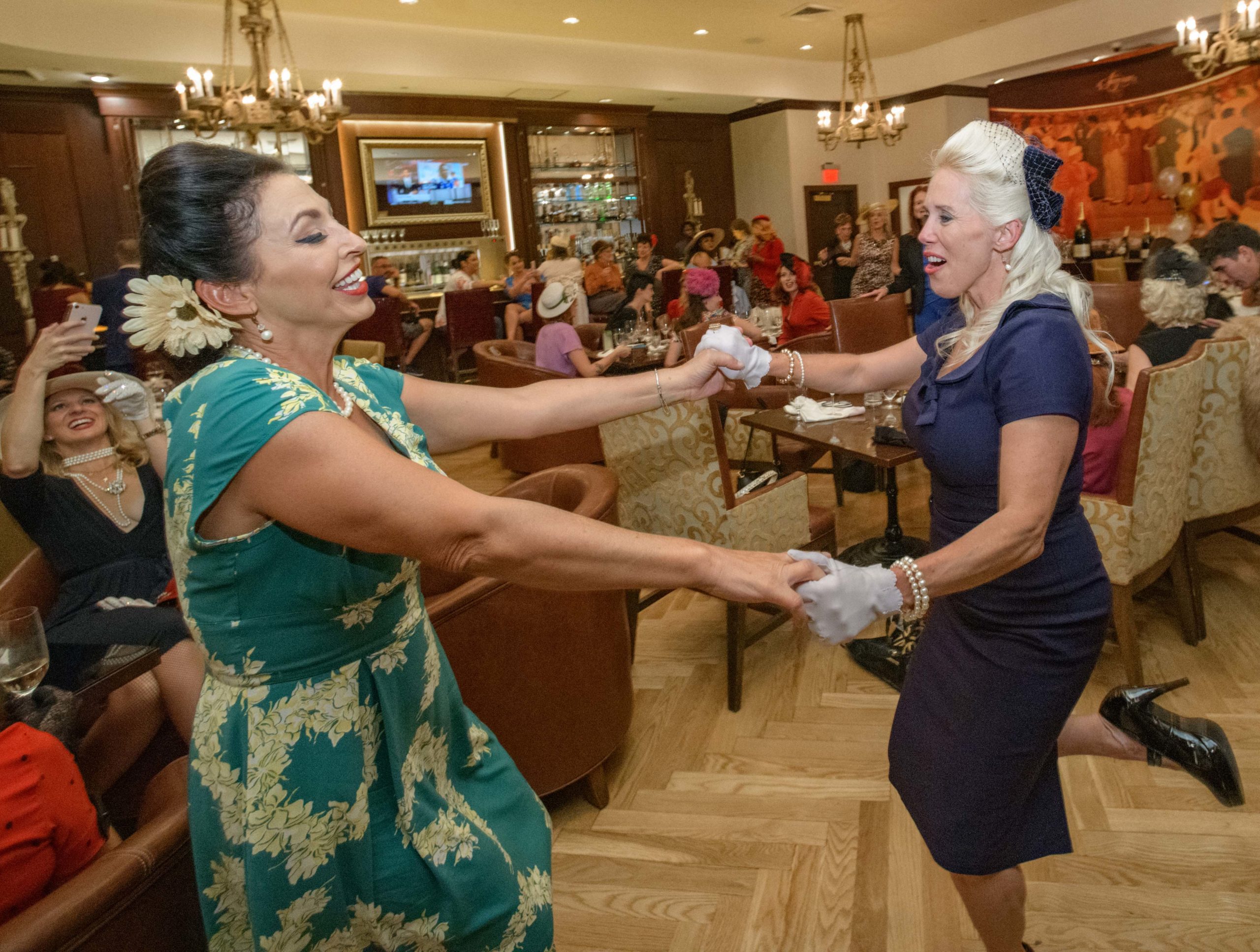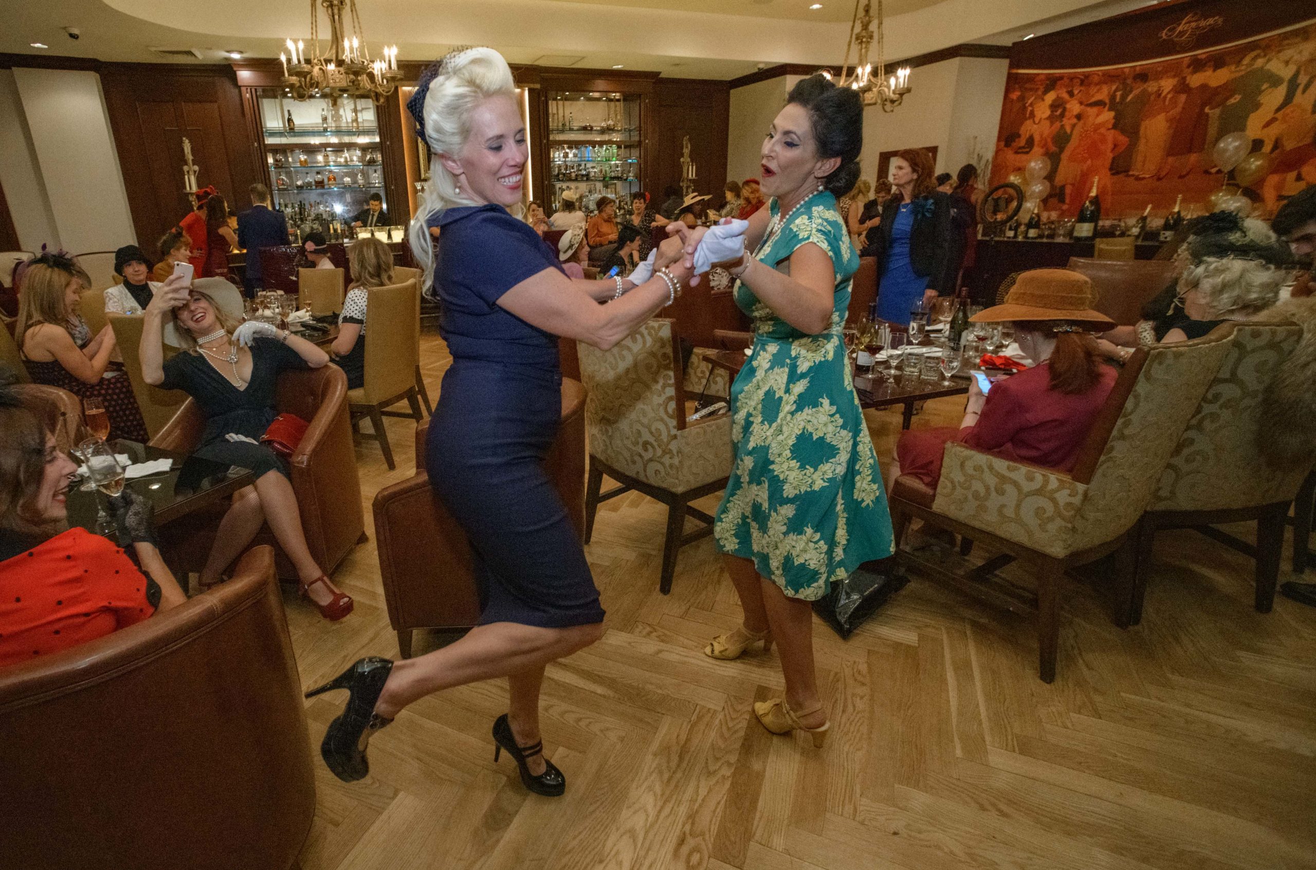 Krista Marz, right, and Nicole Cosse dance as they commemorate the 70th anniversary of the Stormin of the Sazerac bar at the Roosevelt Hotel in New Orleans, September 20, 2019. The Sazerac bar excluded women except on Mardi Gras until September 26, 1949 when women stormed the bar. The event was celebrated first with a luncheon and fashion show at the Blue Room before the group of women second lined to the Sazerac bar with music by the Twisty River Band. WDSU anchor Charles Divins hosted and WDSU Chief Meteorologist Margaret Orr, who was the reigning Spirit of the Sazerac, announced this years Spirit as Meaghan Ryan Bonavita, the president of Dress for Success New Orleans that provides women in need with clothing for jobs. Photo by Matthew Hinton