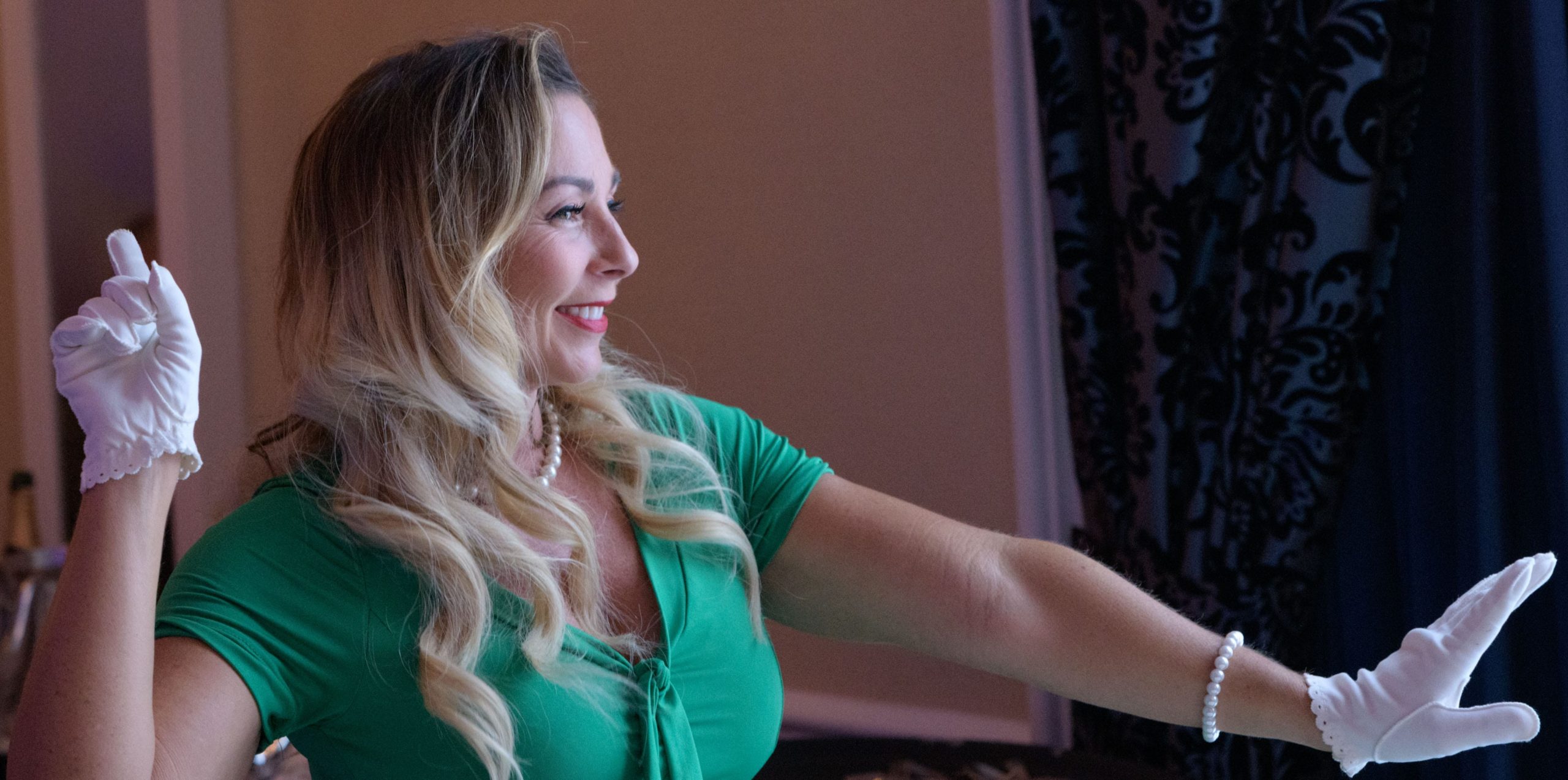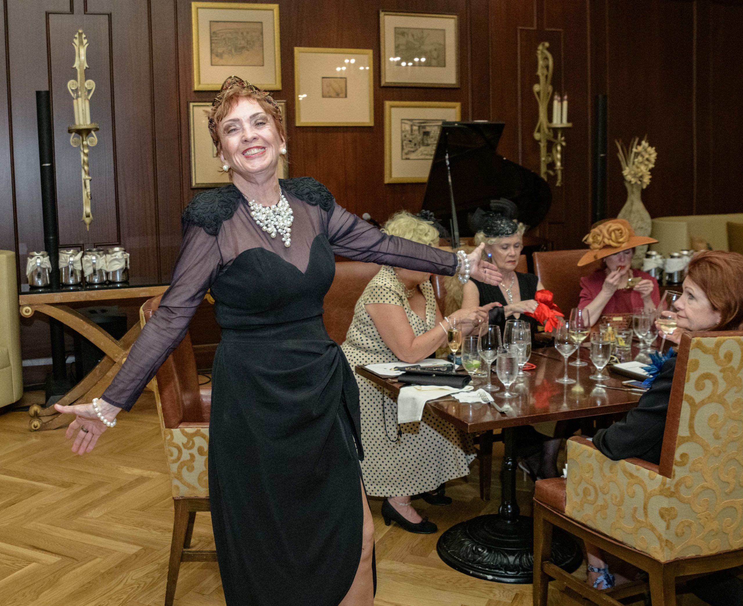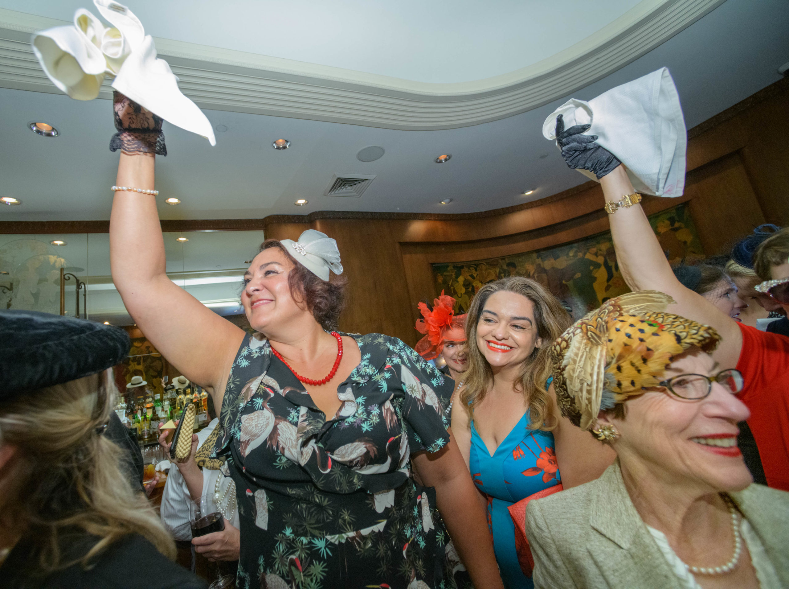 Krista Marz, right, and Nicole Cosse dance as they commemorate the 70th anniversary of the Stormin of the Sazerac bar at the Roosevelt Hotel in New Orleans, September 20, 2019. The Sazerac bar excluded women except on Mardi Gras until September 26, 1949 when women stormed the bar. The event was celebrated first with a luncheon and fashion show at the Blue Room before the group of women second lined to the Sazerac bar with music by the Twisty River Band. WDSU anchor Charles Divins hosted and WDSU Chief Meteorologist Margaret Orr, who was the reigning Spirit of the Sazerac, announced this years Spirit as Meaghan Ryan Bonavita, the president of Dress for Success New Orleans that provides women in need with clothing for jobs. Photo by Matthew Hinton