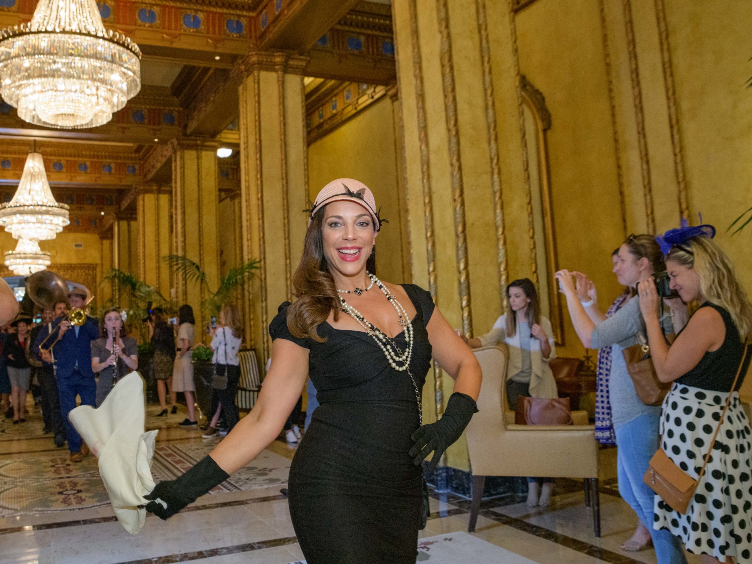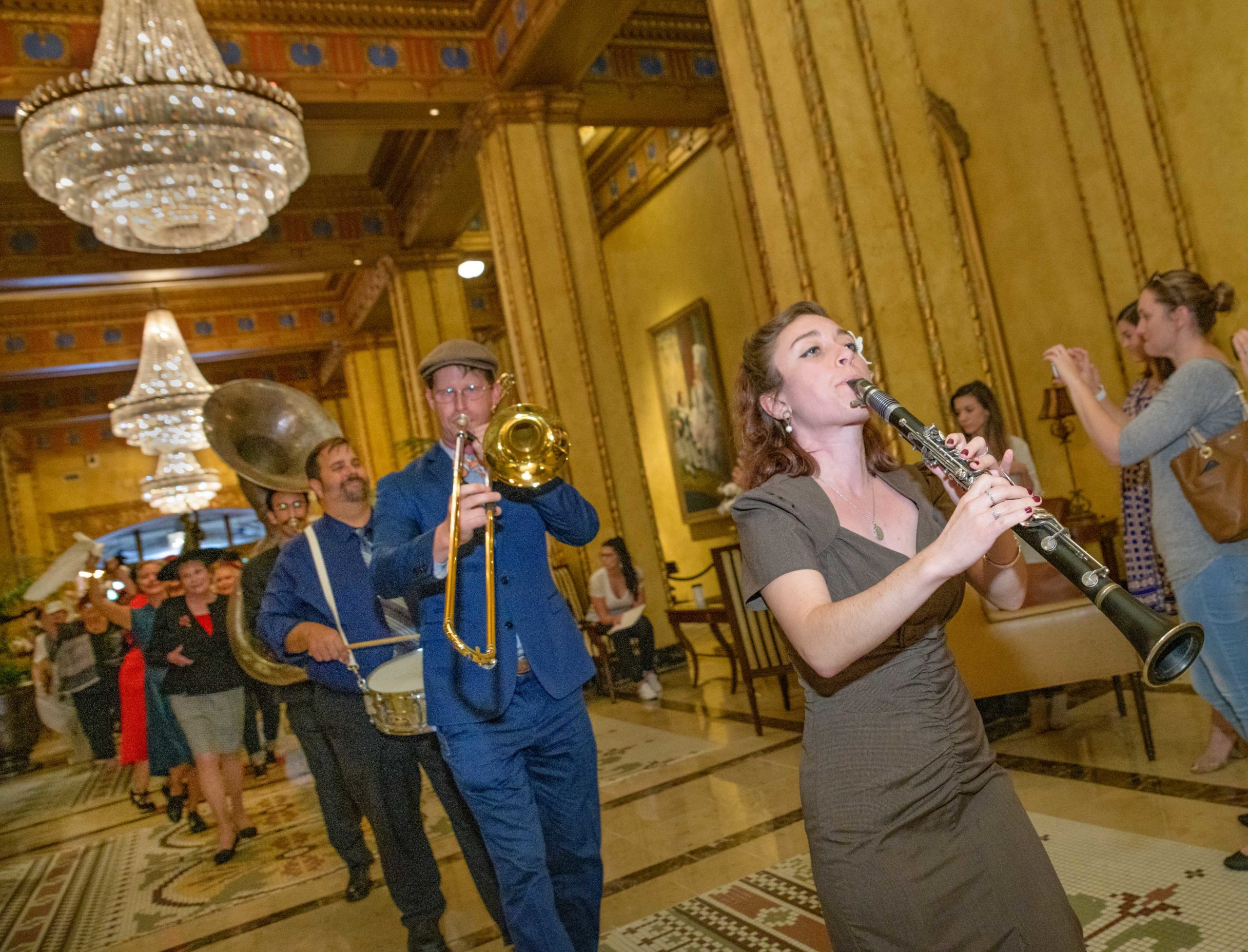 Meaghan Ryan Bonavita, the president of Dress for Success New Orleans that provides women in need with clothing for jobs, leads a second line to commemorate the 70th anniversary of the Stormin of the Sazerac bar at the Roosevelt Hotel in New Orleans, September 20, 2019. The Sazerac bar excluded women except on Mardi Gras until September 26, 1949 when women stormed the bar. The event was celebrated first with a luncheon and fashion show at the Blue Room before the group of women second lined to the Sazerac bar with music by the Twisty River Band. WDSU anchor Charles Divins hosted and WDSU Chief Meteorologist Margaret Orr, who was the reigning Spirit of the Sazerac, announced this years Spirit as Meaghan Ryan Bonavita. Photo by Matthew Hinton