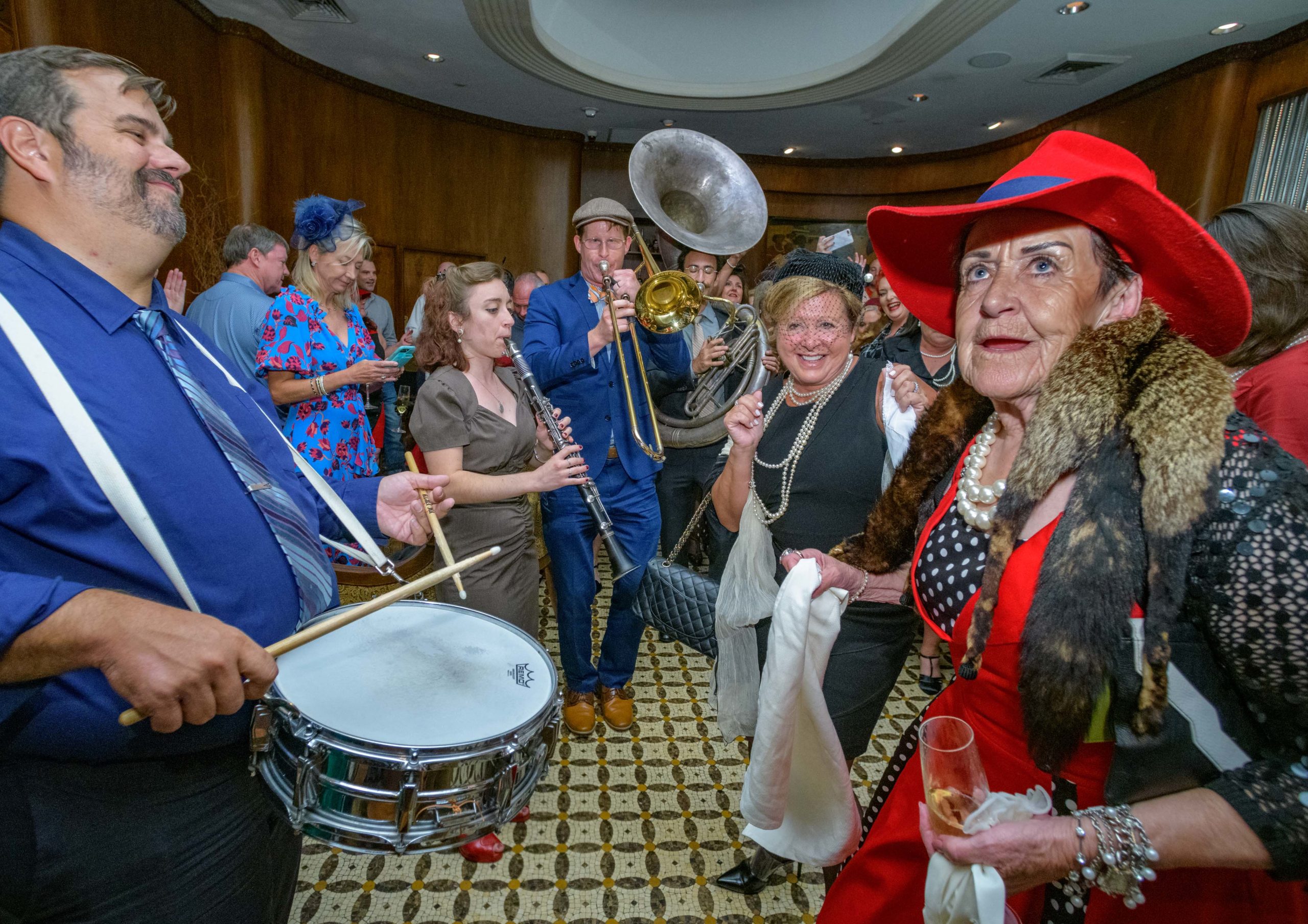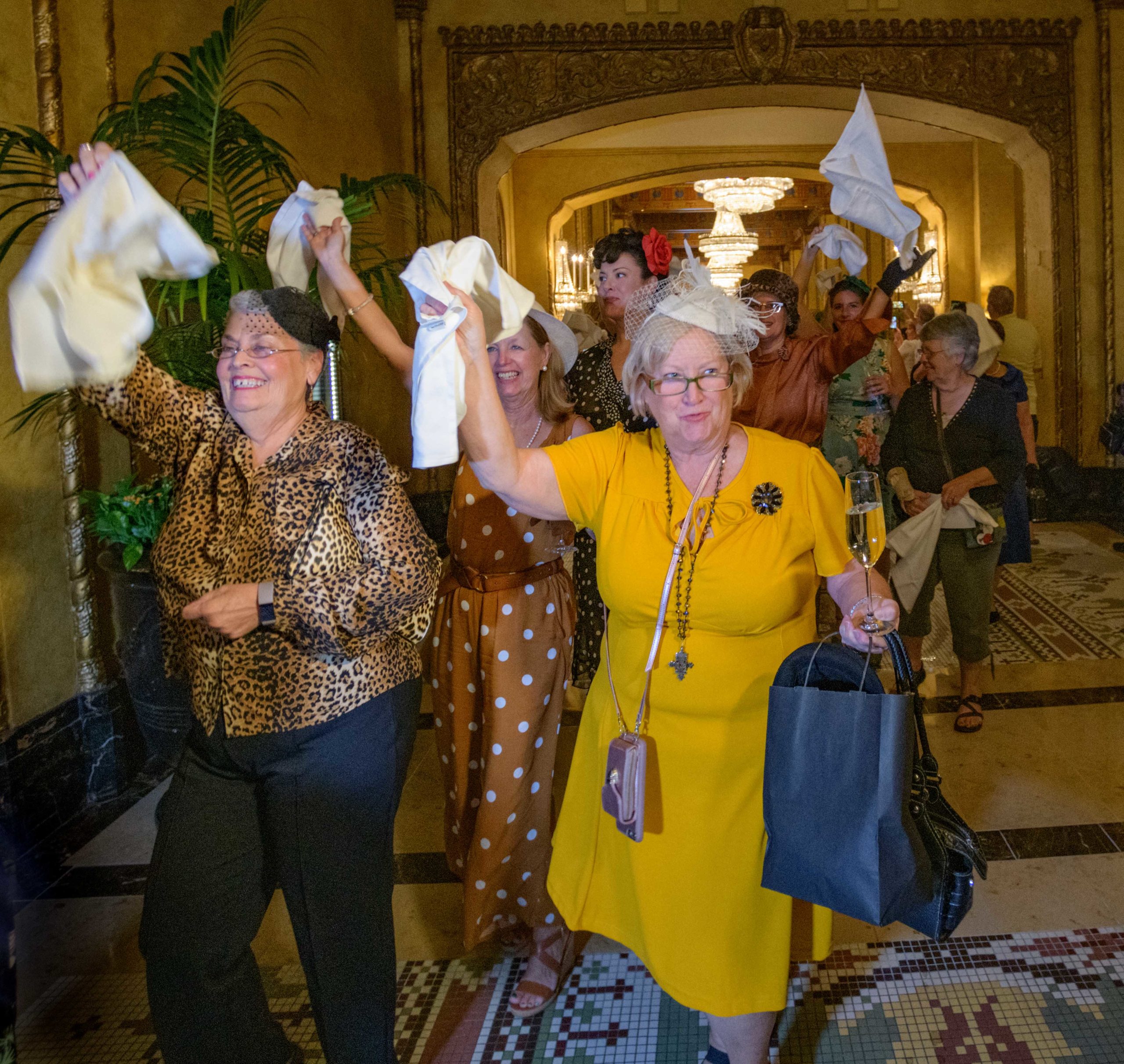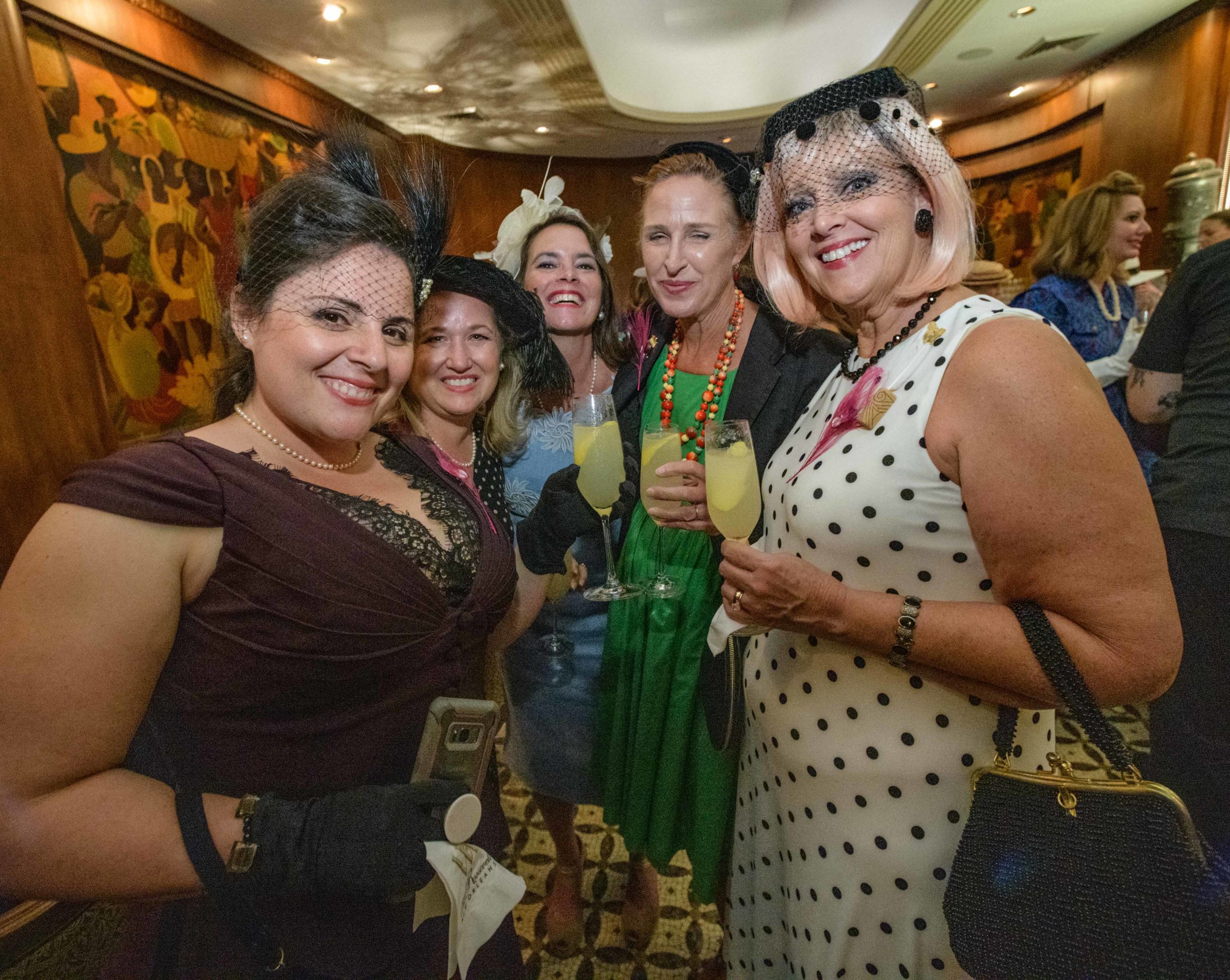 Women commemorate the 70th anniversary of the Stormin’ of the Sazerac bar at the Roosevelt Hotel in New Orleans, September 20, 2019. The Sazerac bar excluded women except on Mardi Gras until September 26, 1949 when women ‘stormed the bar.’ The event was celebrated first with a luncheon and fashion show at the Blue Room before the group of women second lined to the Sazerac bar with music by the Twisty River Band. WDSU anchor Charles Divins hosted and WDSU Chief Meteorologist Margaret Orr, who was the reigning Spirit of the Sazerac, announced this year’s Spirit as Meaghan Ryan Bonavita, the president of Dress for Success New Orleans that provides women in need with clothing for jobs. Photo by Matthew Hinton