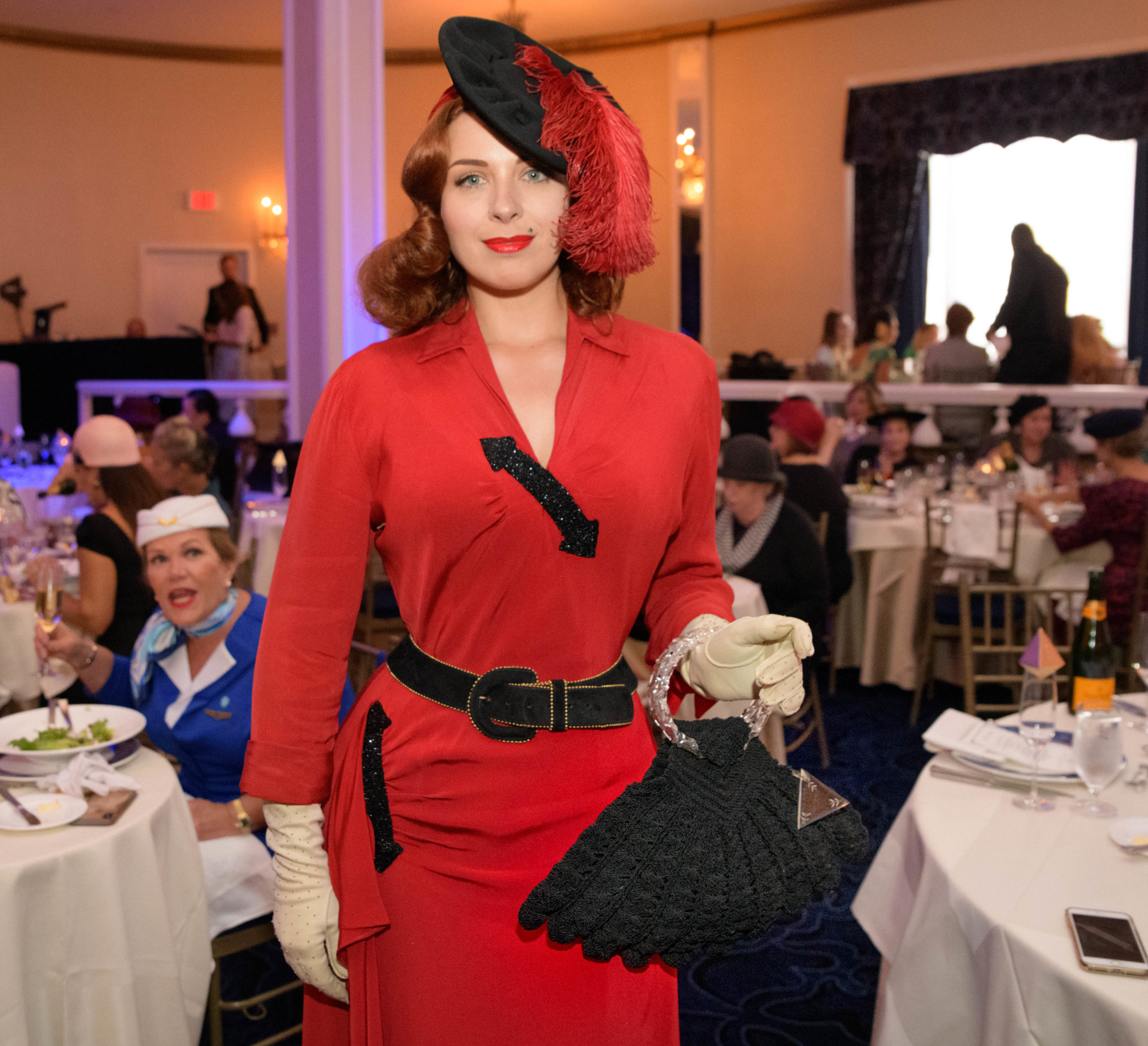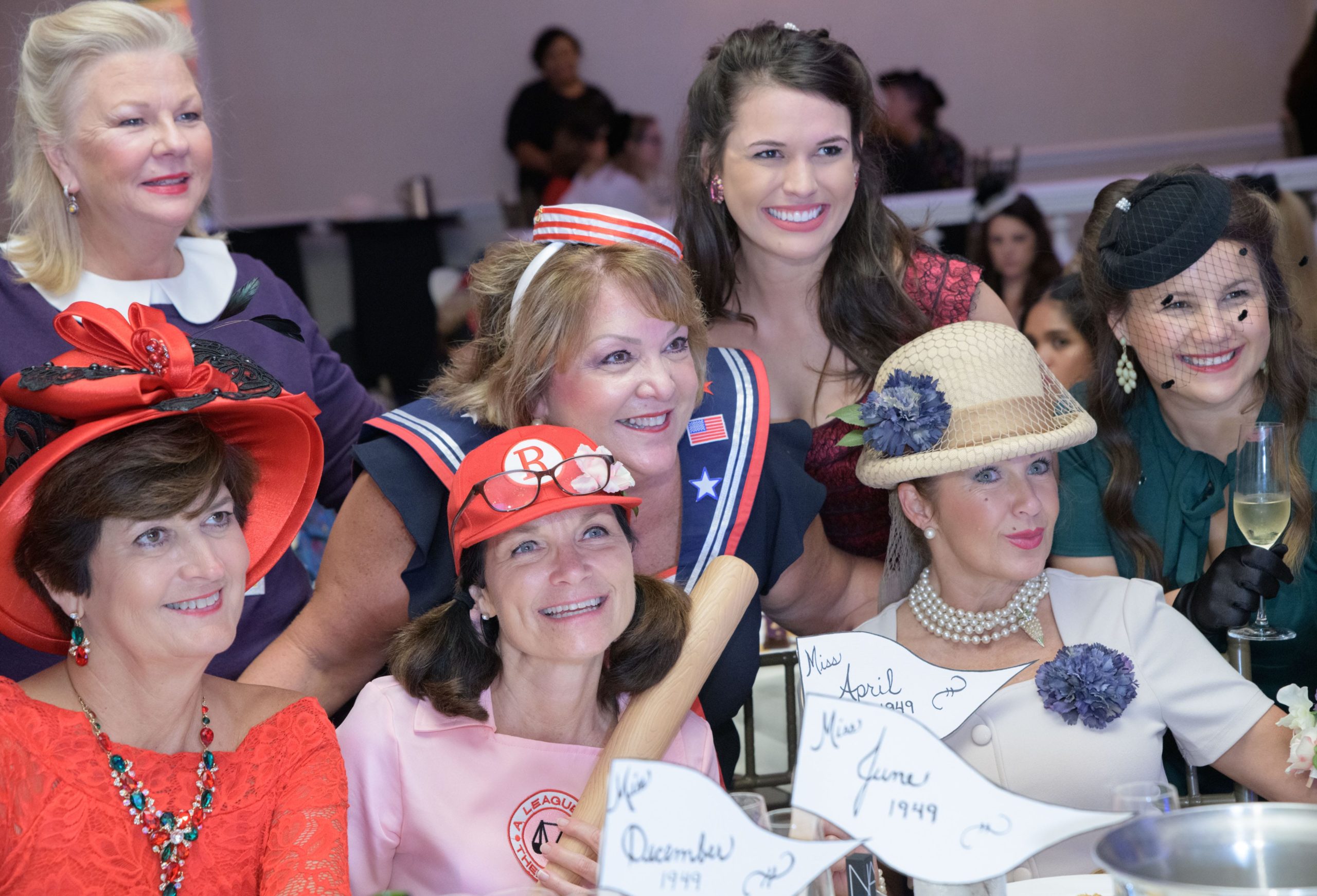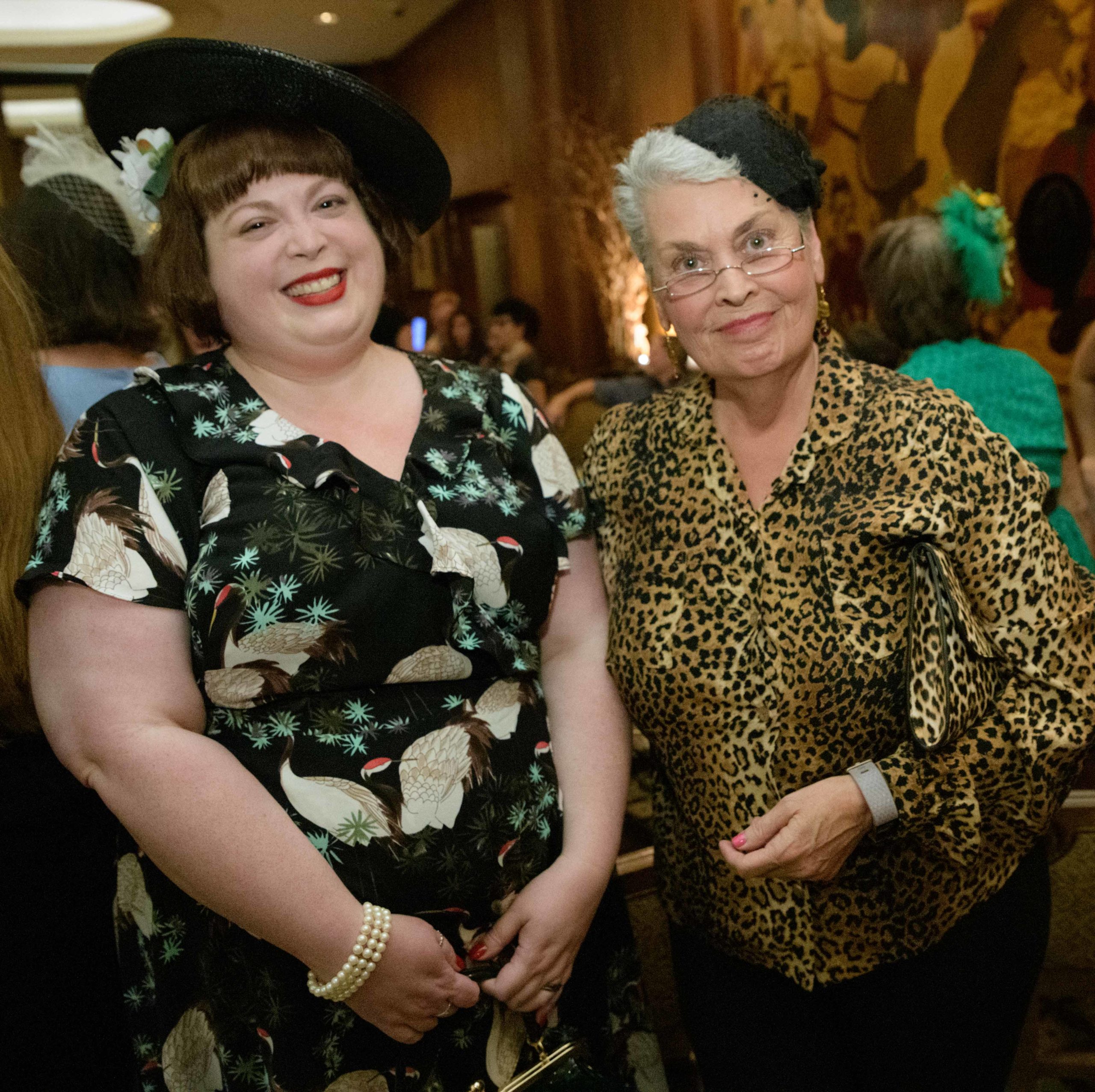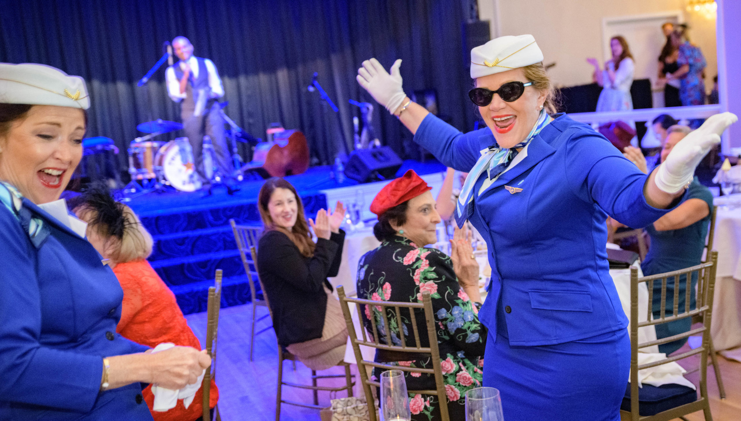 Dress as Pan-Am airlines stewardesses from the 1940s, Kathi Merey, left, and Farin Fabre, react as they are named the winners of the costume contest during the 70th anniversary of the Stormin of the Sazerac bar at the Roosevelt Hotel in New Orleans, September 20, 2019. The Sazerac bar excluded women except on Mardi Gras until September 26, 1949 when women stormed the bar. The event was celebrated first with a luncheon and fashion show at the Blue Room before the group of women second lined to the Sazerac bar with music by the Twisty River Band. WDSU anchor Charles Divins hosted and WDSU Chief Meteorologist Margaret Orr, who was the reigning Spirit of the Sazerac, announced this years Spirit as Meaghan Ryan Bonavita, the president of Dress for Success New Orleans that provides women in need with clothing for jobs. Photo by Matthew Hinton