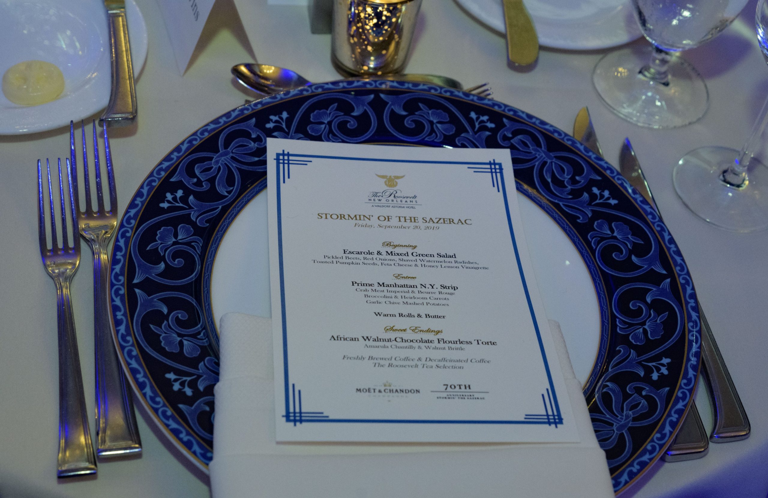 Women commemorate the 70th anniversary of the Stormin of the Sazerac bar at the Roosevelt Hotel in New Orleans, September 20, 2019. The Sazerac bar excluded women except on Mardi Gras until September 26, 1949 when women stormed the bar. The event was celebrated first with a luncheon and fashion show at the Blue Room before the group of women second lined to the Sazerac bar with music by the Twisty River Band. WDSU anchor Charles Divins, left, hosted and WDSU Chief Meteorologist Margaret Orr, right, who was the reigning Spirit of the Sazerac, announced this years Spirit as Meaghan Ryan Bonavita, the president of Dress for Success New Orleans that provides women in need with clothing for jobs. Photo by Matthew Hinton