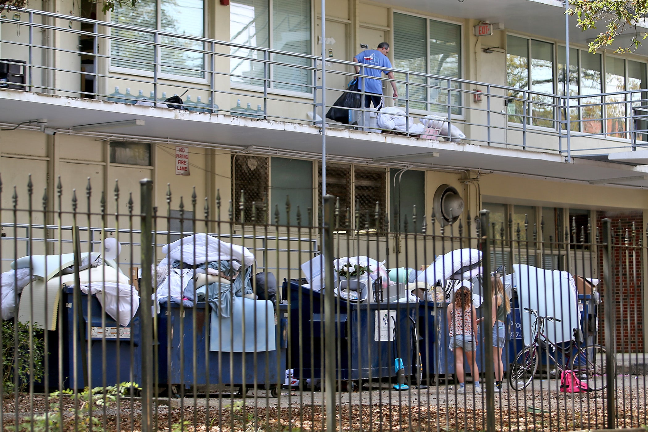 Tulane students throw trash into a dumpster and vacate the dorms amid the Covid19 pandemic which has caused the university to continue the semester online. Photographed on Friday, March 13, 2020.