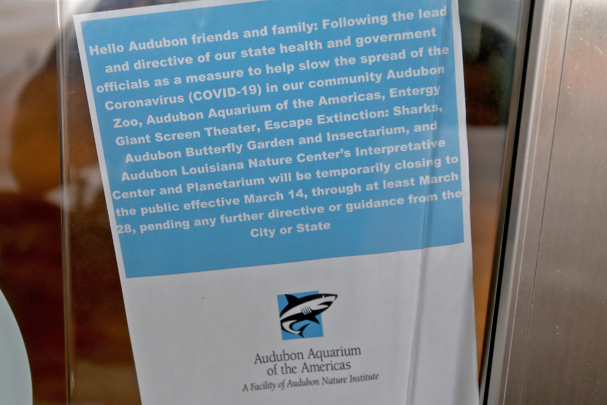 A sign in the window at the Aquarium of the Americas announces that the attractions of the Audubon Nature Institute will be closed through at least March 28th. Photographed on Sunday, March 15, 2020.
